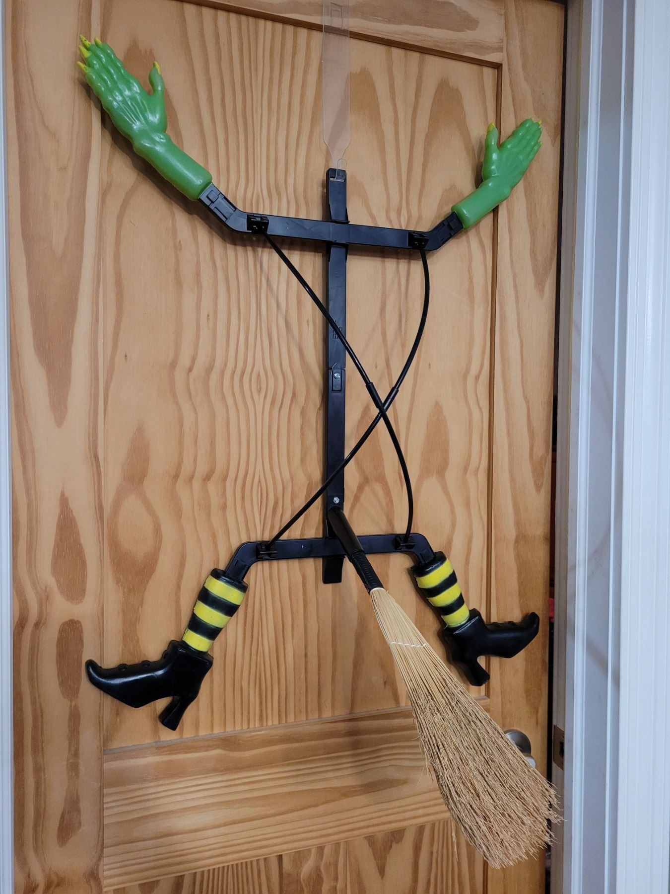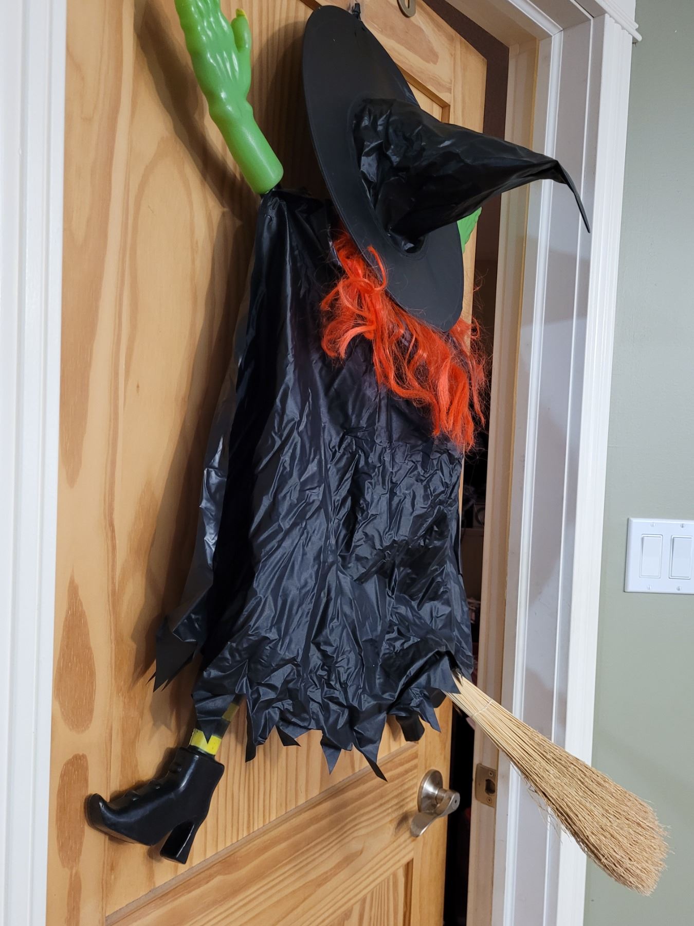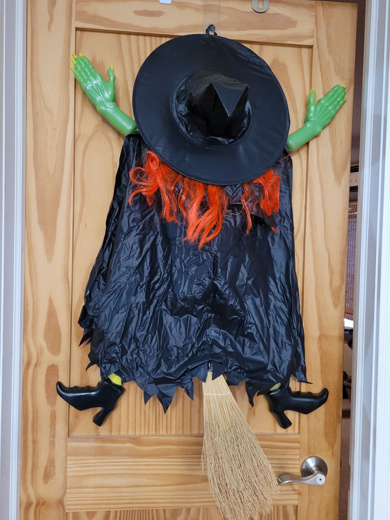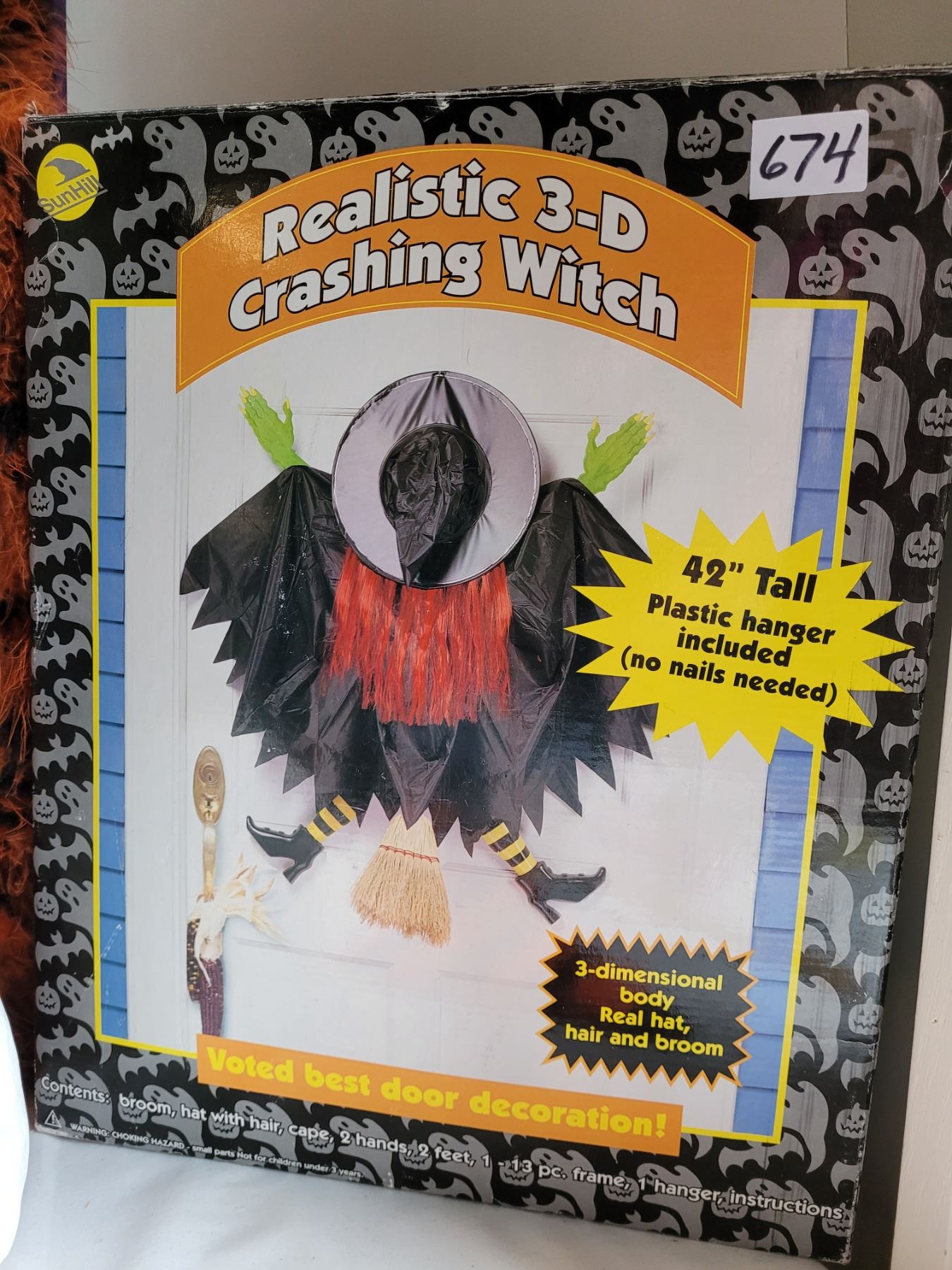 Halloween lot. Door hanger, plaster skull, hooded skeleton, crashing witch & orange hair hat.