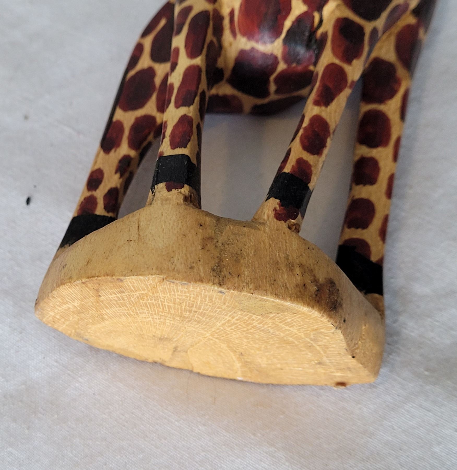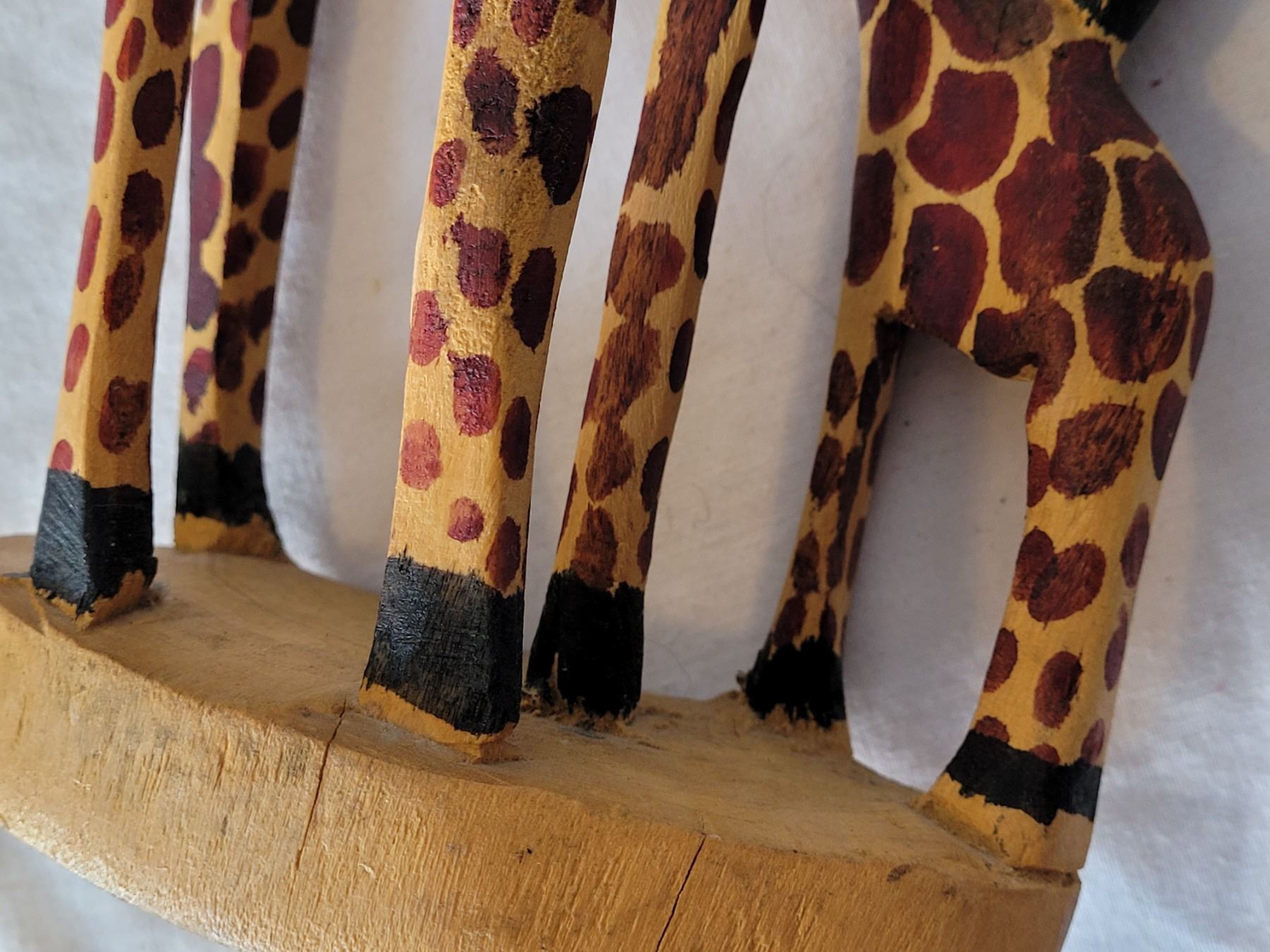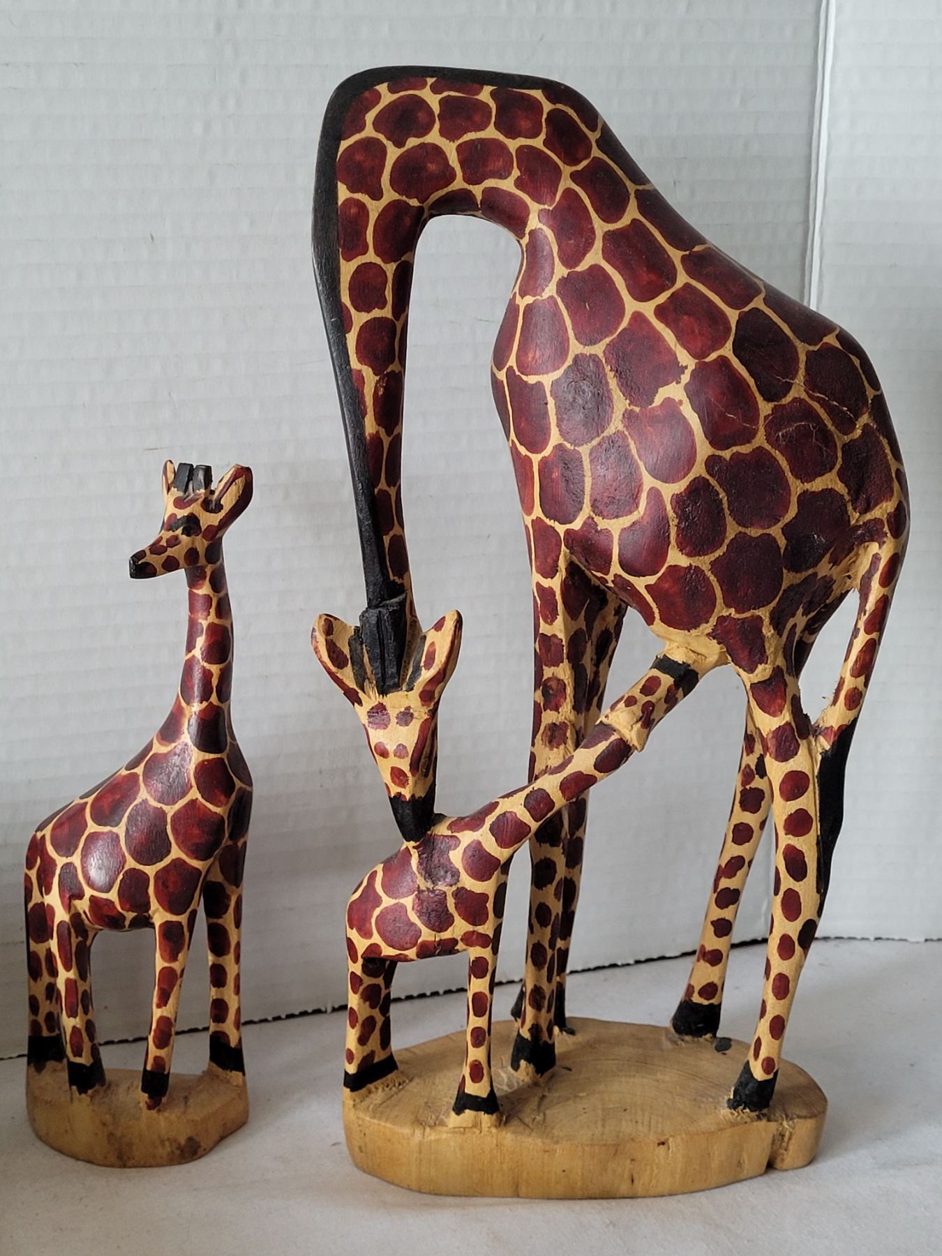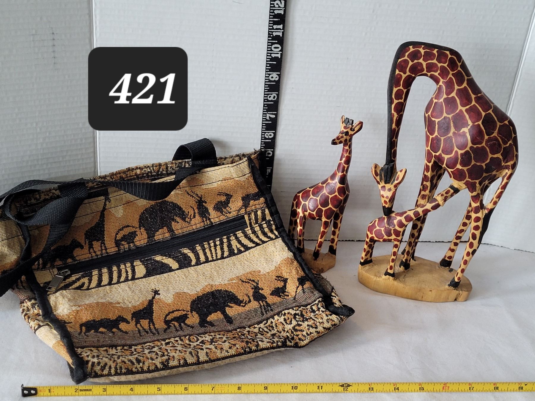 Hand carved & painted wooden Giraffe figures & african tote.