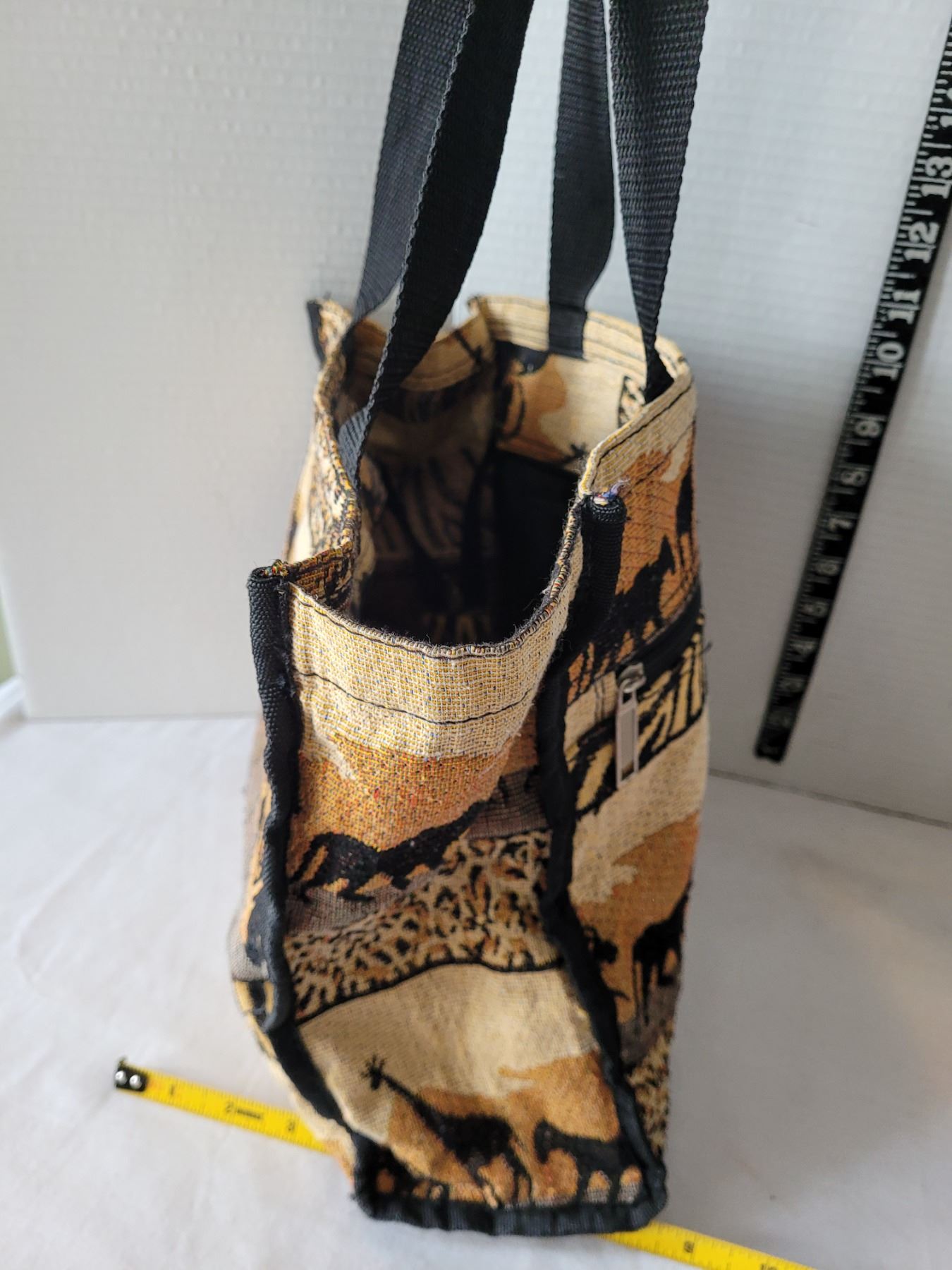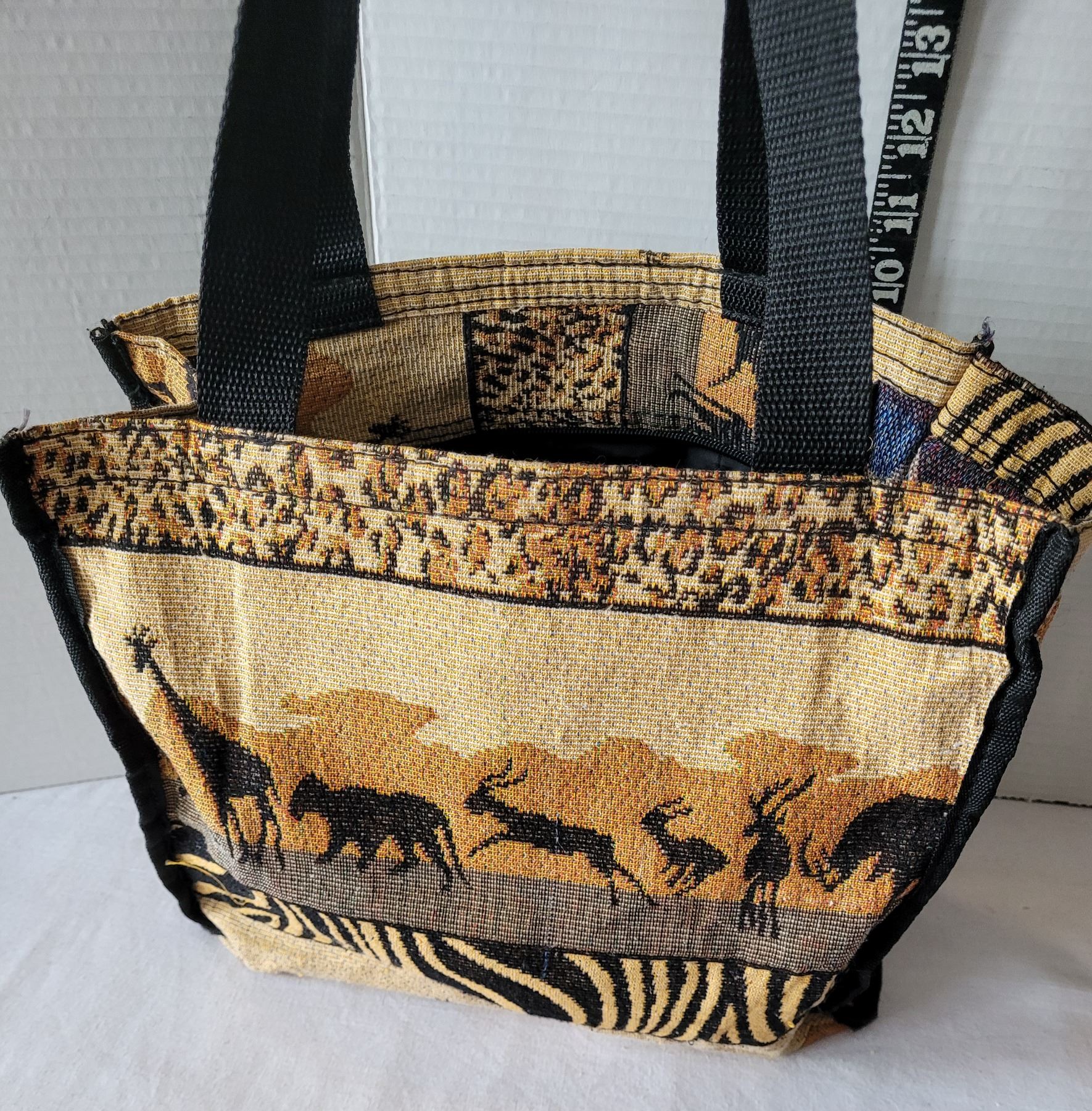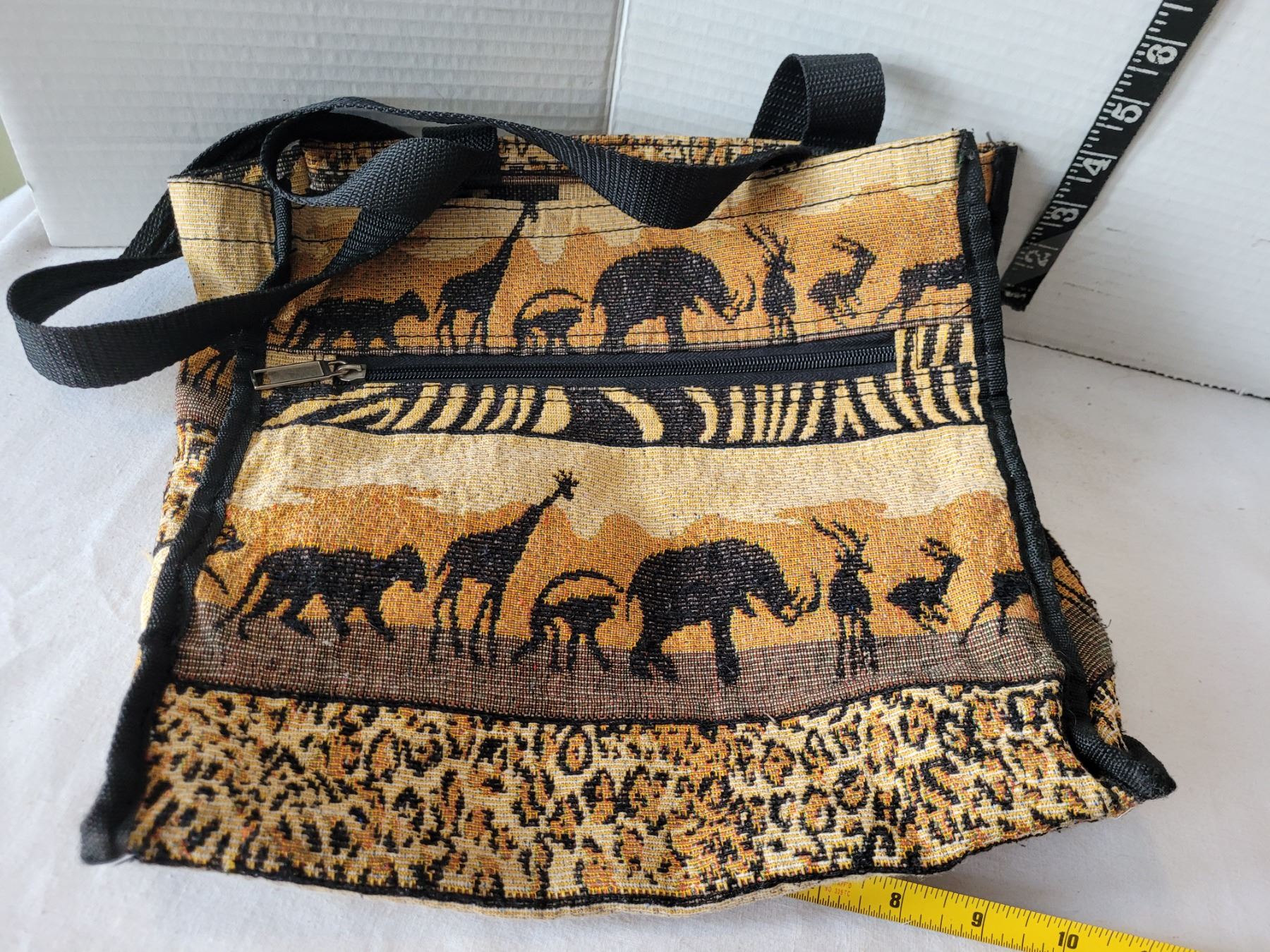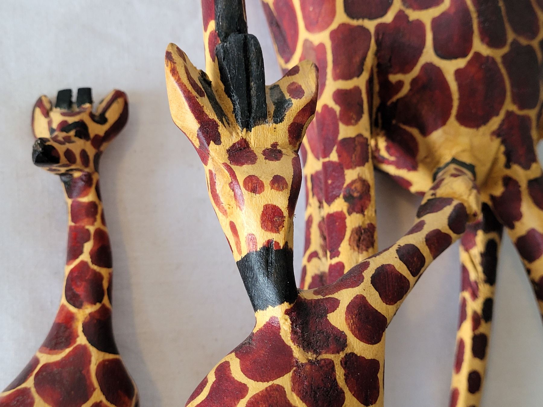 Hand carved & painted wooden Giraffe figures & african tote.