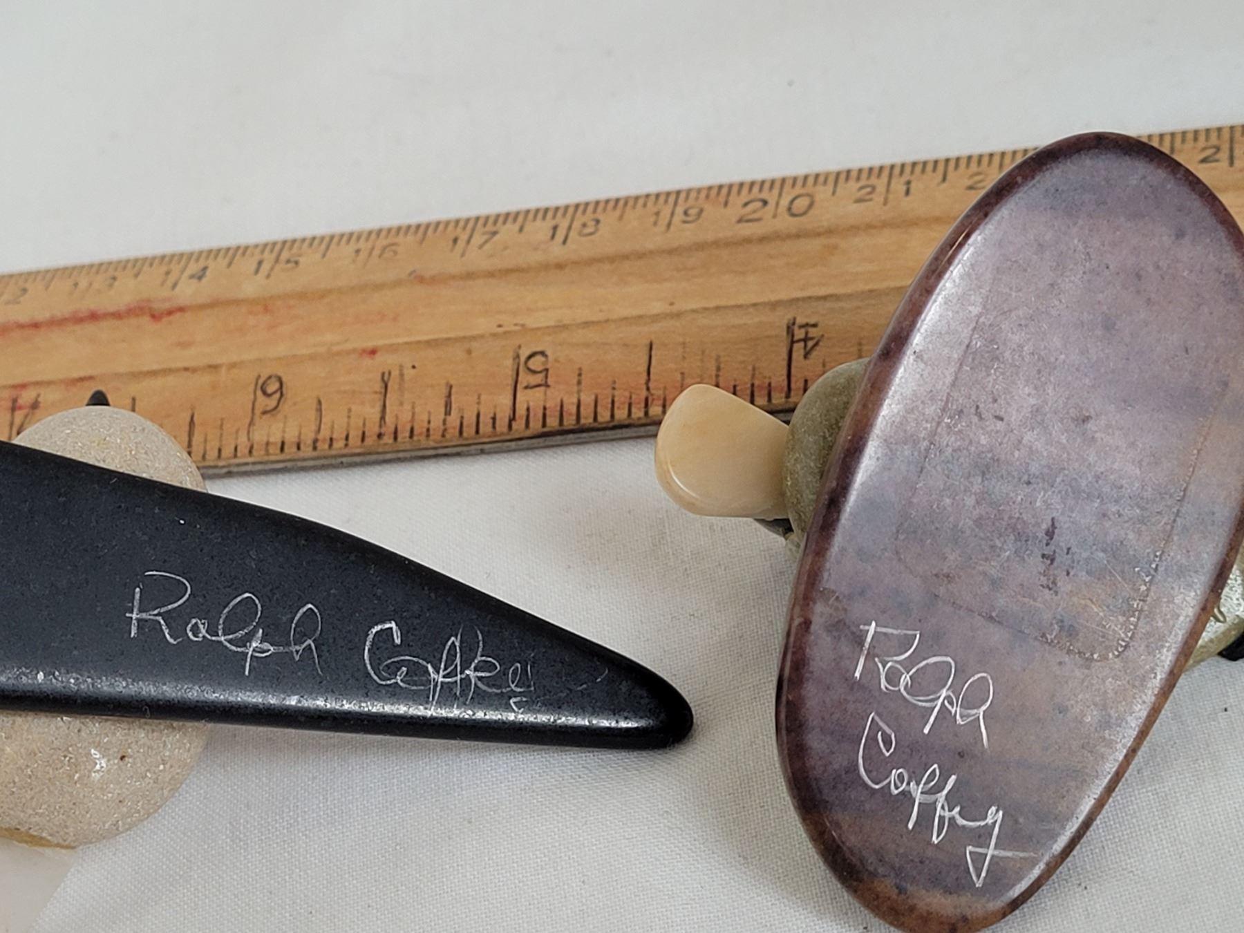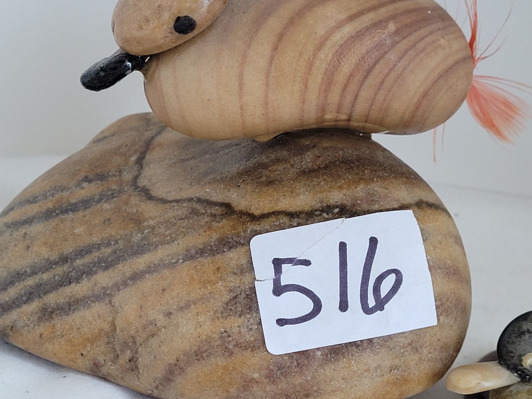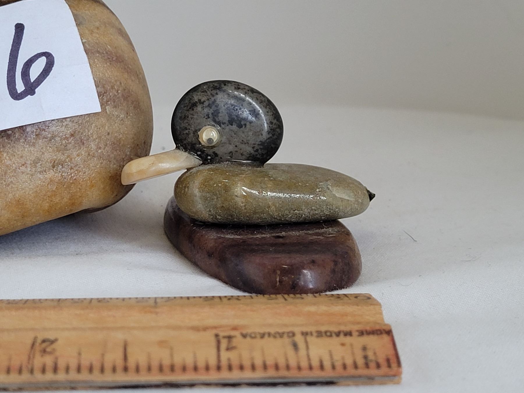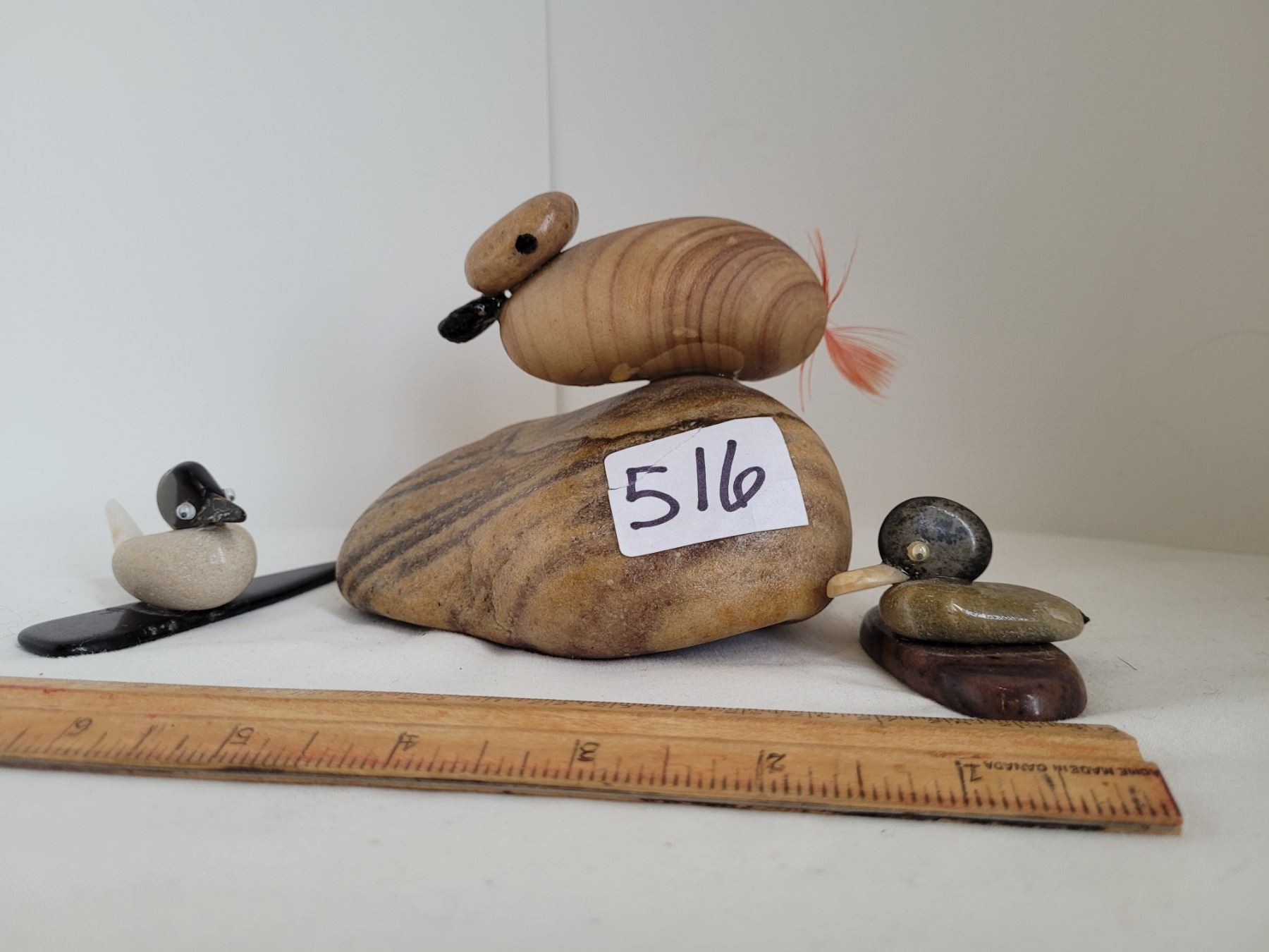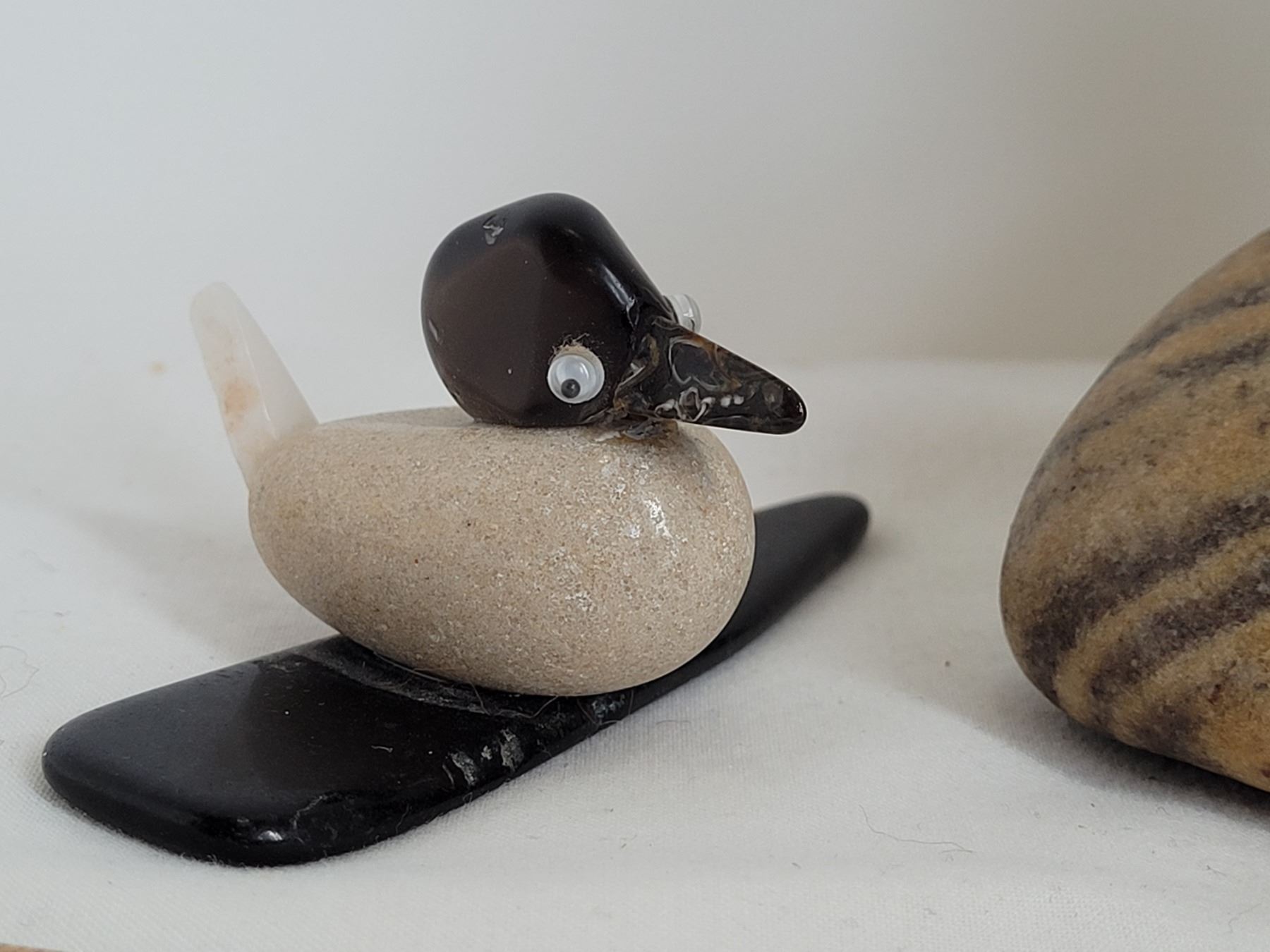 Hand crafted rock ducks. Large by Harry of Dore lake. Smalls by local artist Ralph Coffee.