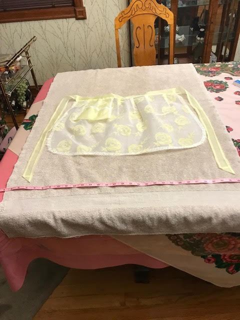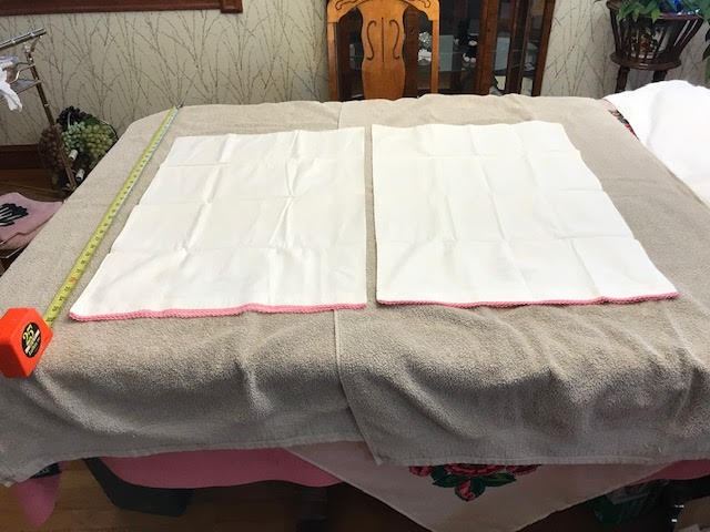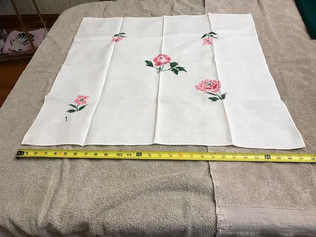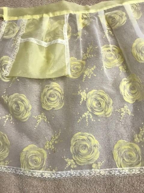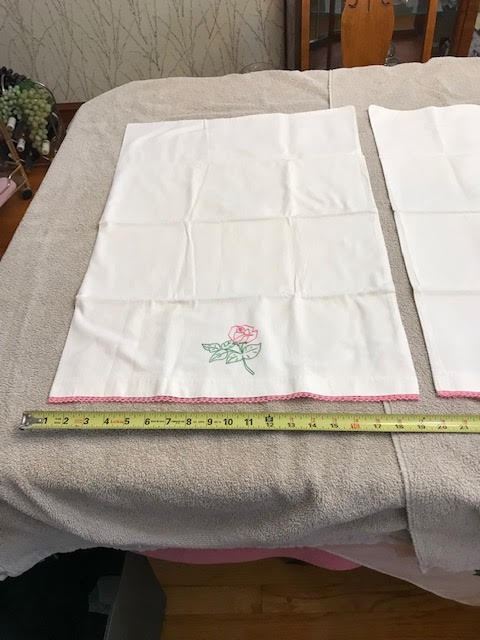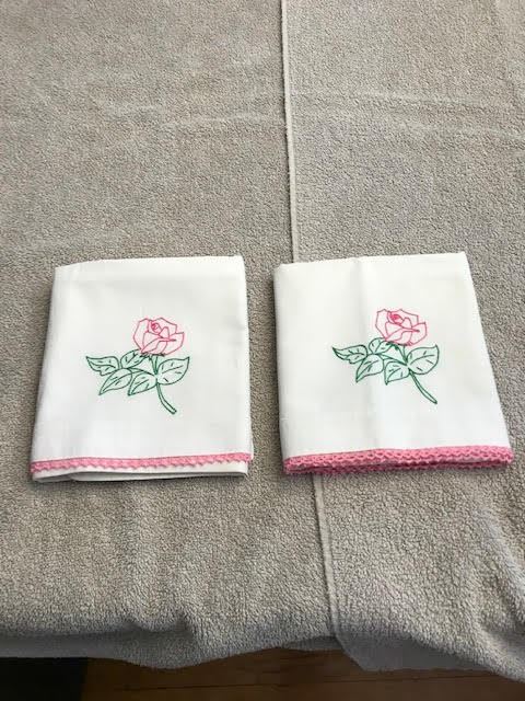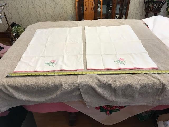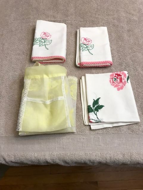 Hand embroidered items: pillowcases + small fairly good condition dresser scarf + excellent condition fancy apron with pocket.