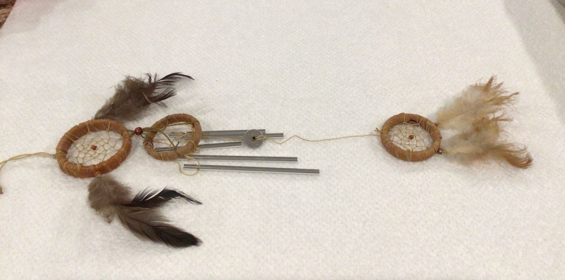 Hand made leather and feather dream catcher wind chime. 20" long