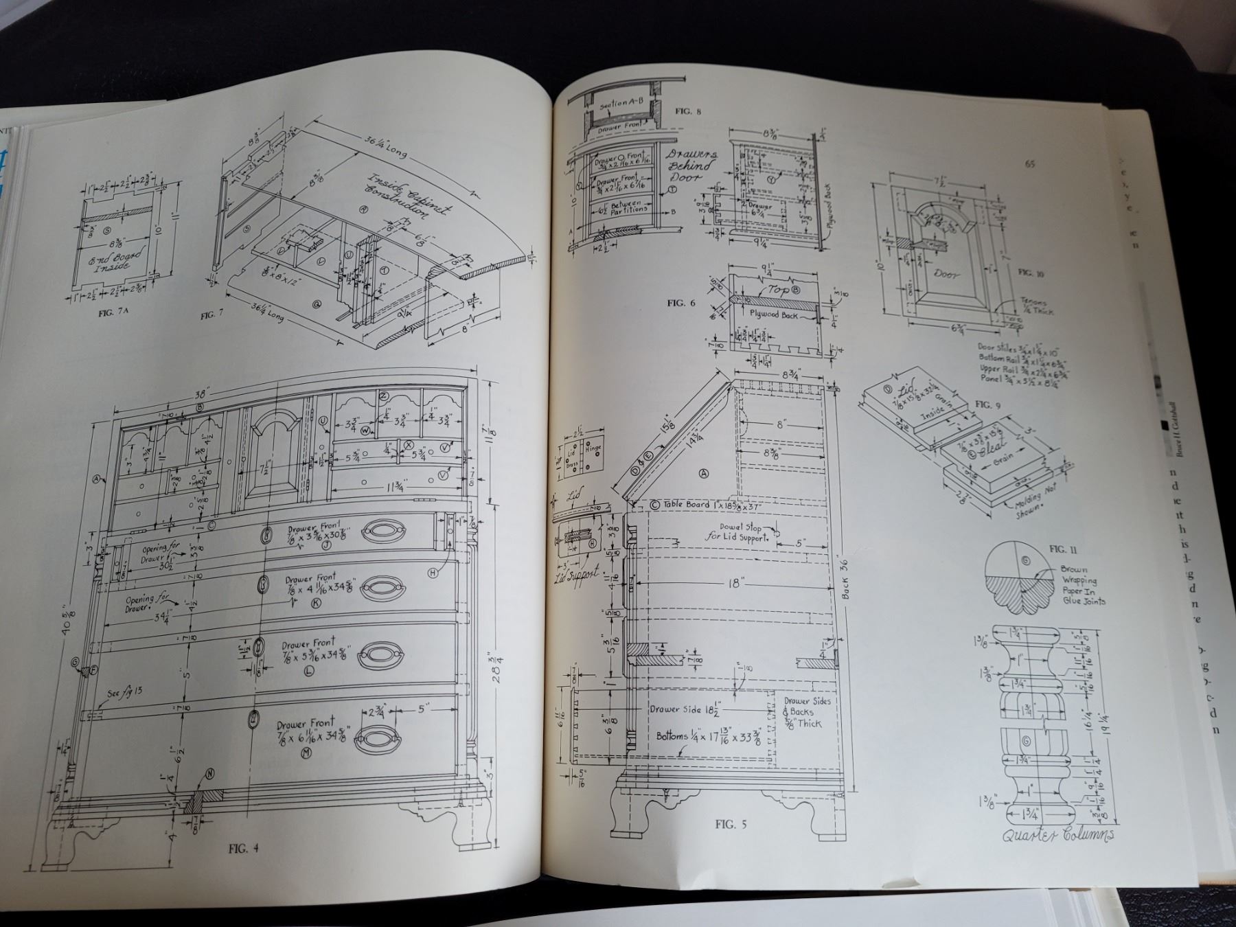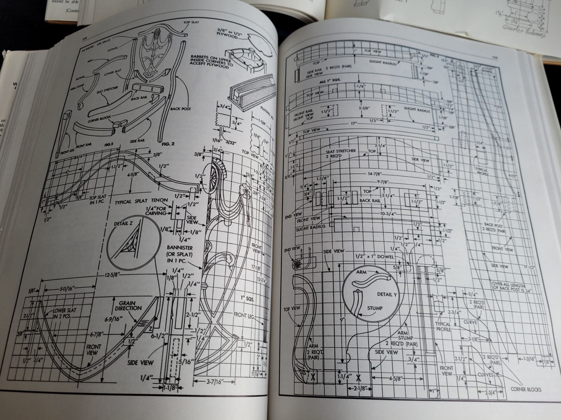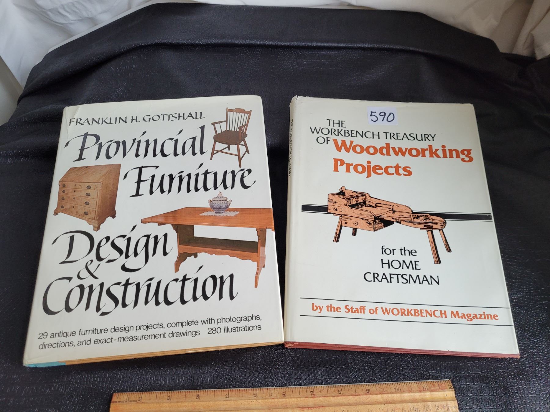 Hard covered books of furniture design, blue prints and how to's.