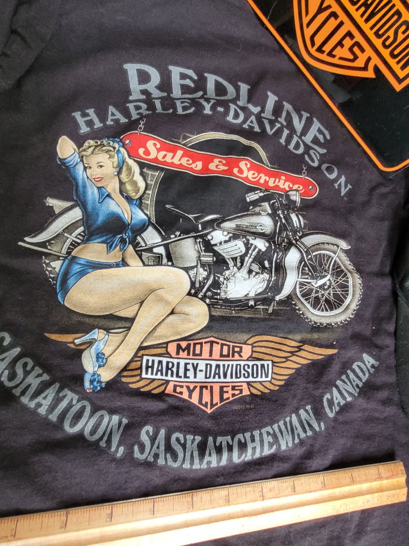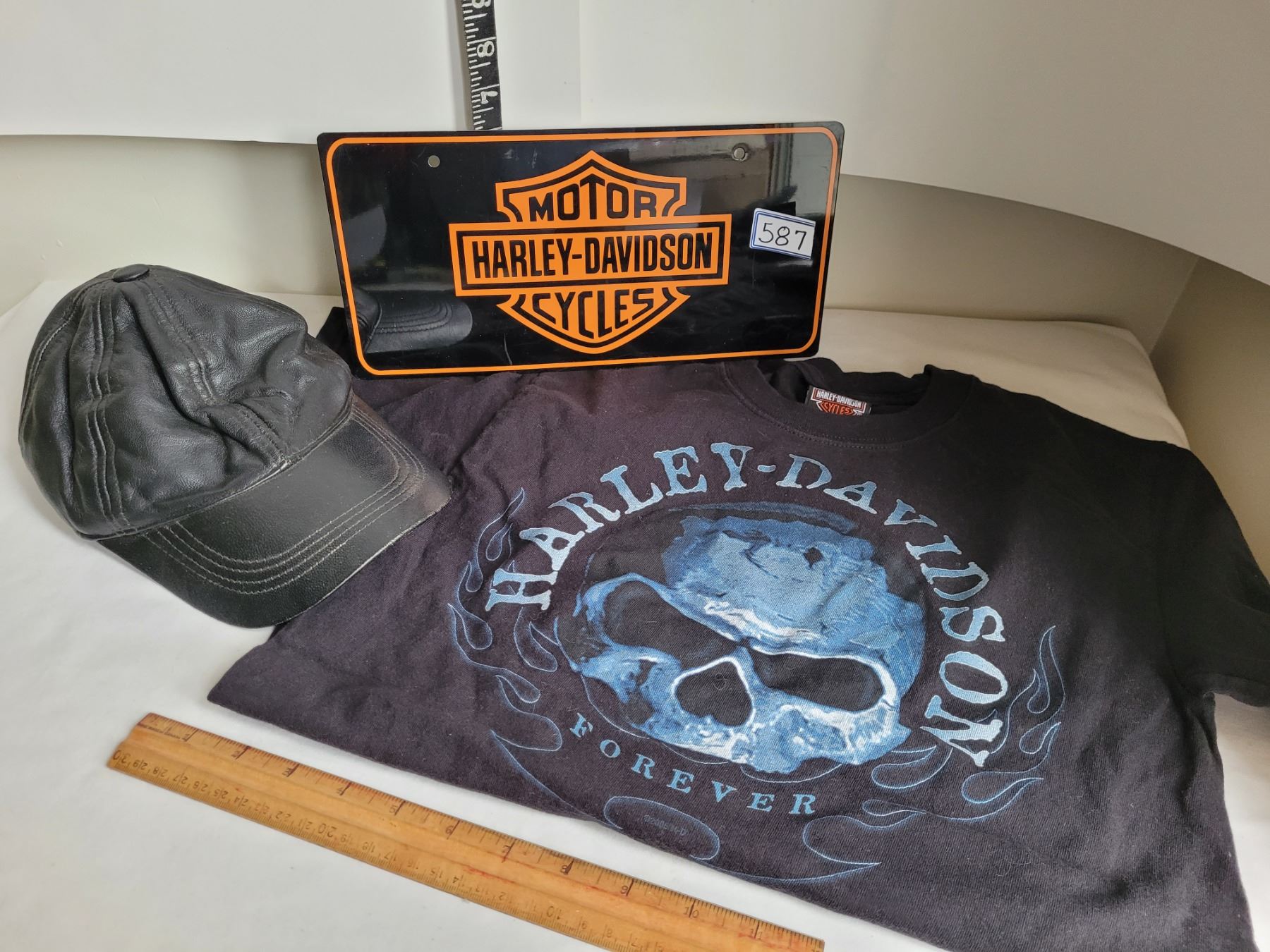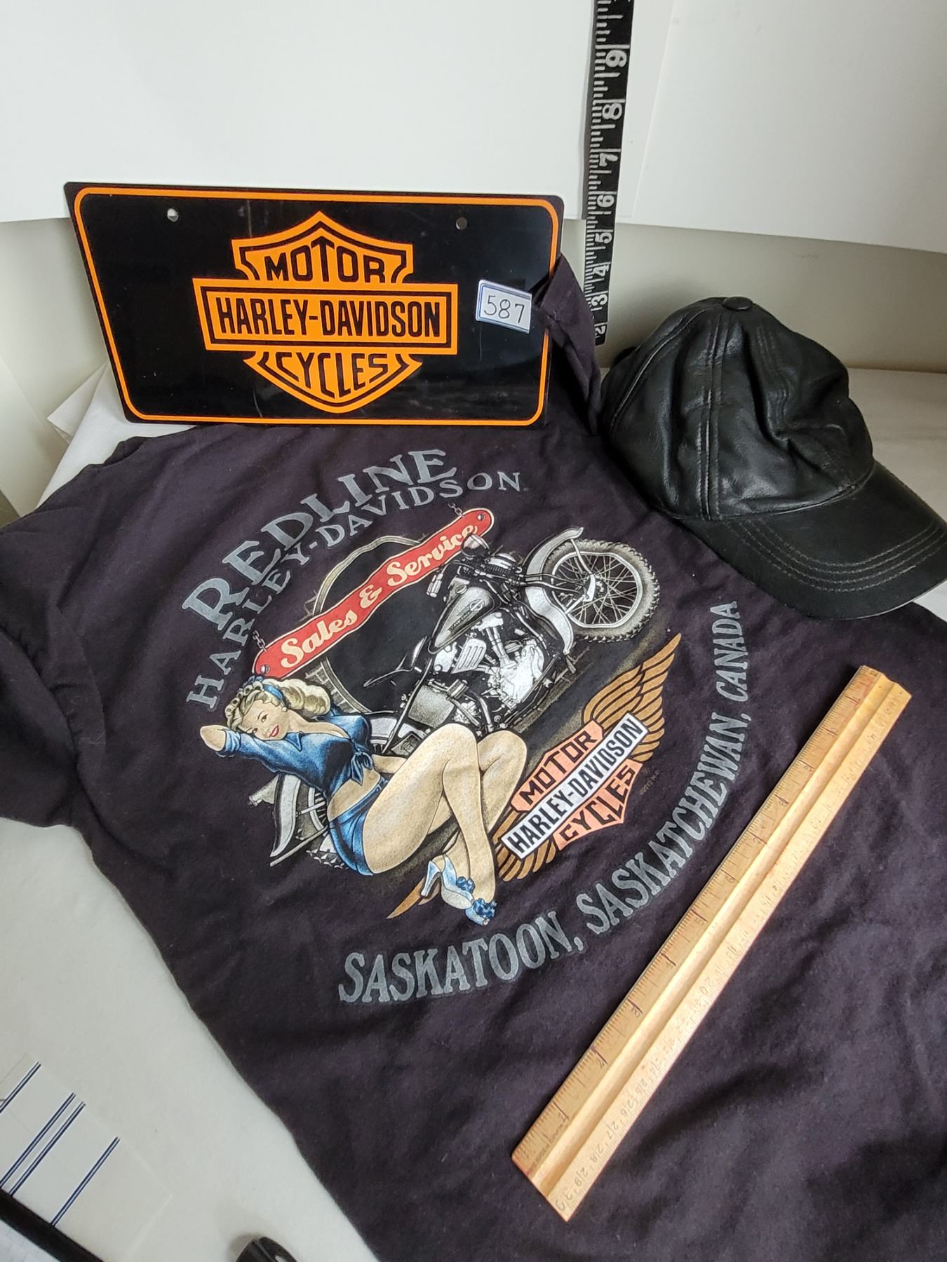 Harley Davidson License plate, small shirt & leather ball cap.