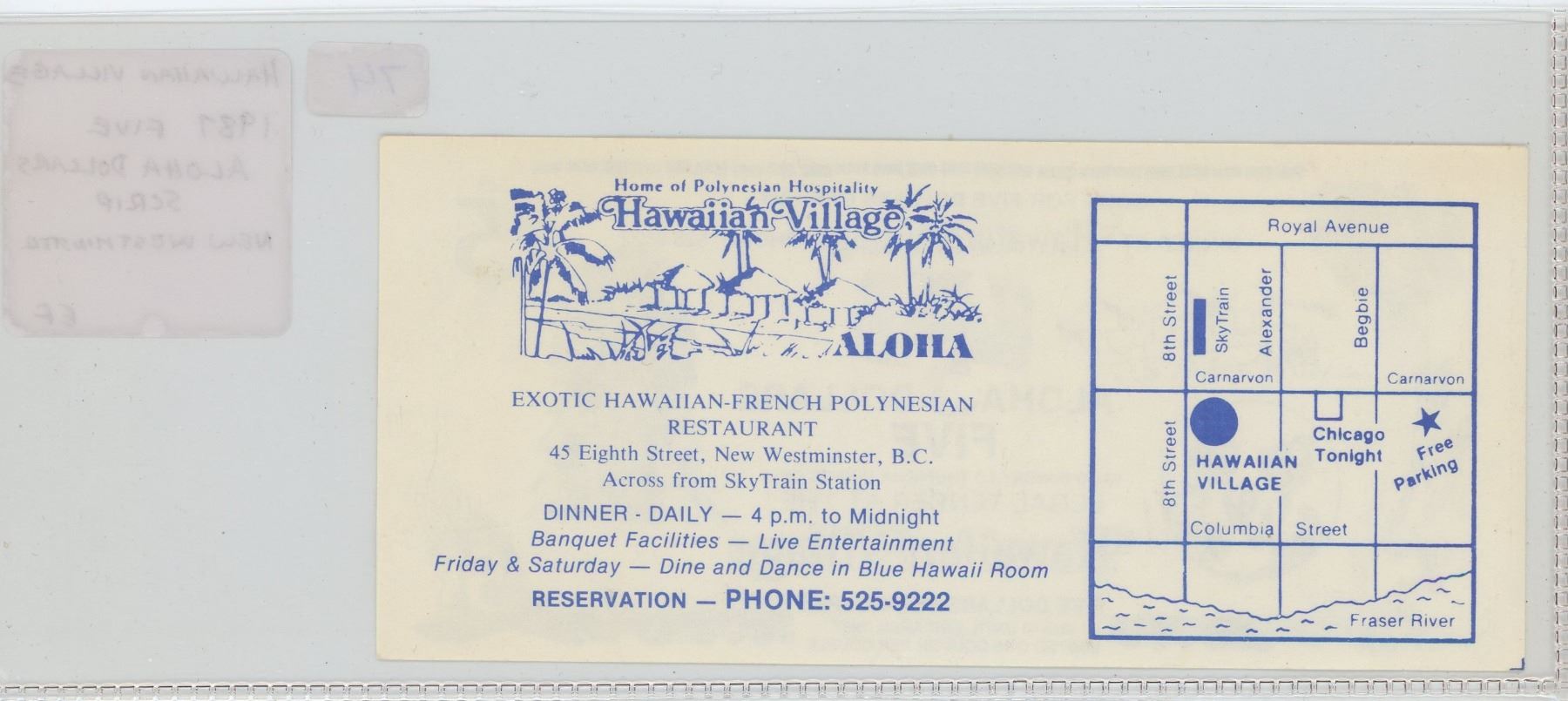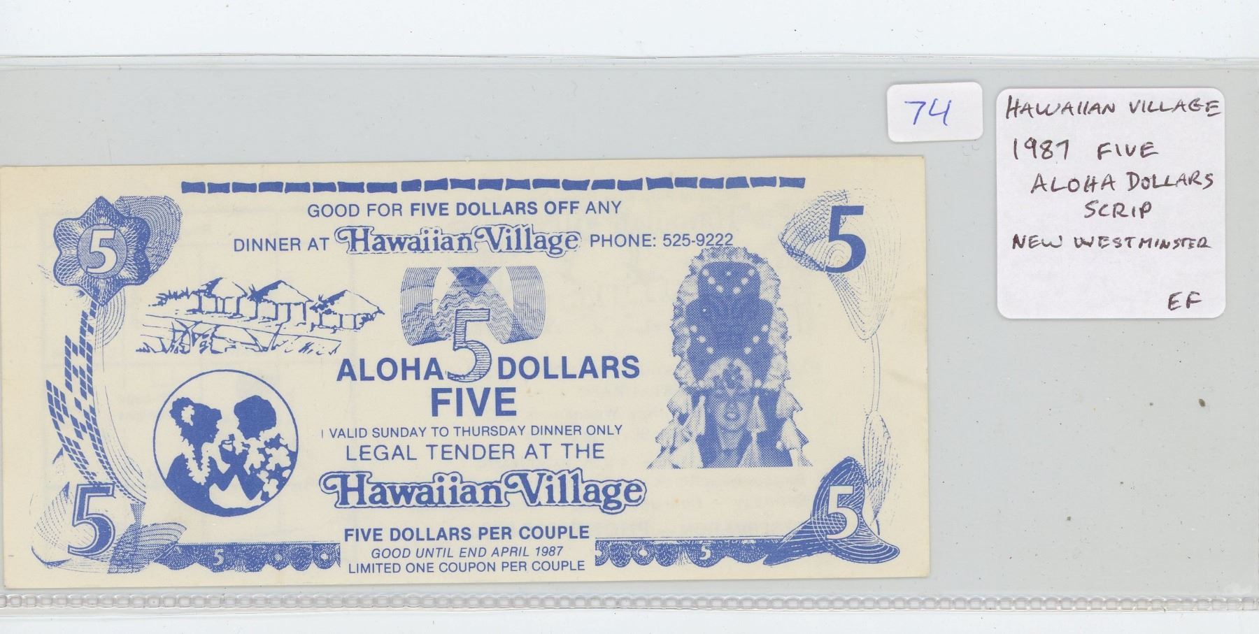 Hawaiian Village, New Westminster, BC, 1987 Five Aloha Dollars Scrip. EF.