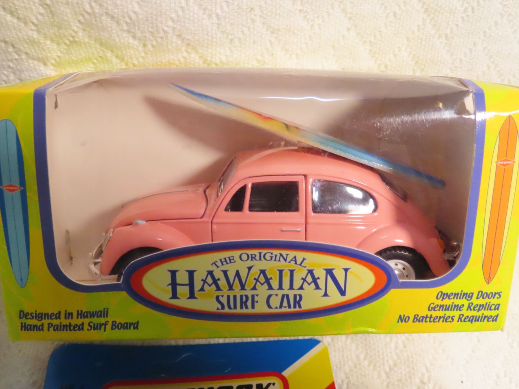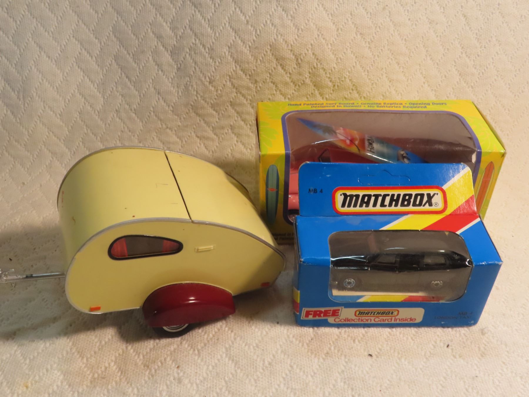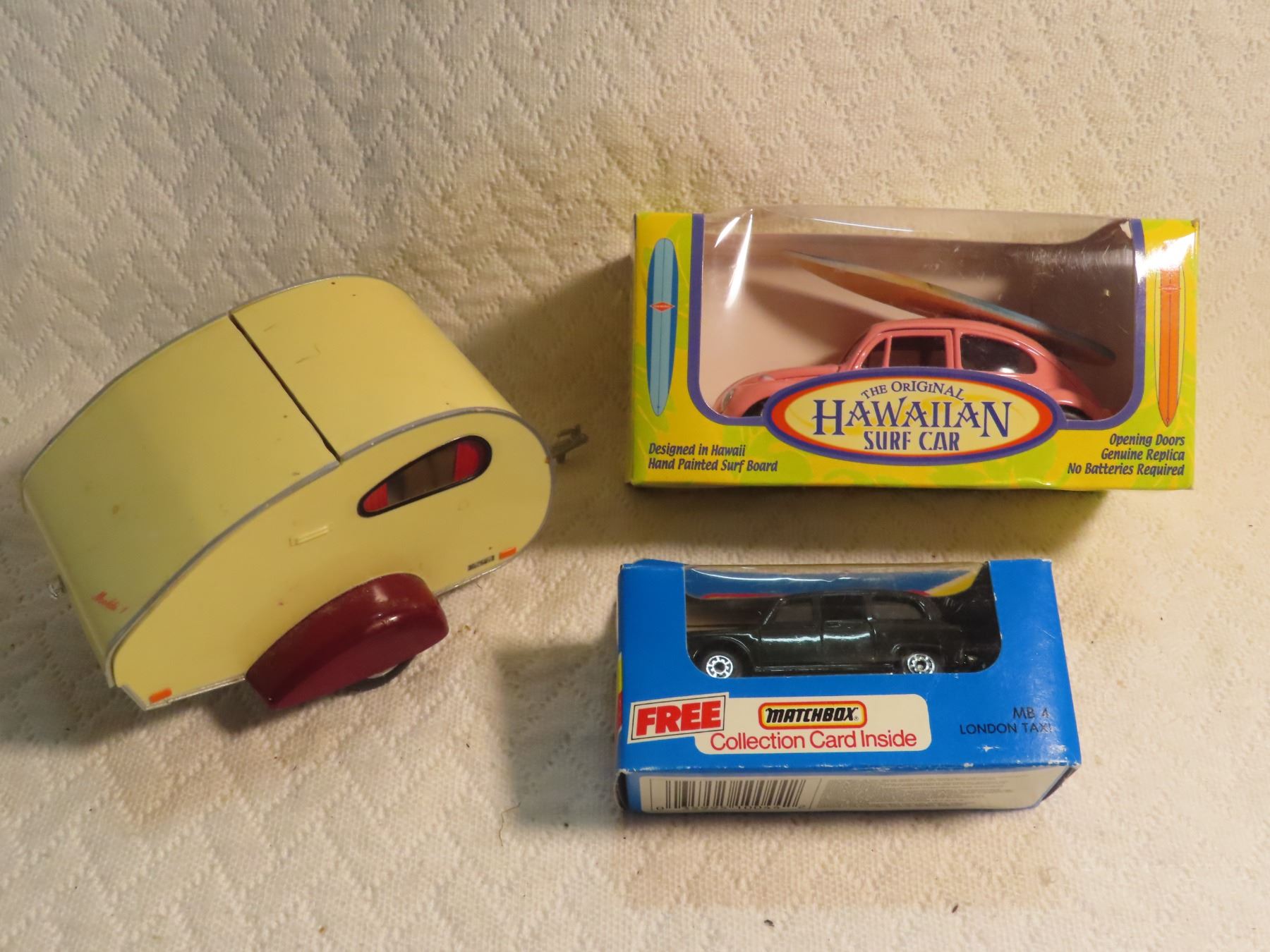 Hawaiian surf car, matchbox car, London taxi and airstream