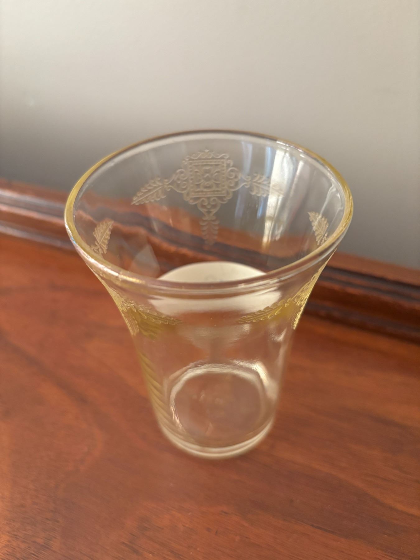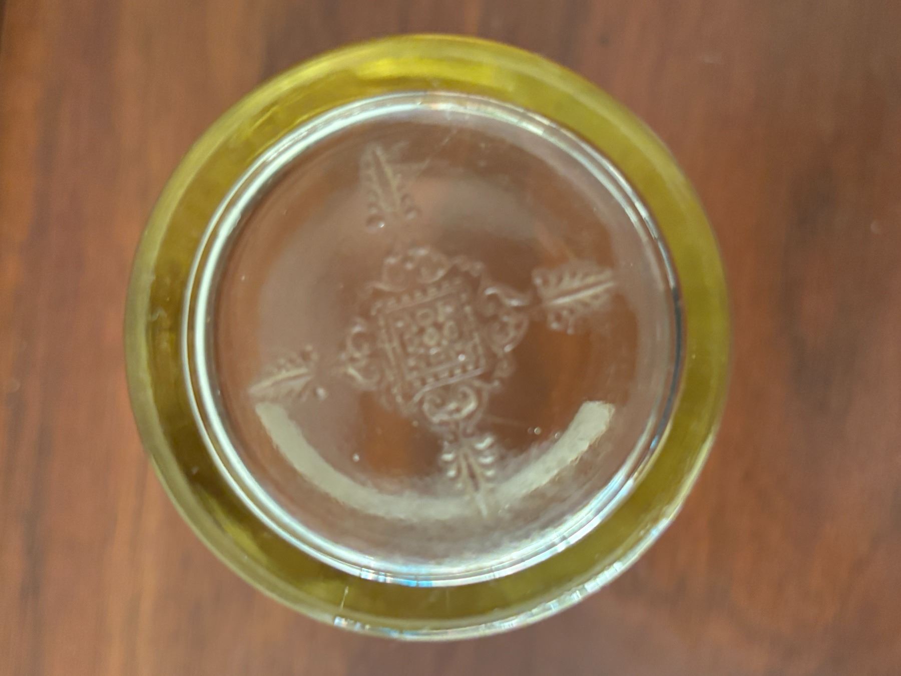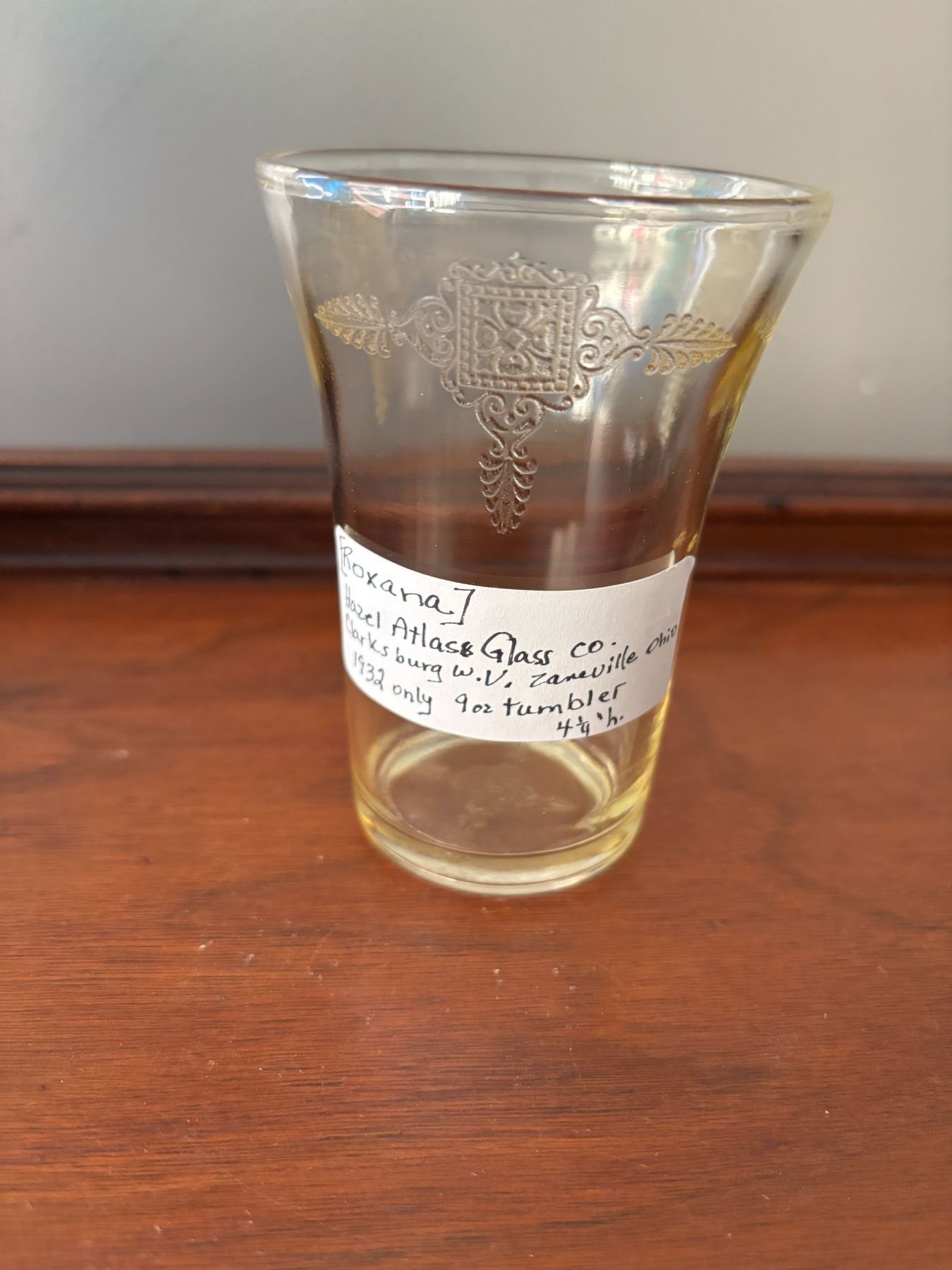 “Roxana” - Pale yellow /glows? 9oz tumbler, produced 1932 in Clarksburg, West Virginia. No chips/cracks