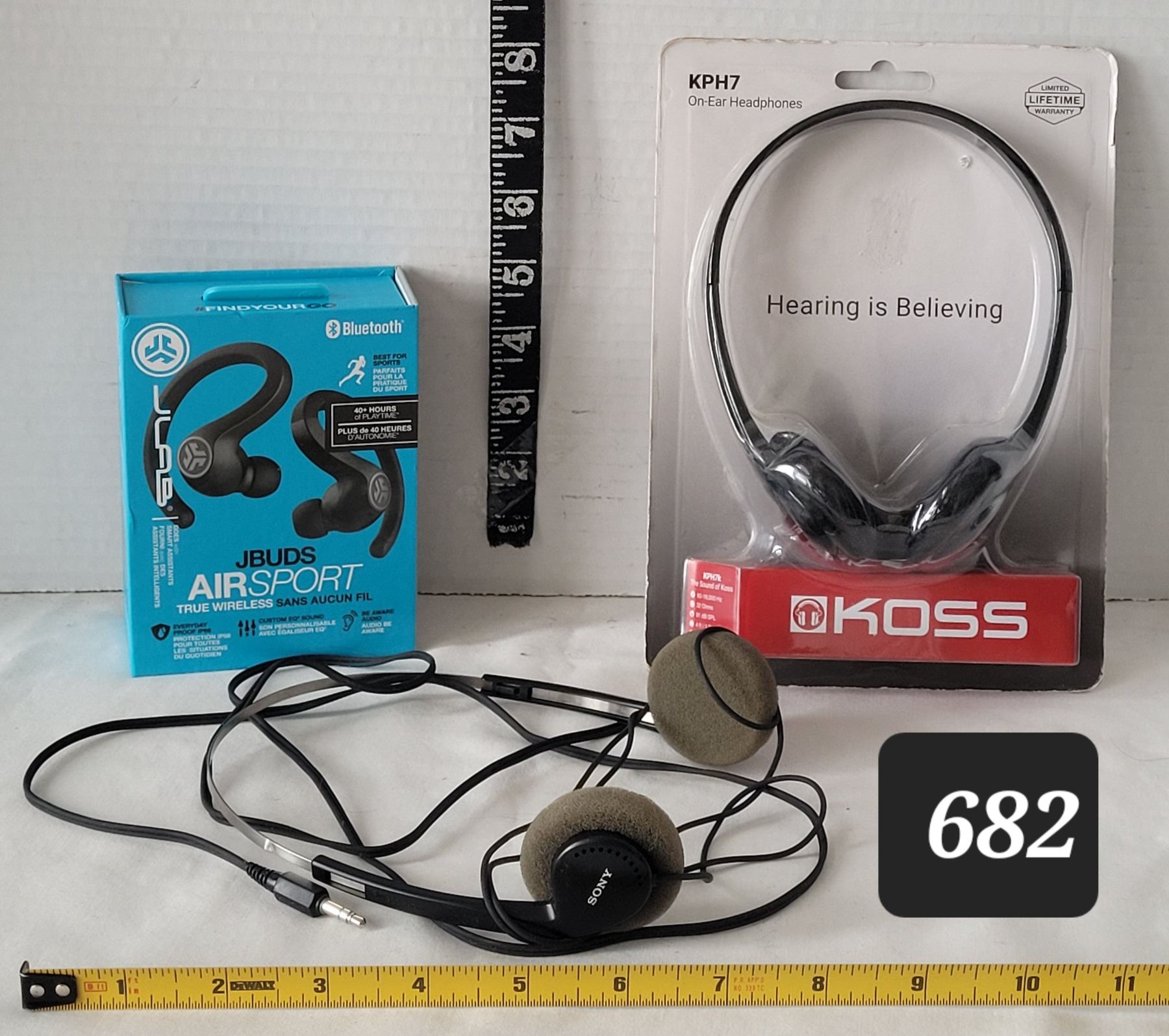 Head phones. Sony, Koss(New), AirSport Jbuds (New) wireless, Bluetooth.