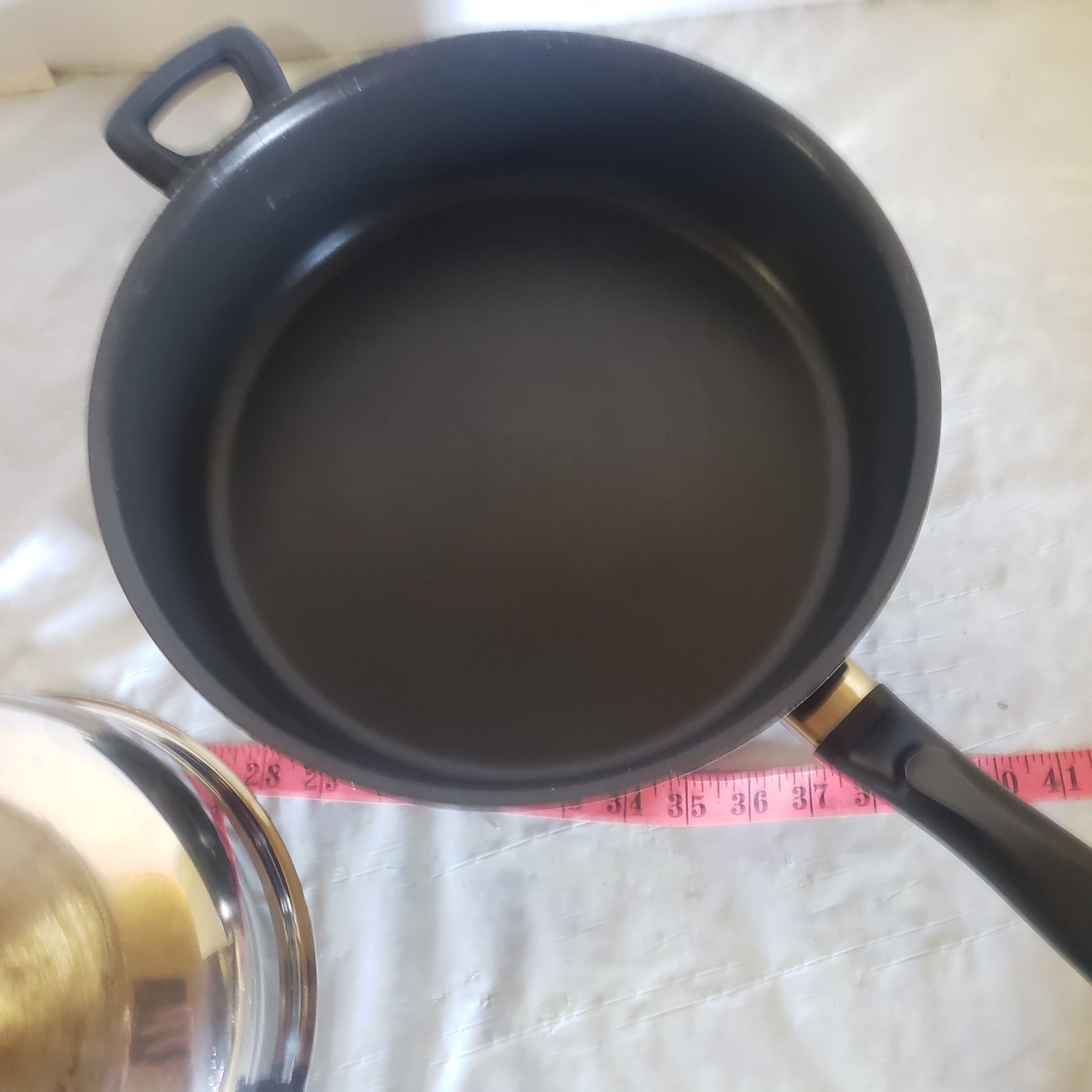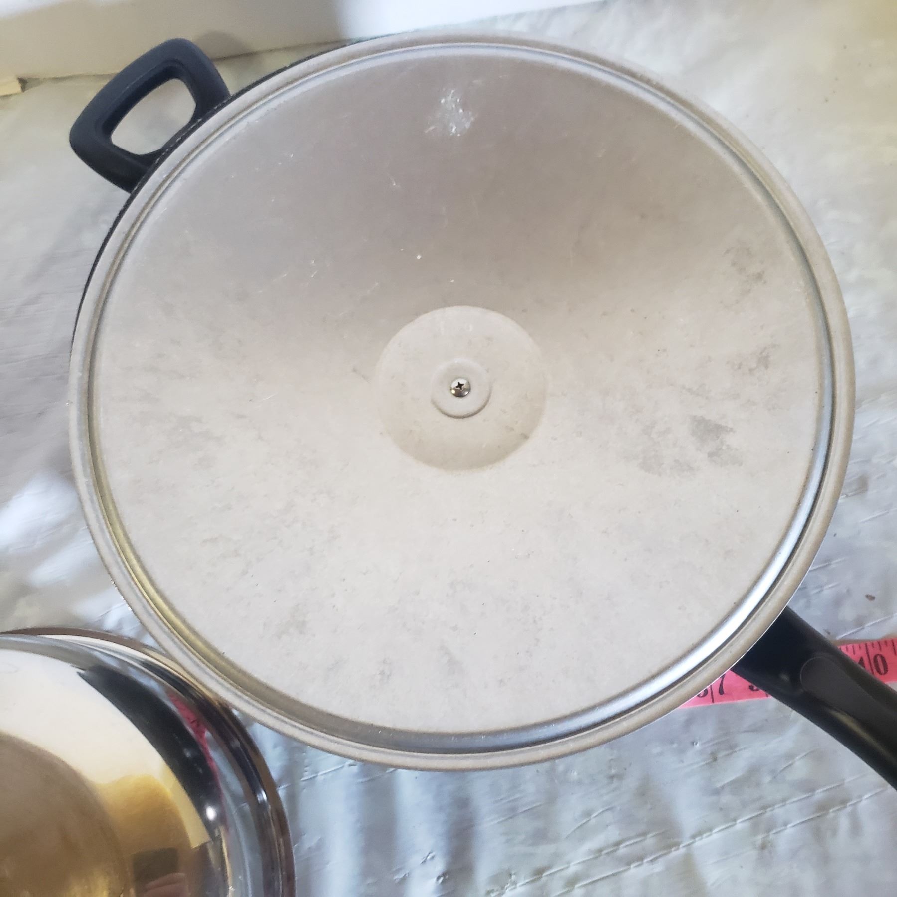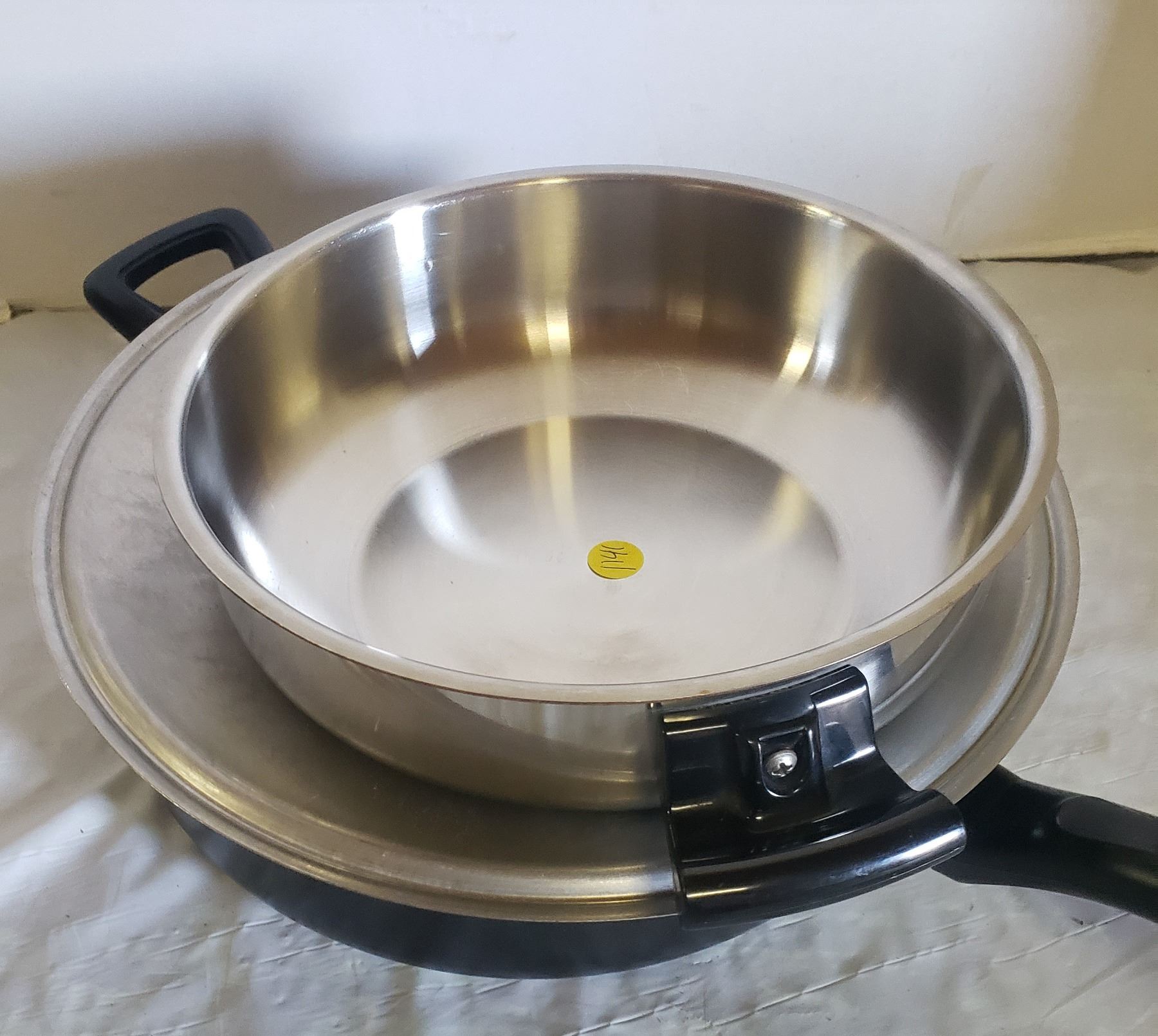Heavy Black frying pan with lid (12"x3.5") and stainless steel pot