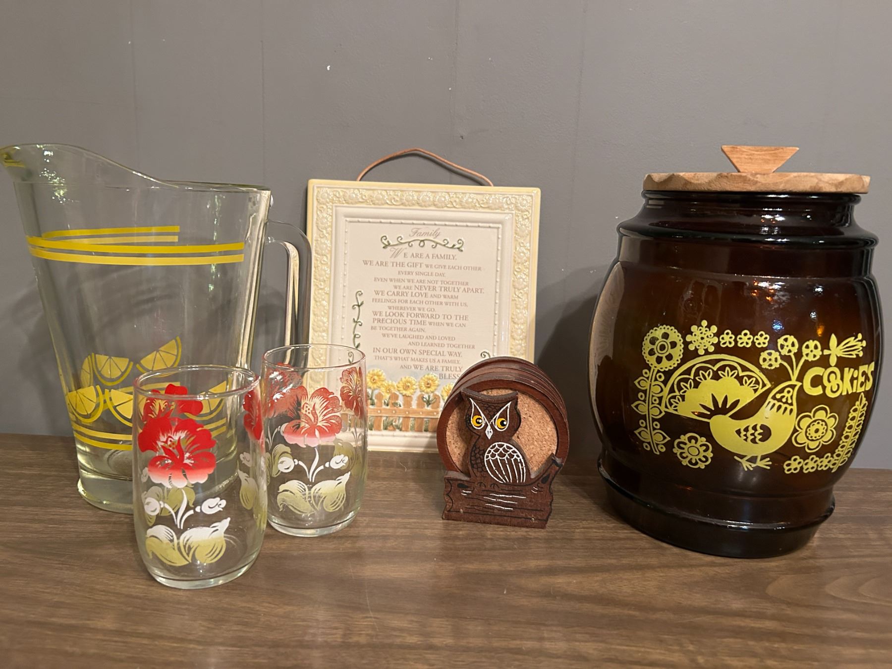 Heavy Glass Lemon juice jug, amber vintage cookie jar with lid, wooden Vintage owl cork coasters, "we Are Family" Plaque.