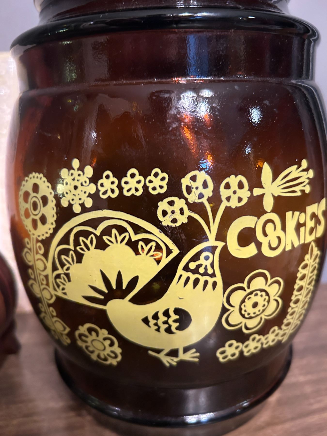 Heavy Glass Lemon juice jug, amber vintage cookie jar with lid, wooden Vintage owl cork coasters, "w