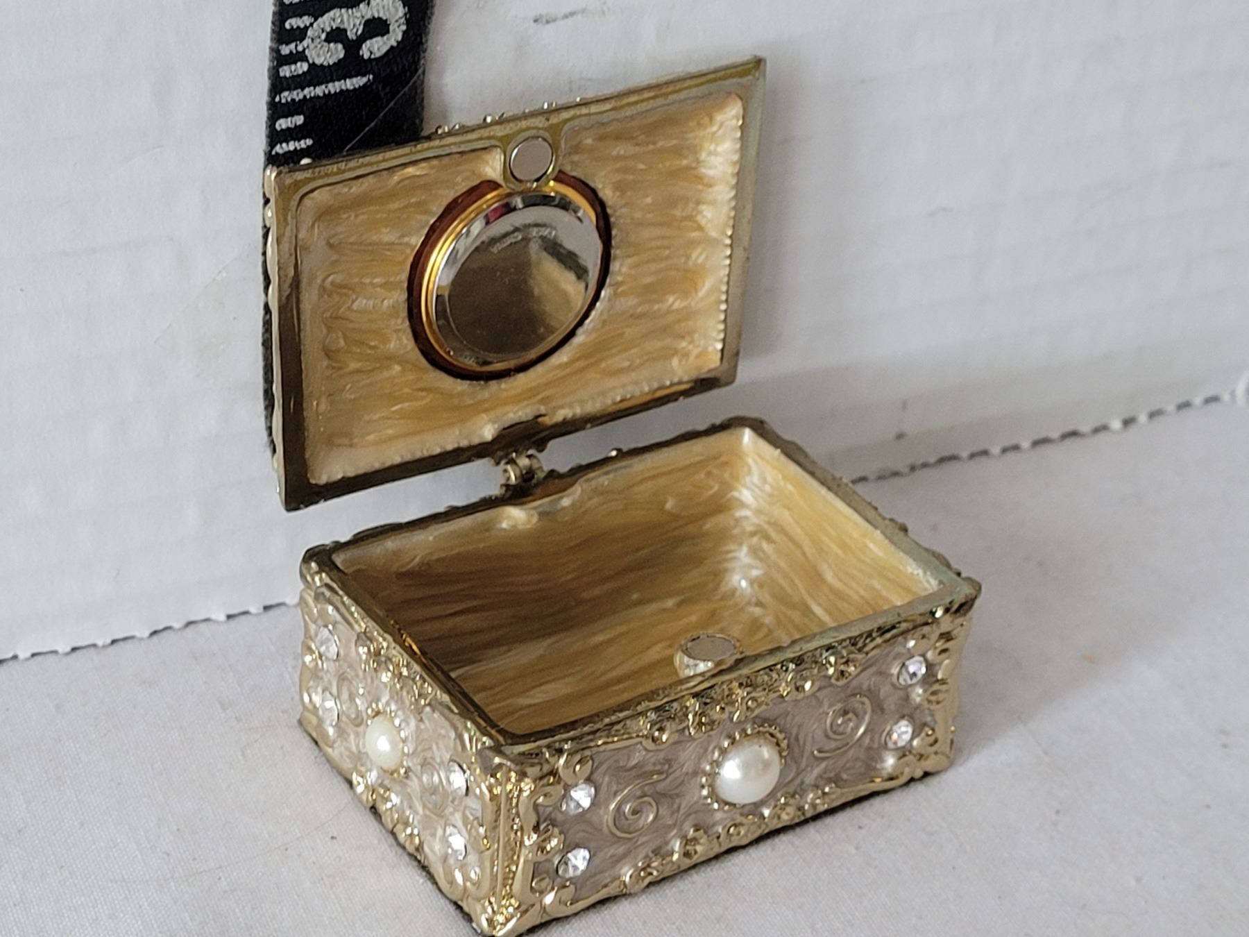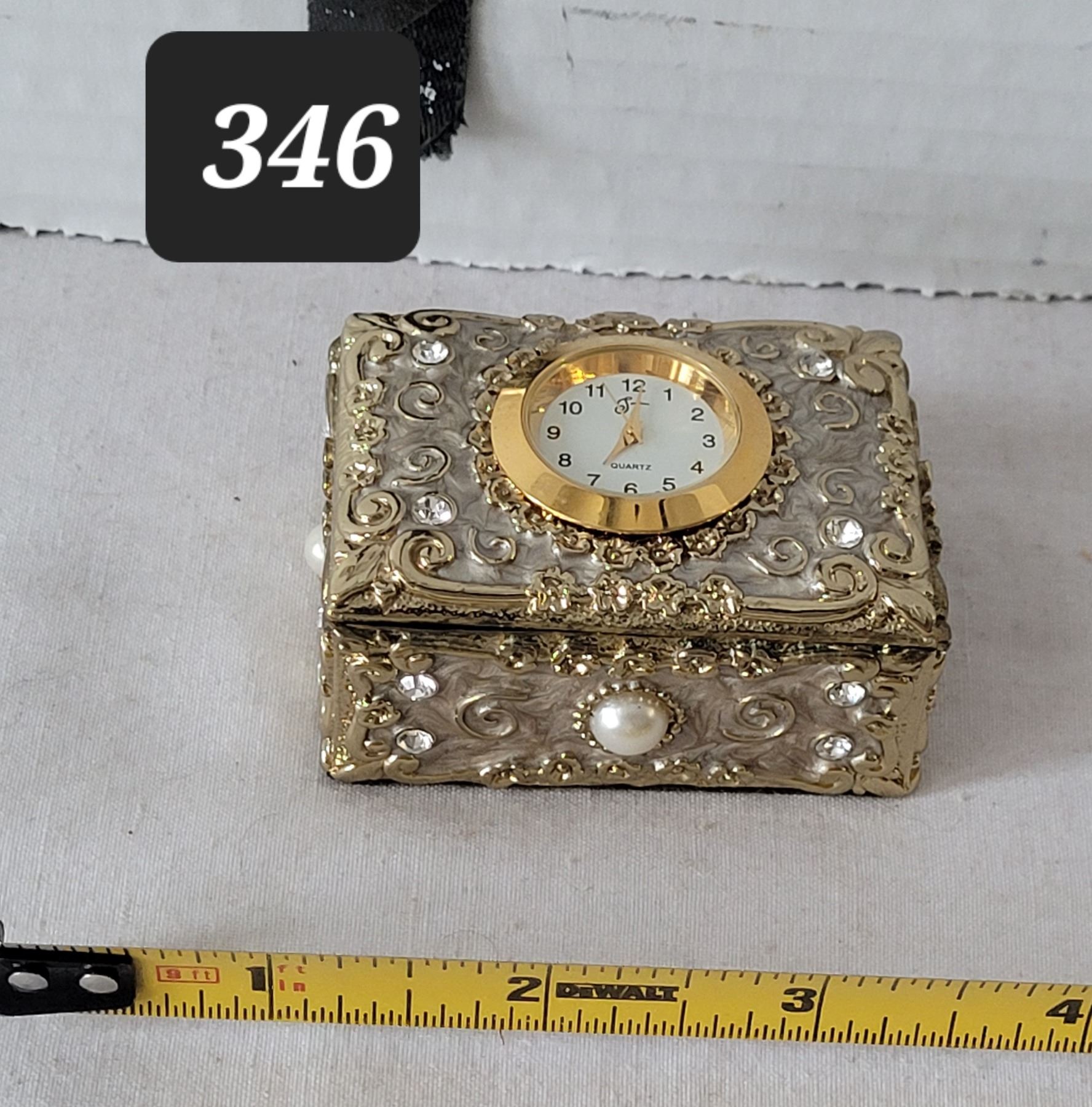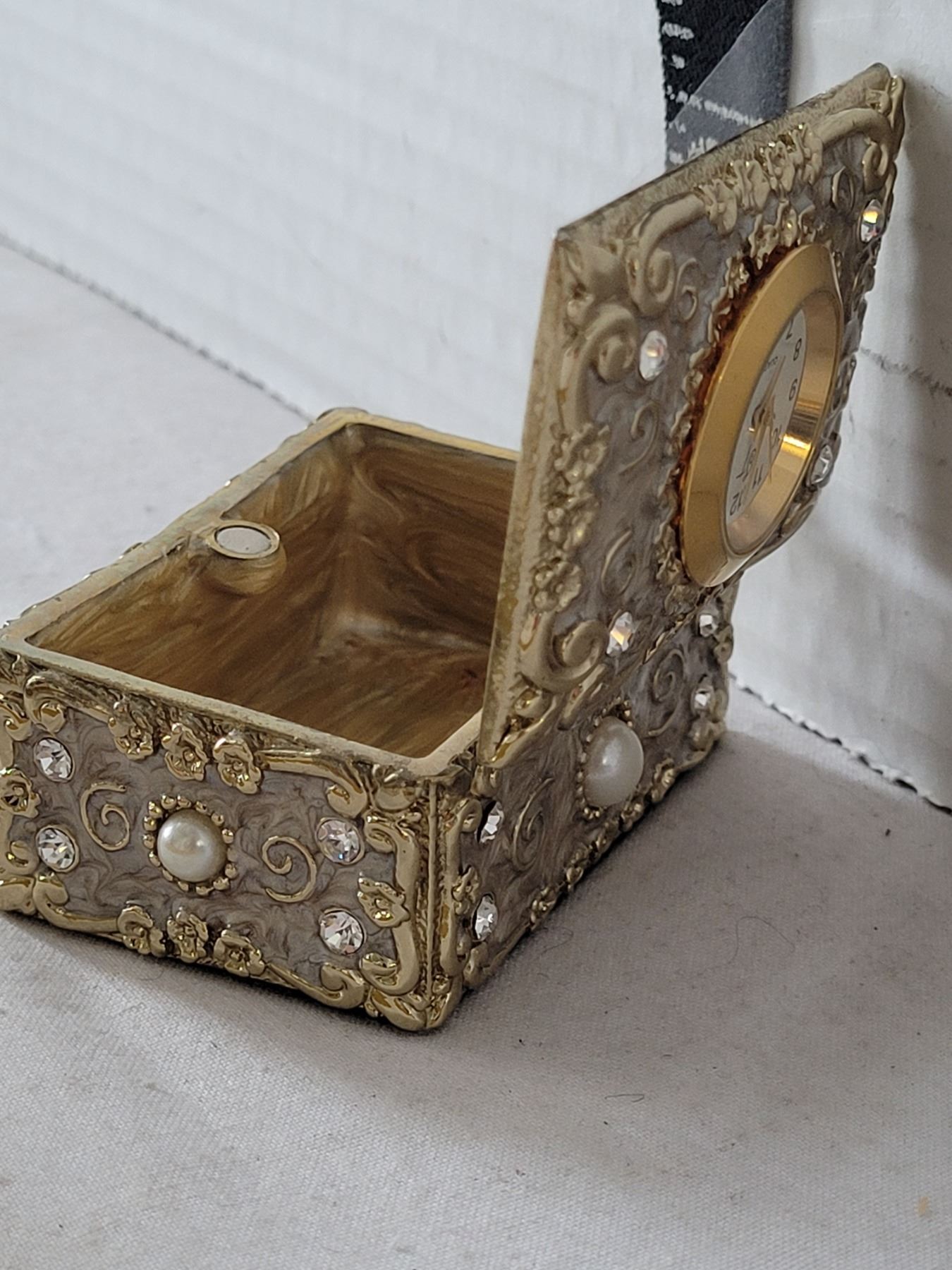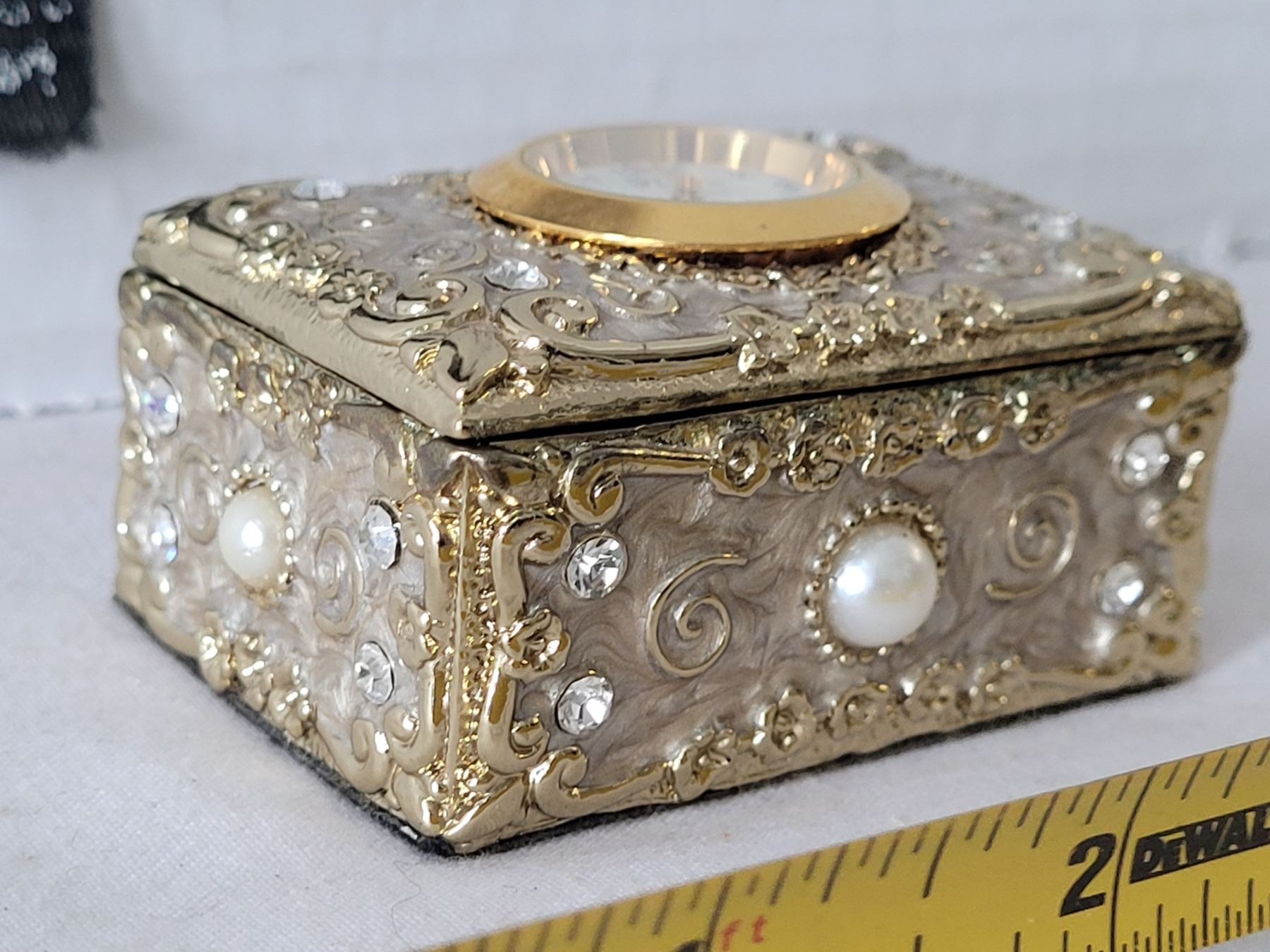 Heavy metal ornate trinket box. Enamel inside with time piece on top.