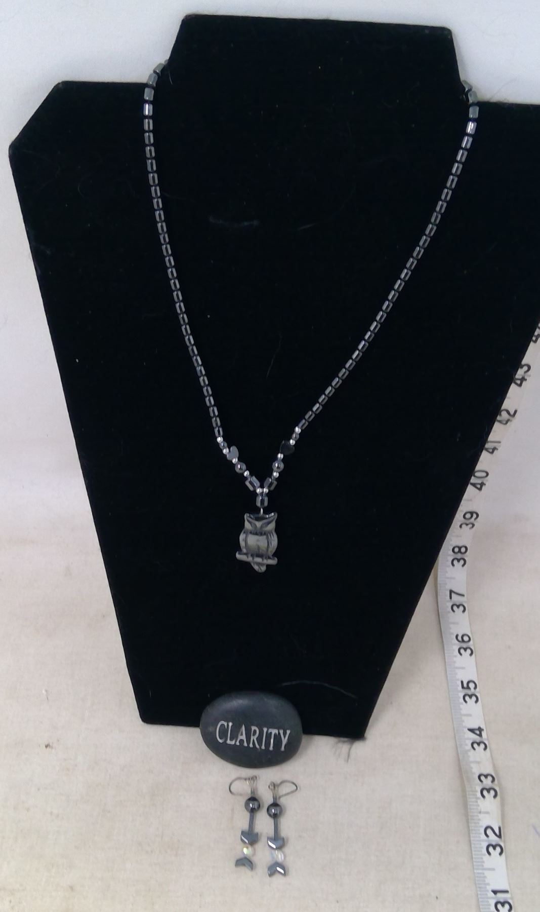 Hematite Owl Necklace, Earrings, and Clarity Stone