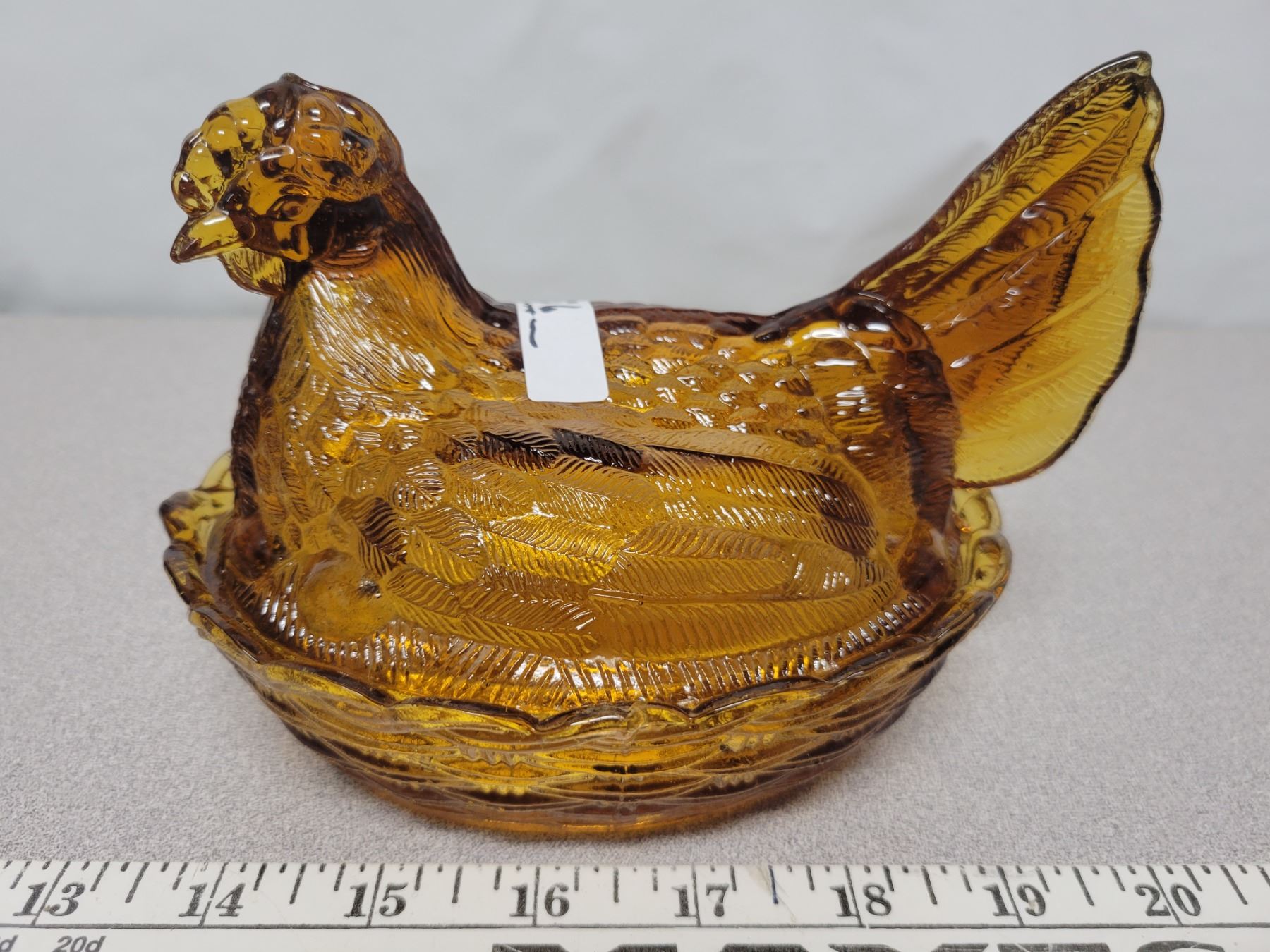 Hen on nest rust orange no cracks tiny chips on edge (see photos)