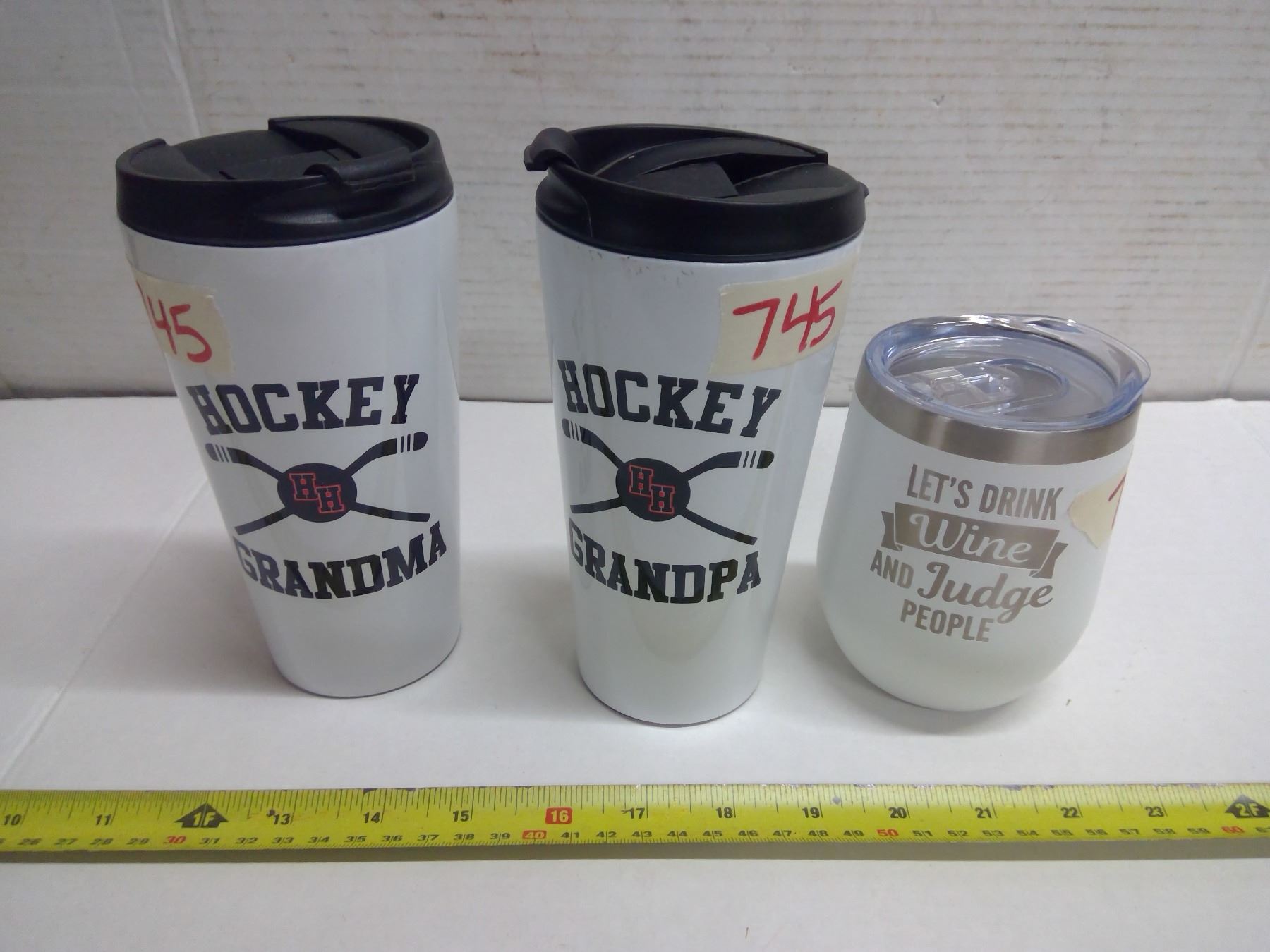 "Hockey Grandma/Grandpa" Travel Mugs, and "Let's Drink Wine and Judge People" Travel Wine Cup