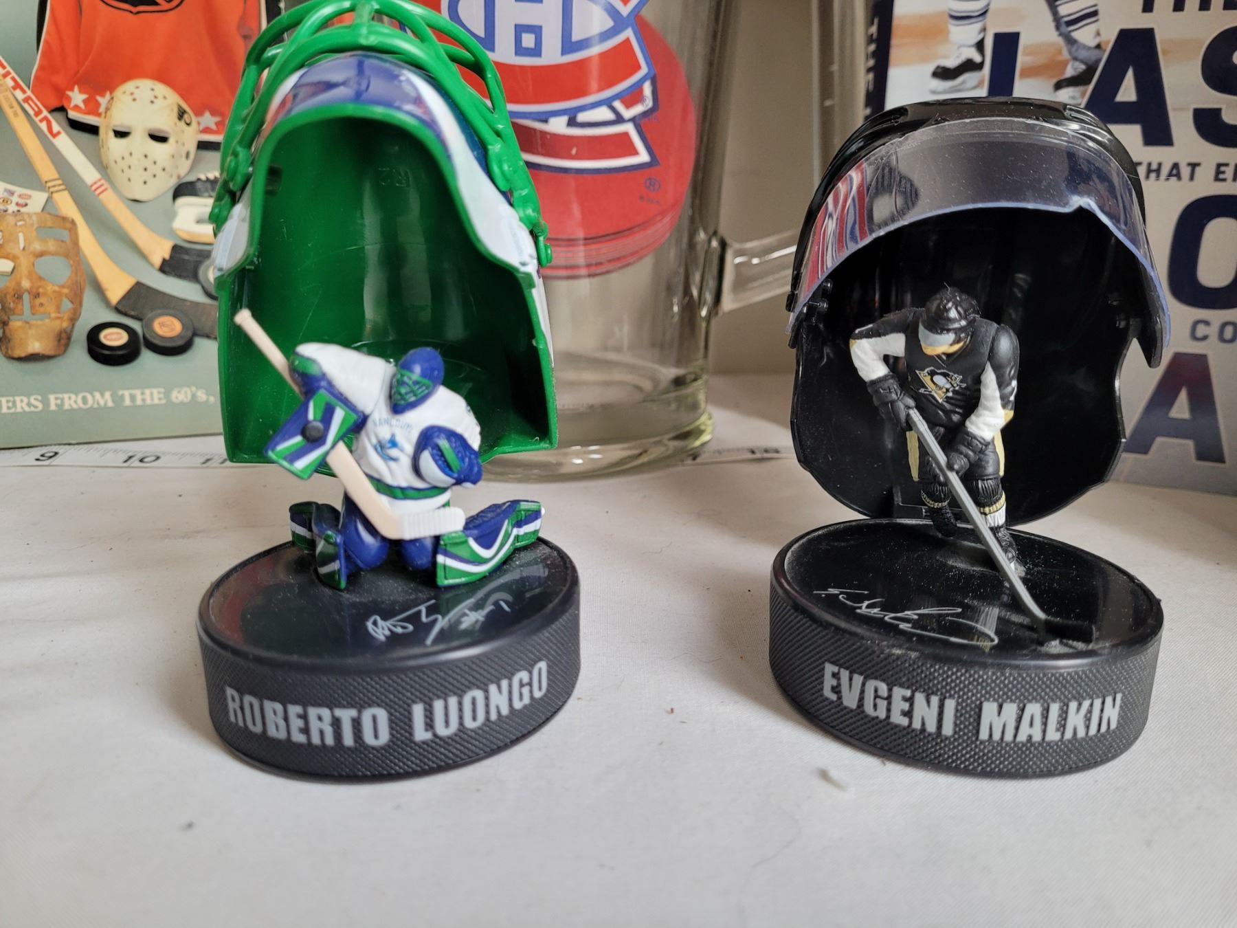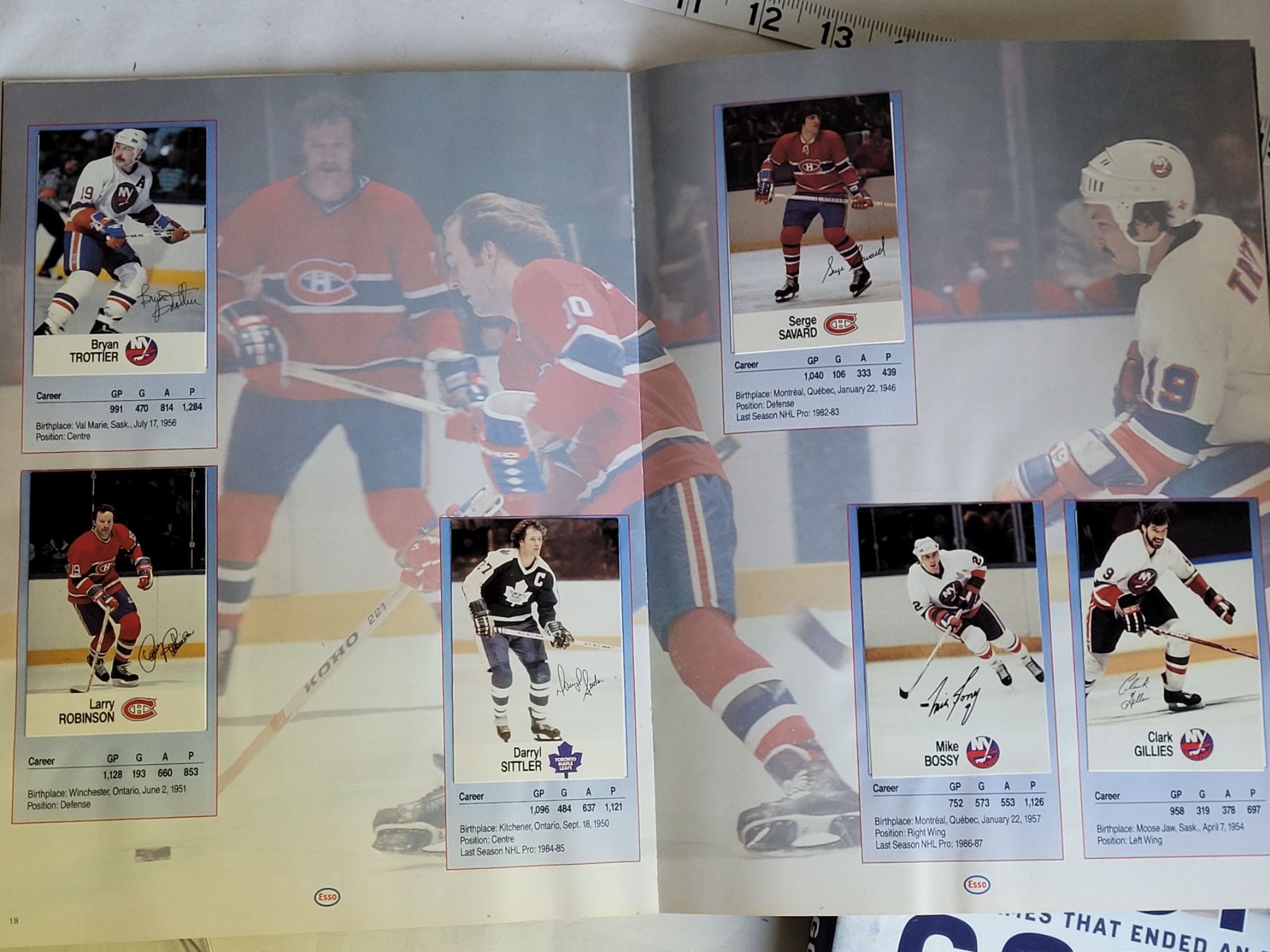 Hockey Lot. Esso all star book 1960's -'80's, pucks, Canadians drink pitcher & coasters, Oilers book & collector figures.