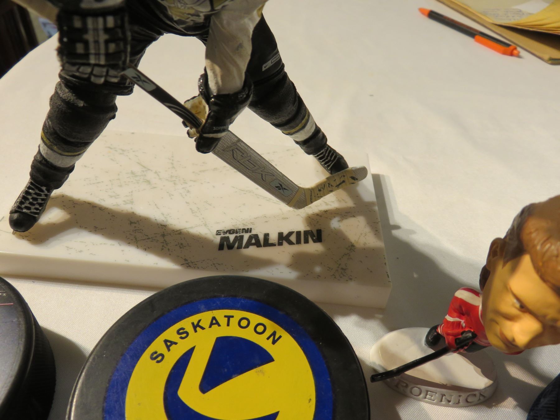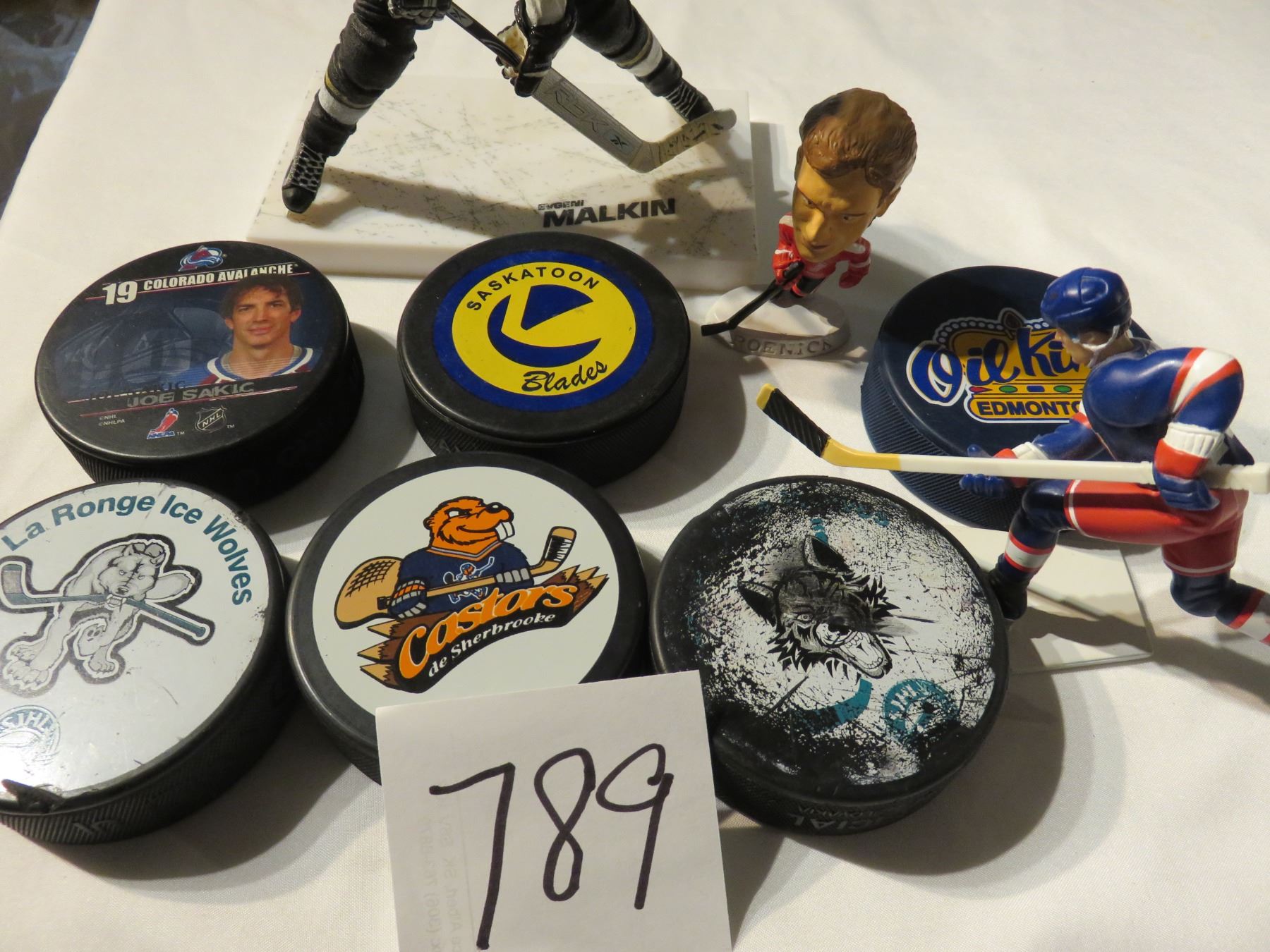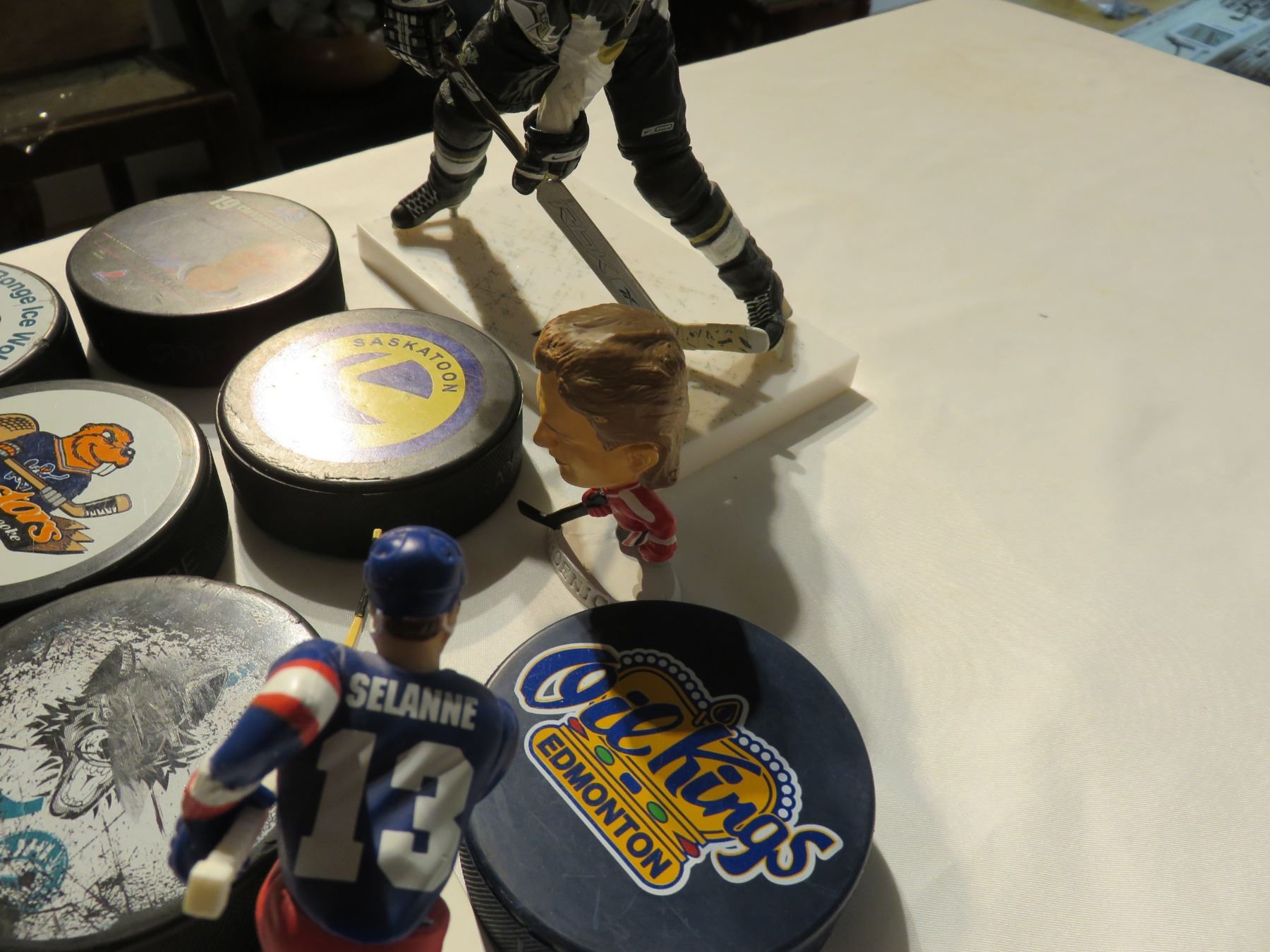 Hockey figures - Malkin, Roenick, Selanne; 6 pucks including Joe Sakic with Colorado & other junior teams