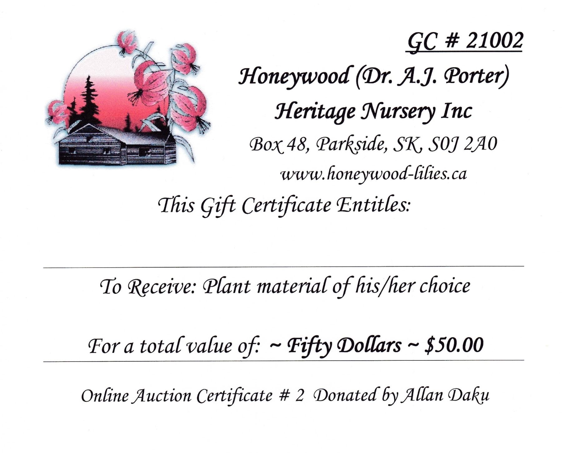 $50.00 value towards any plant materials at Honeywood
