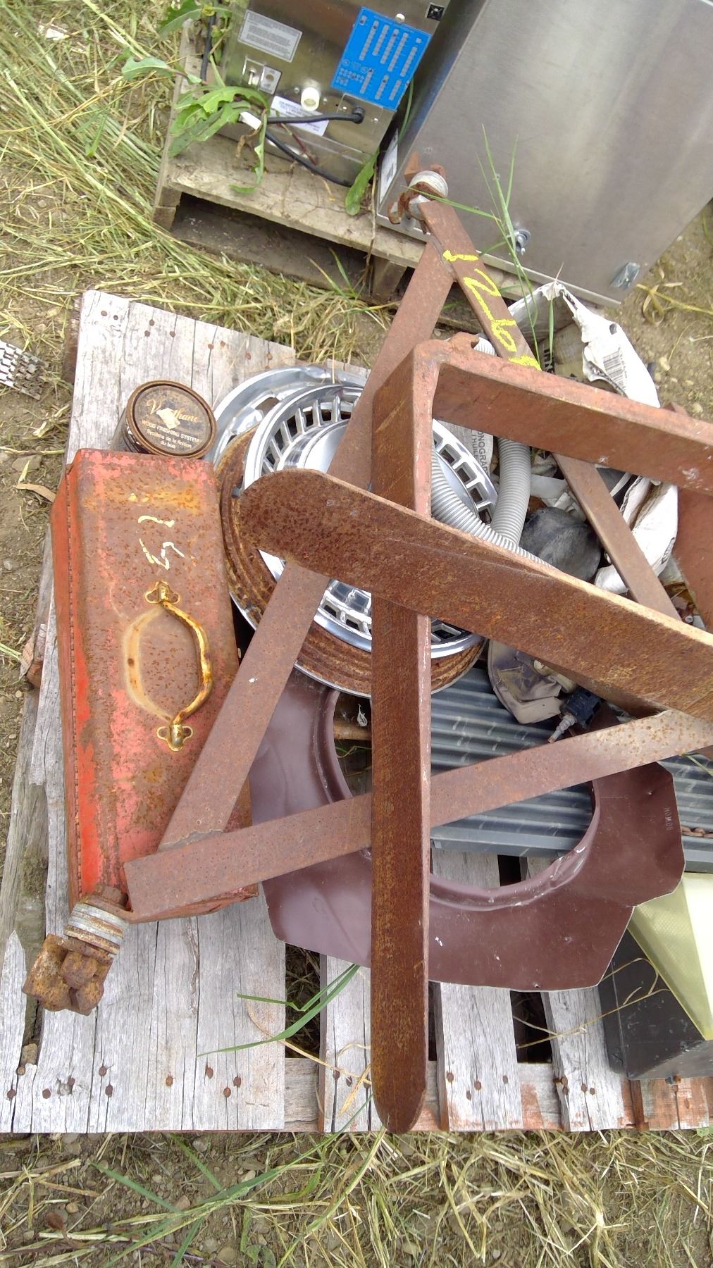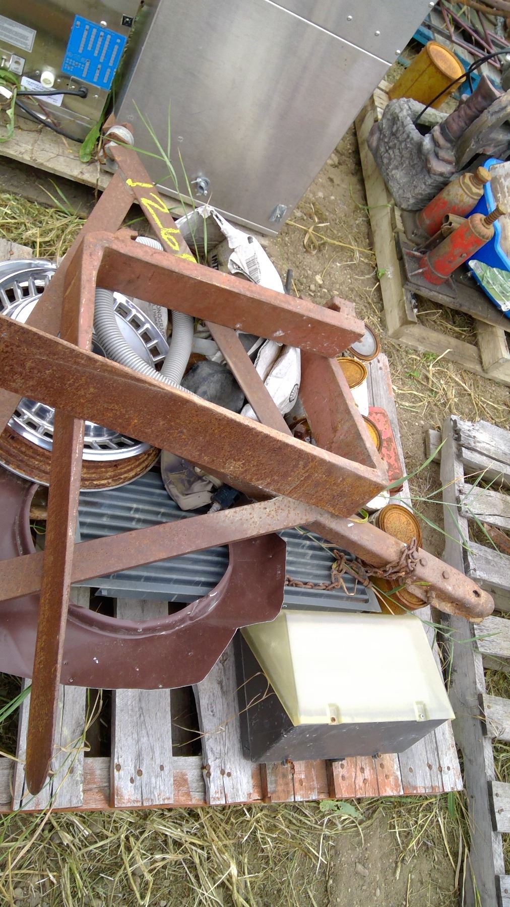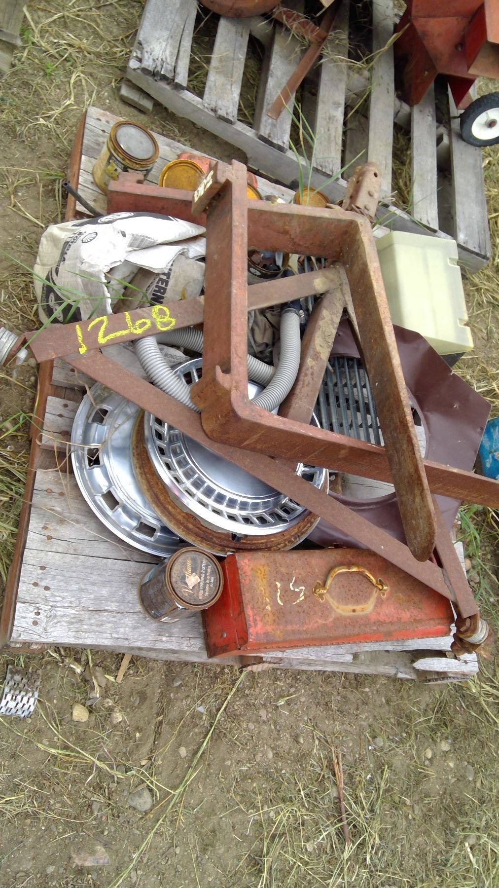 Hubcaps, forks, hitch, and misc. on pallet