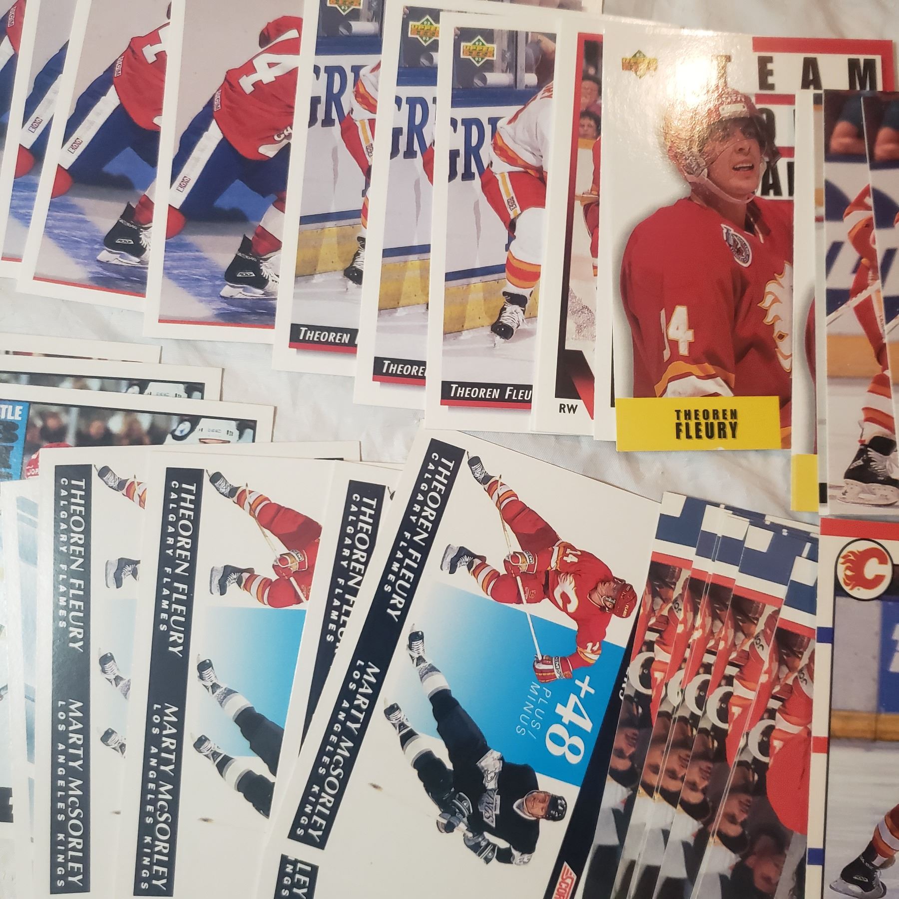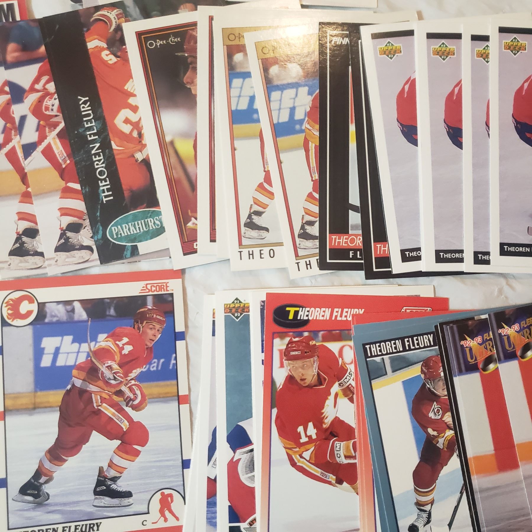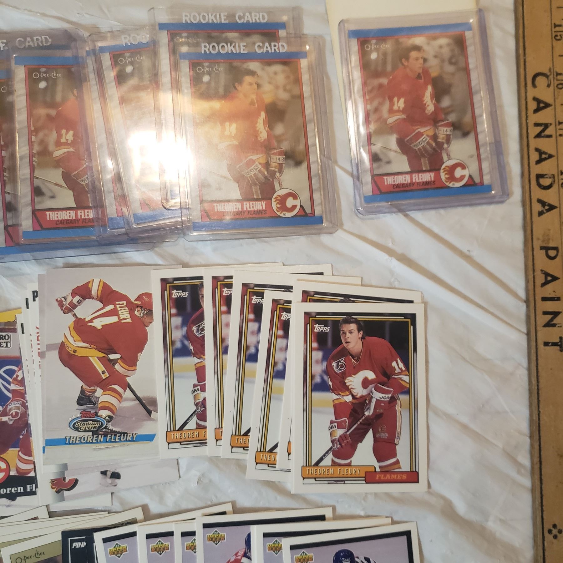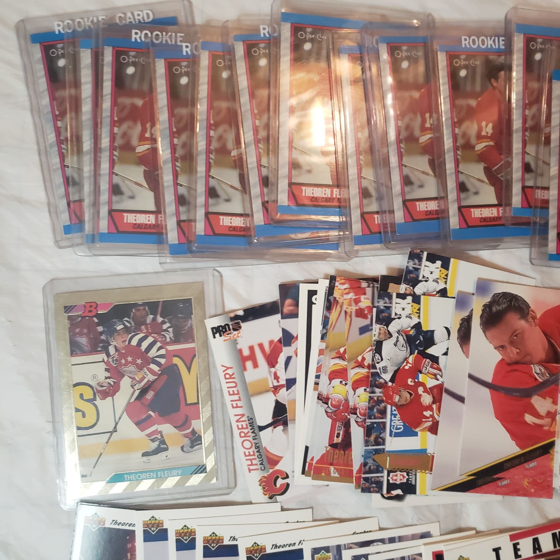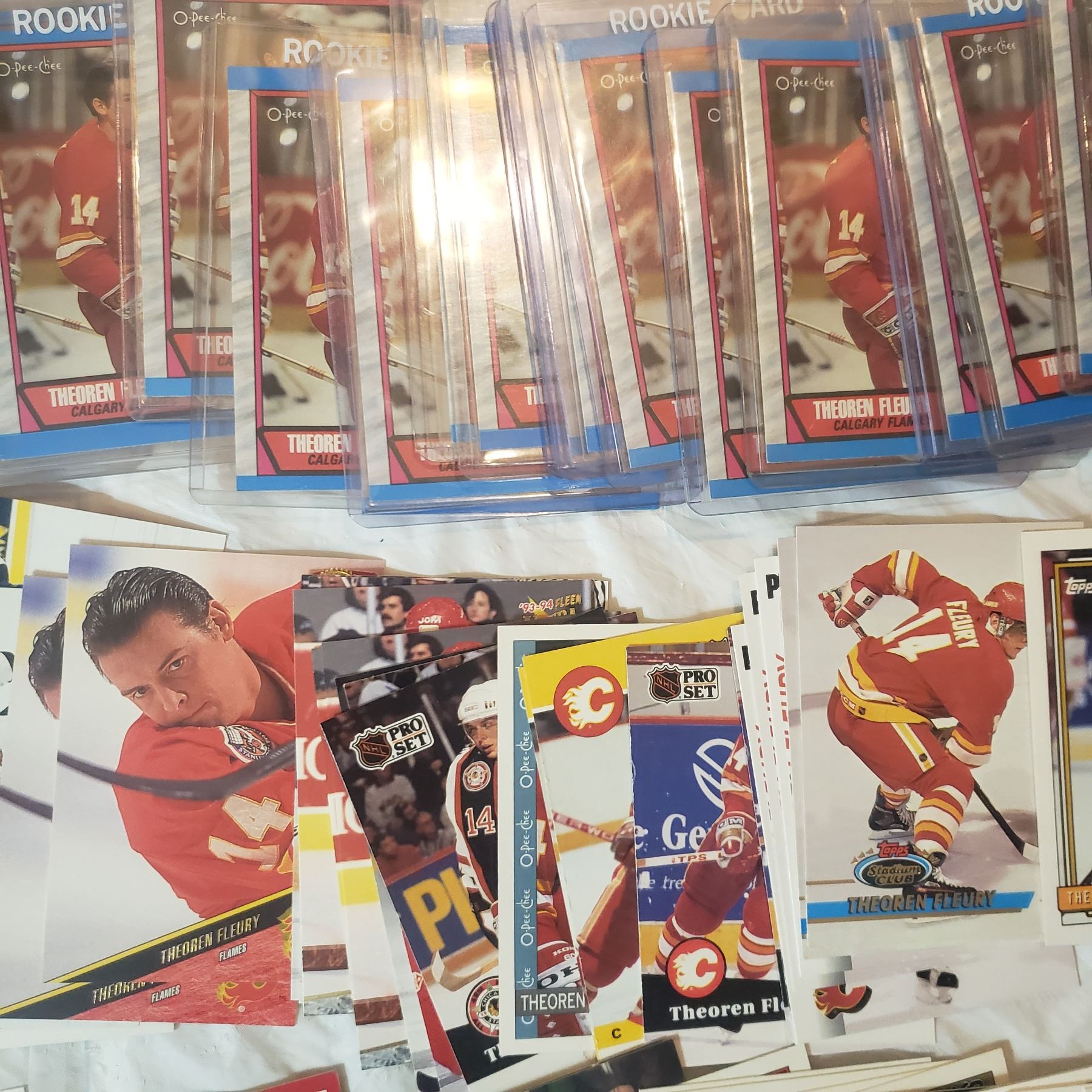 Huge Theoren Fleury lot inlcudes 26 rookie cards already in top loaders hockey trading card collector lot