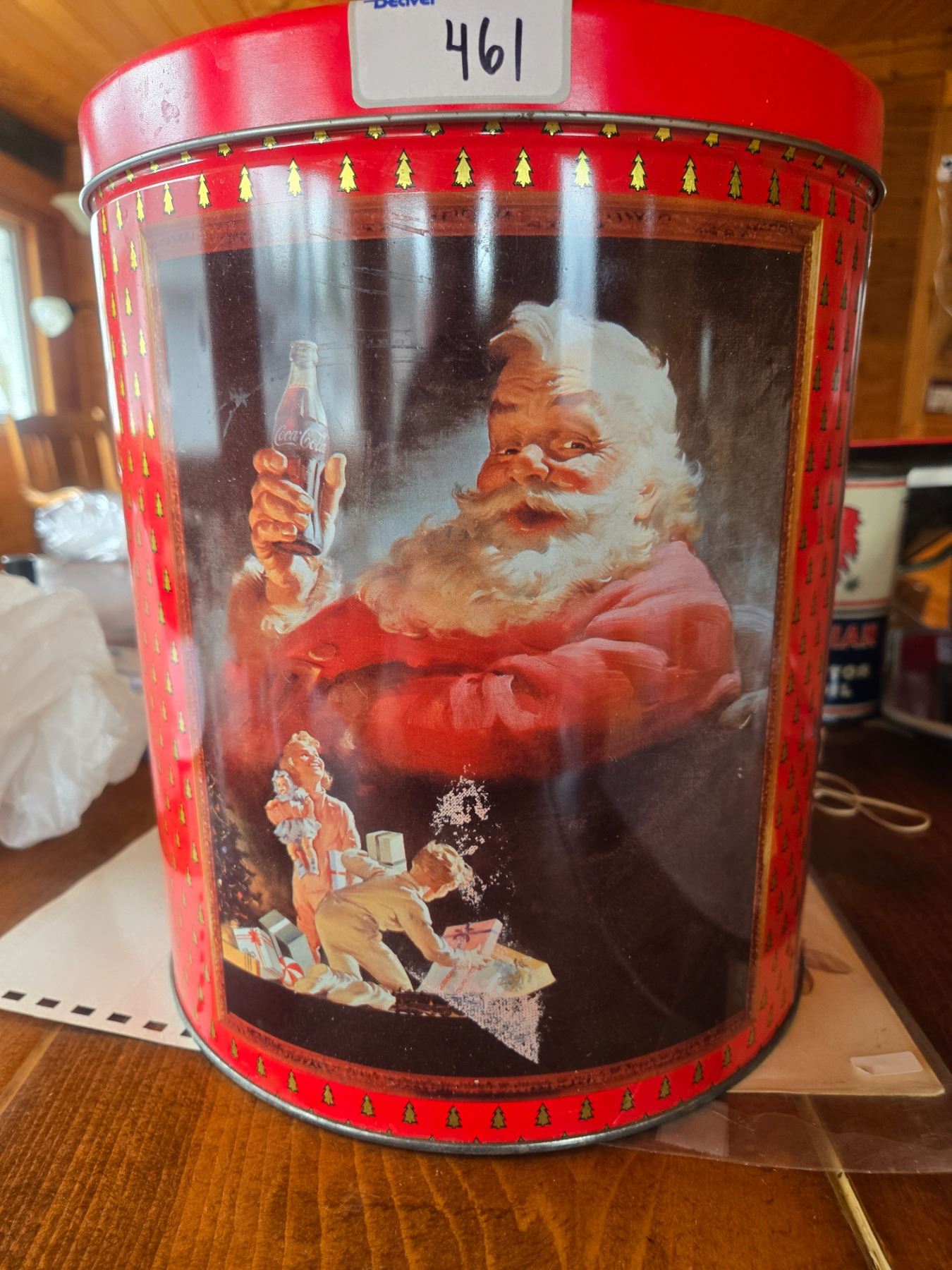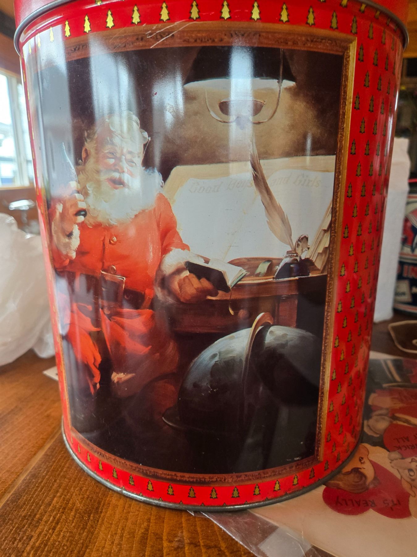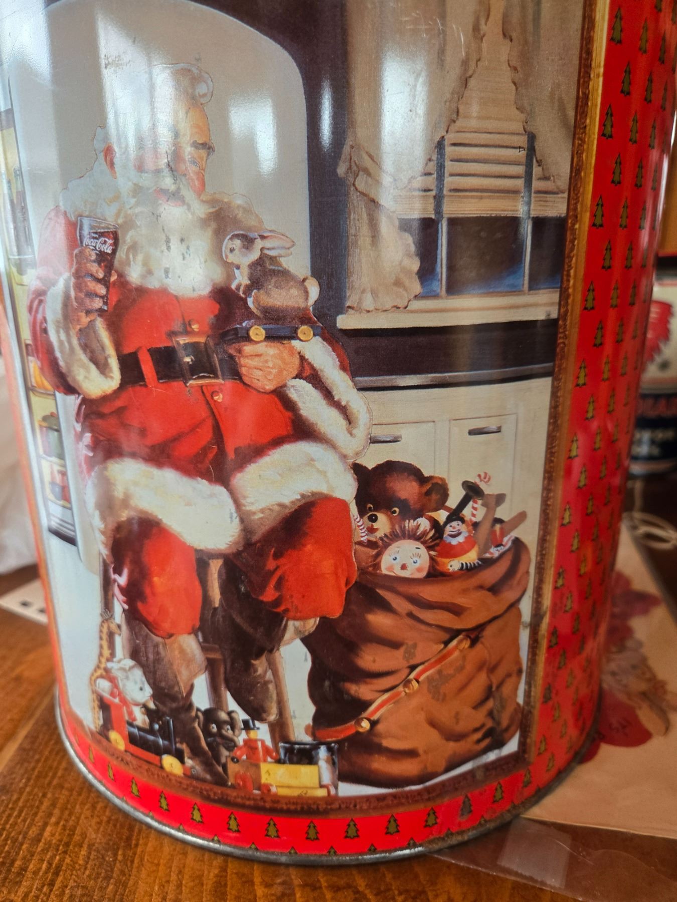 Huge coca-cola santa claus cannister 1990-11.5in tallx 9in diameter. 3 sided images all excellent 9some glare in photos)