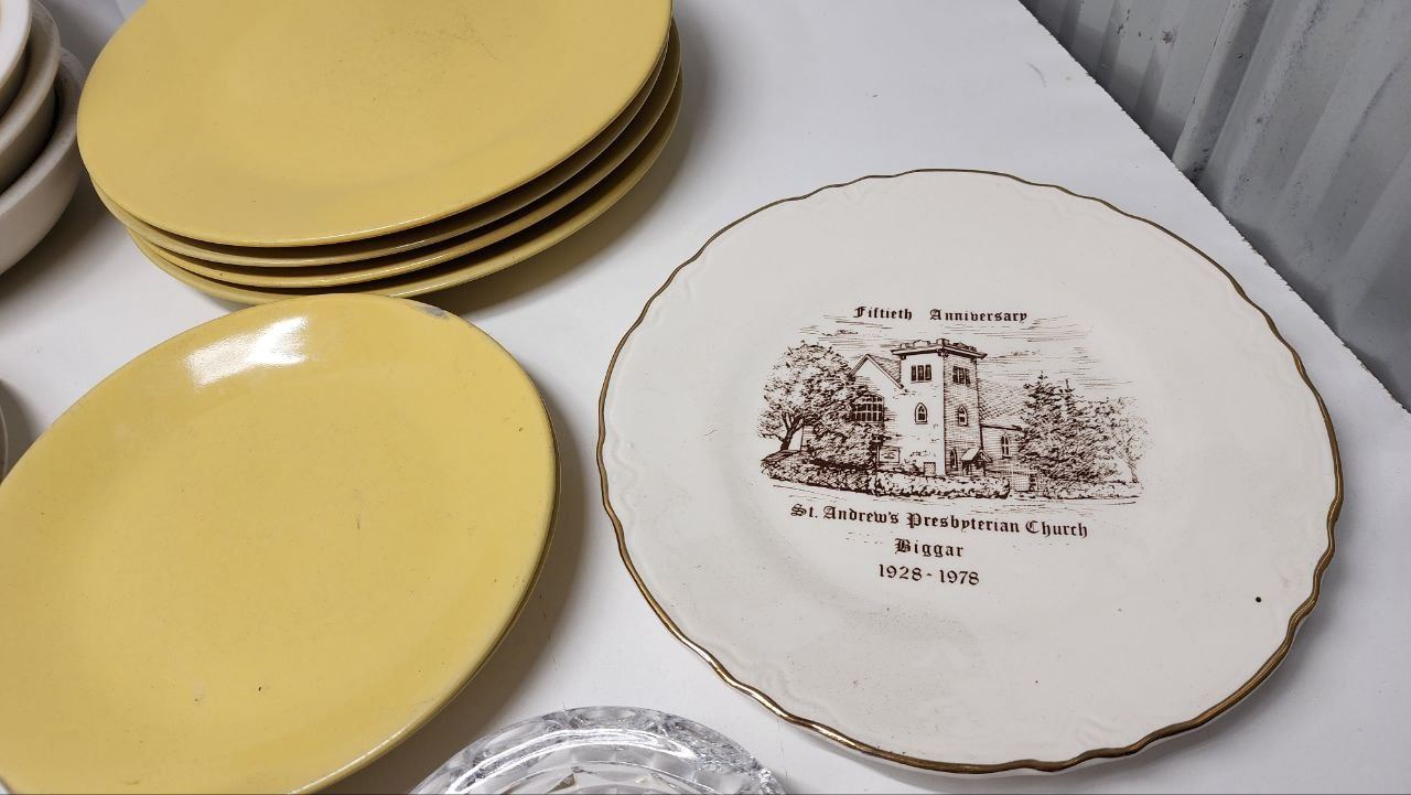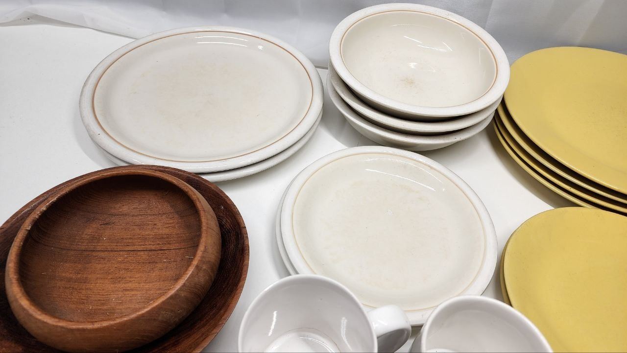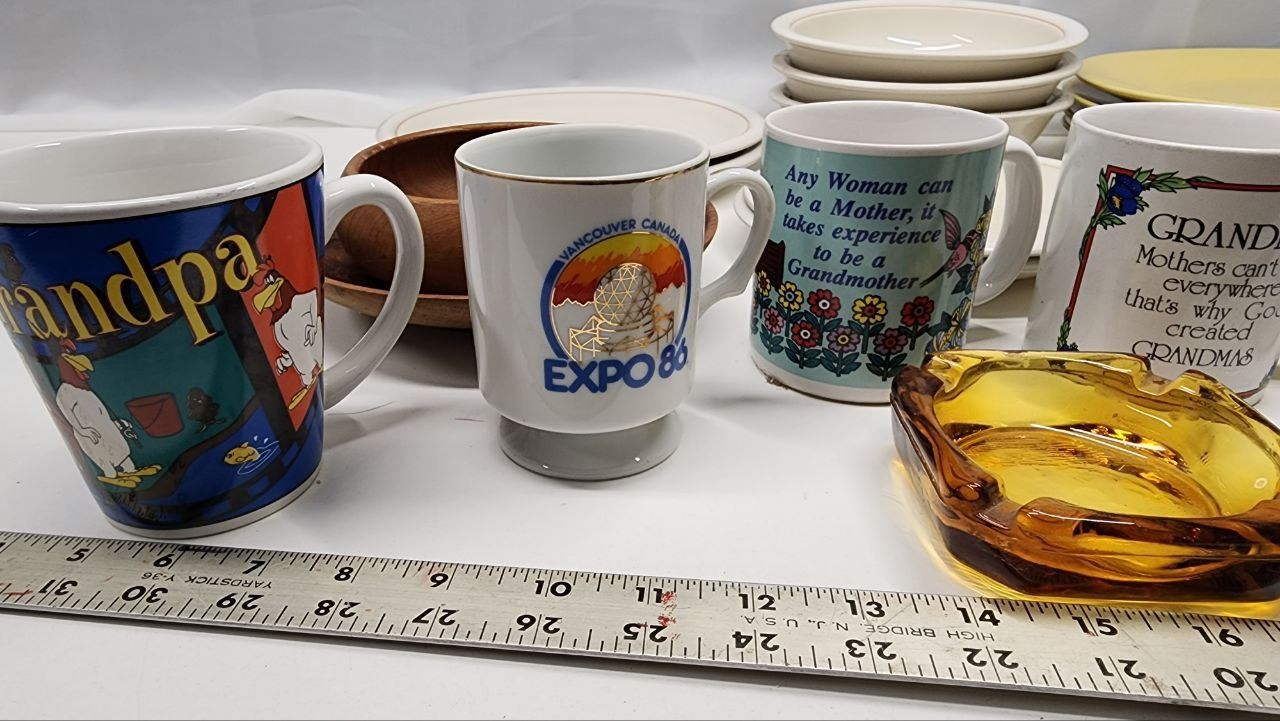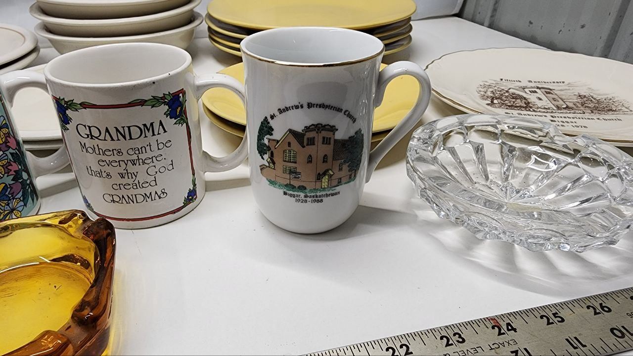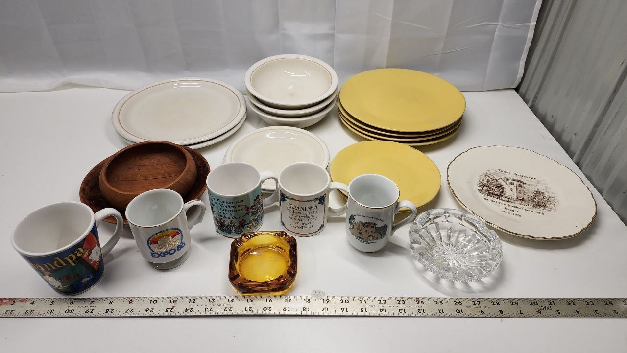 Huge lot Assorted Dishwares, Mugs, Plates, Bowls, Saucers and Glass Ashtrays