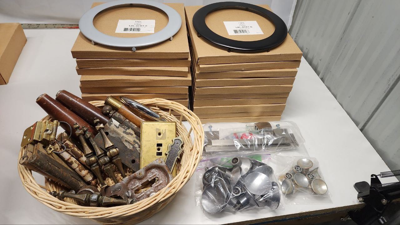 Huge lot of Assorted House Hardware, Cabinet Handles/Door knobs, Pot light covers (blk & silver)