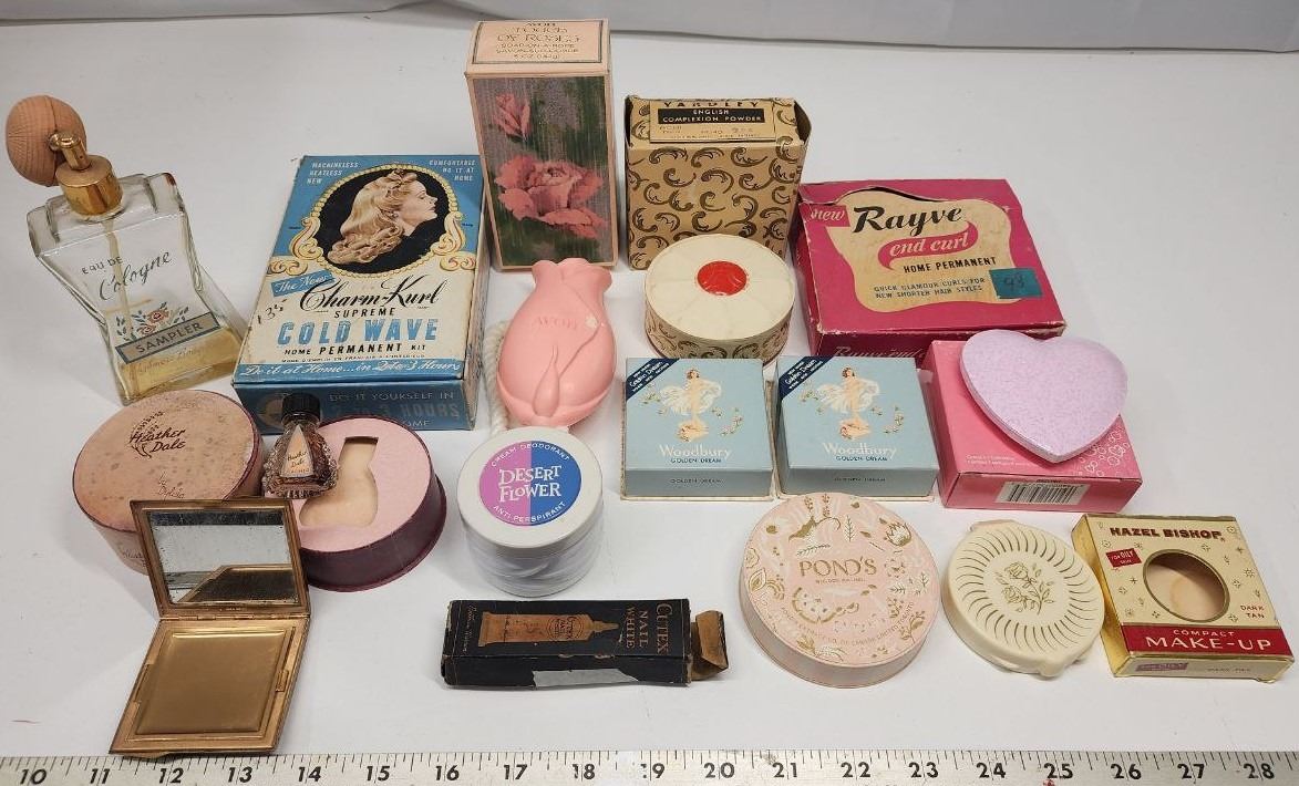 Huge lot of Vintage Cosmetics, Face Powders, Hair Curler, Avon, Creams and Perfume Bottle