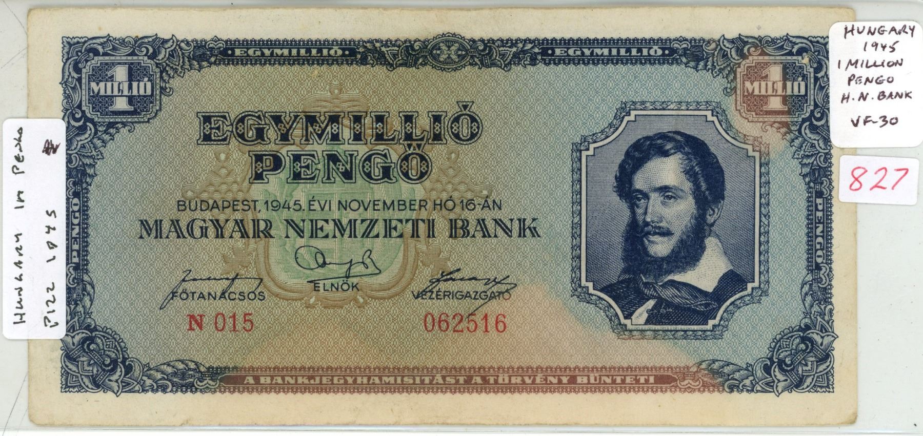 Hungary. 1945 1 Million Pengo. Hungarian National Bank. Inflationary note. VF-30.
