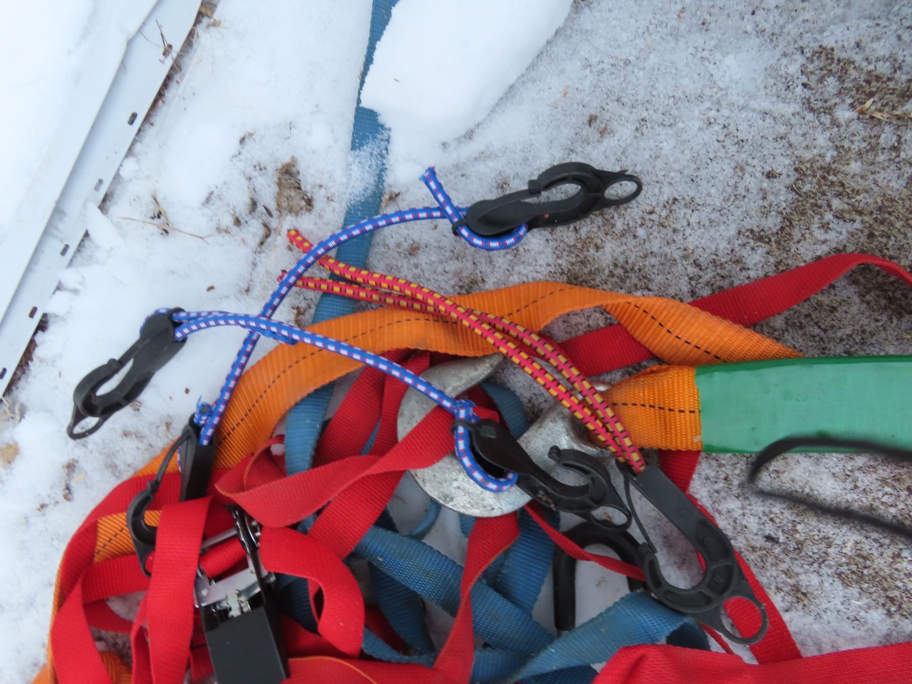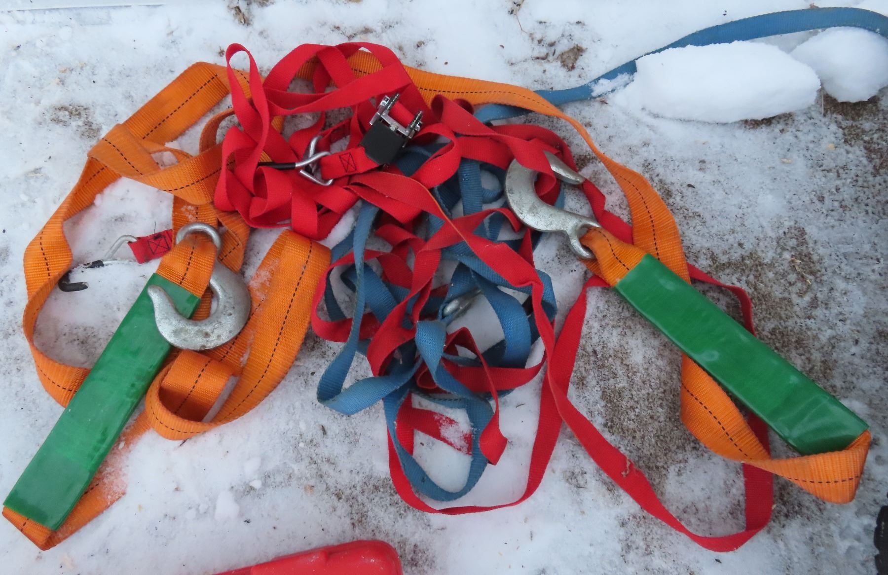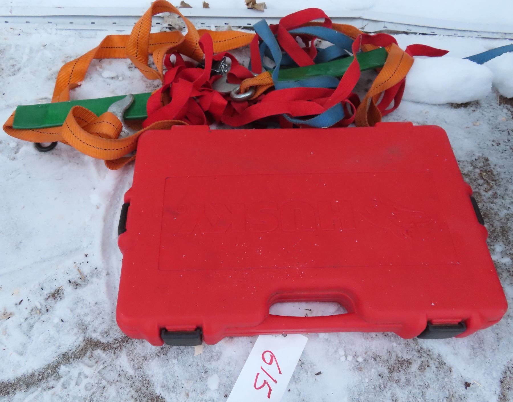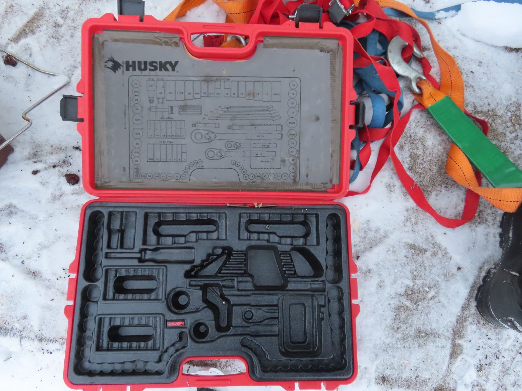 Husky tool kit + ratchet straps, towing cable, bungee cables