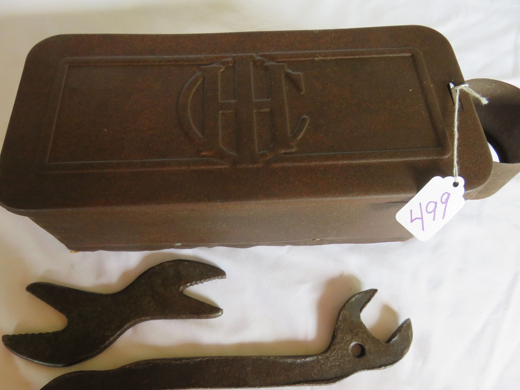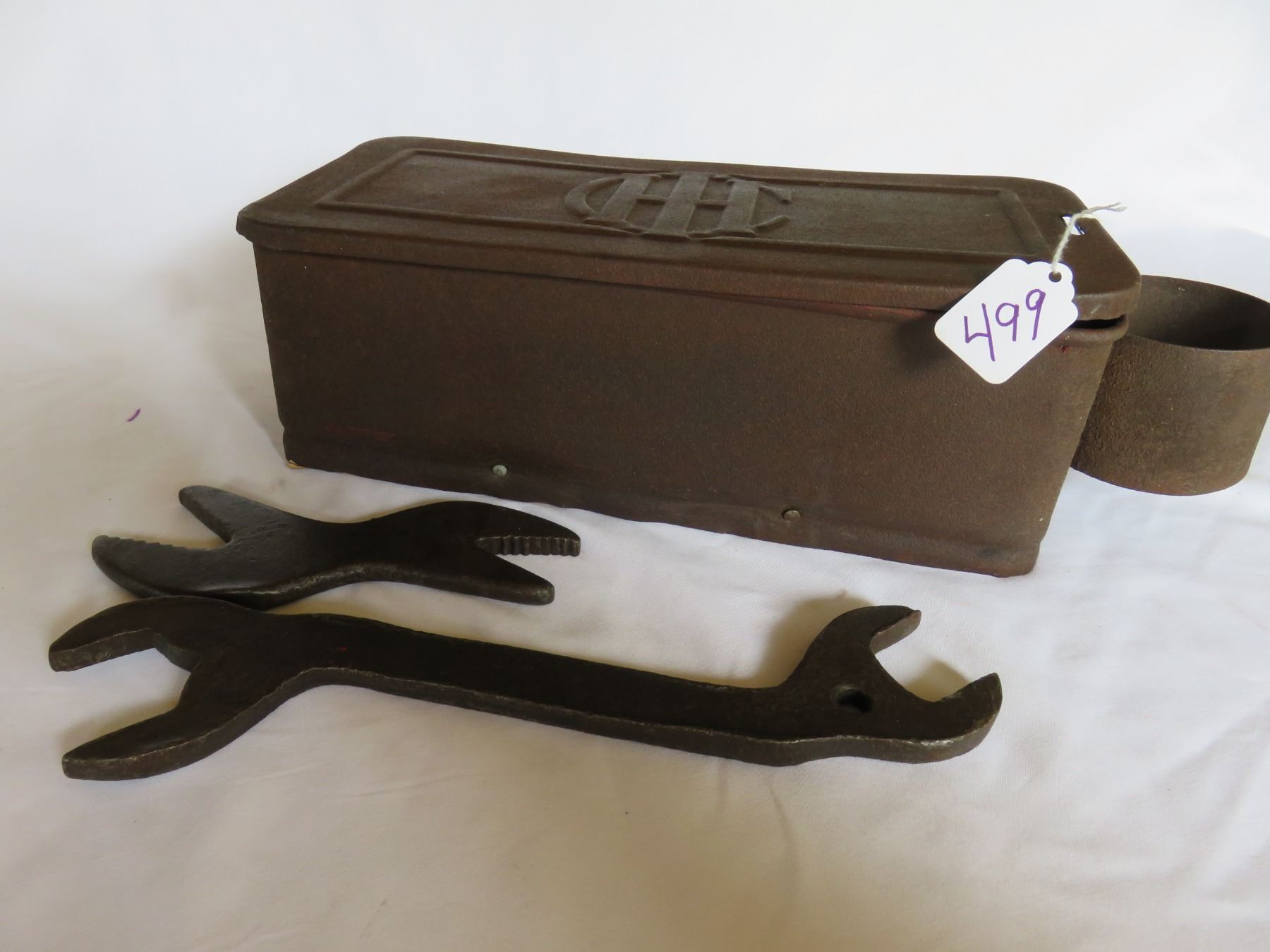 INTERNATIONAL HARVESTER TOOL BOX OF HORSE DRAWN MOWER AND TWO WRENCHES