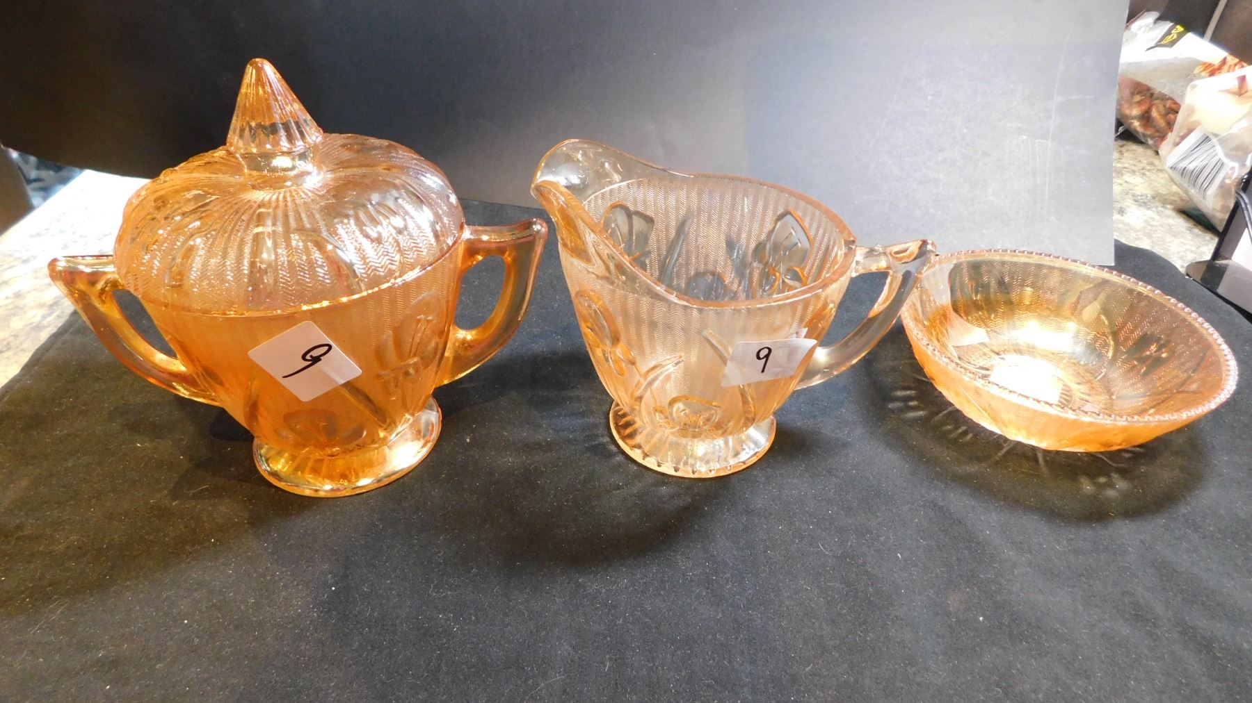 IRIS AND HERRINGBONE, CARNIVAL GLASS, CREAM & SUGAR WITH TEABAG PLATE
