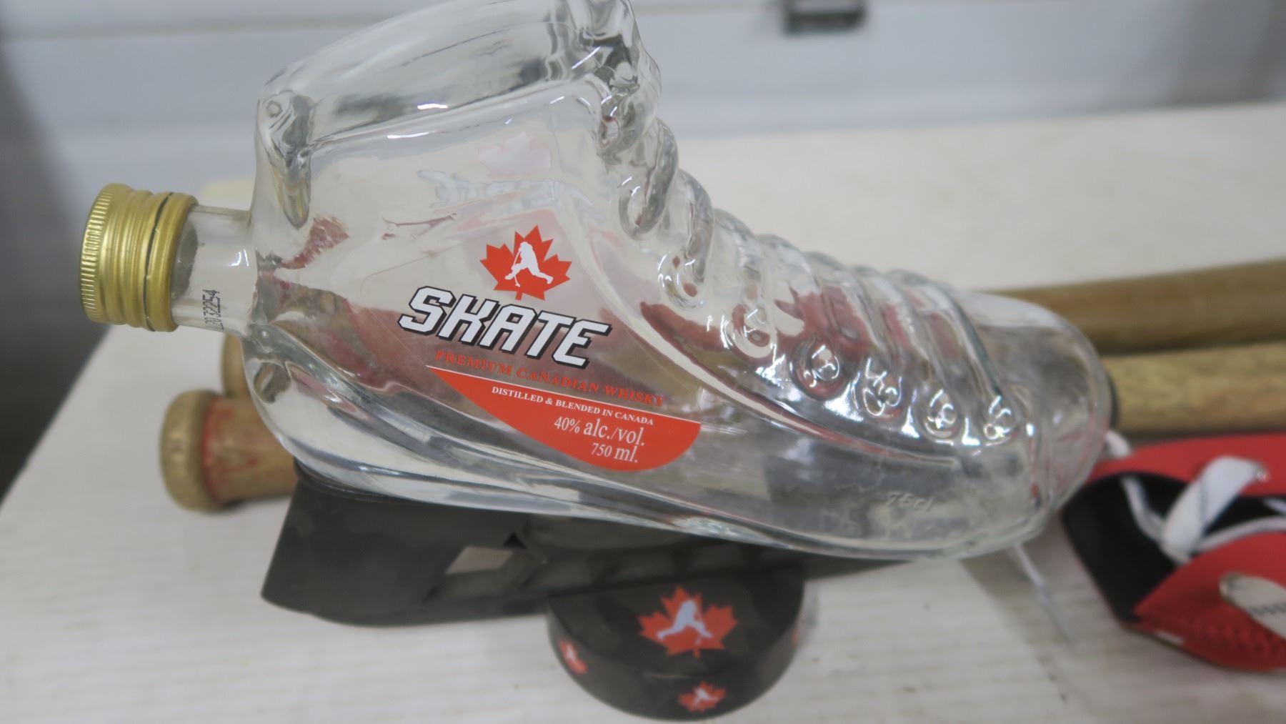 Ice Skate Whiskey Bottle, Bottle Opener, Beer Cozy and 2 Baseball Bats