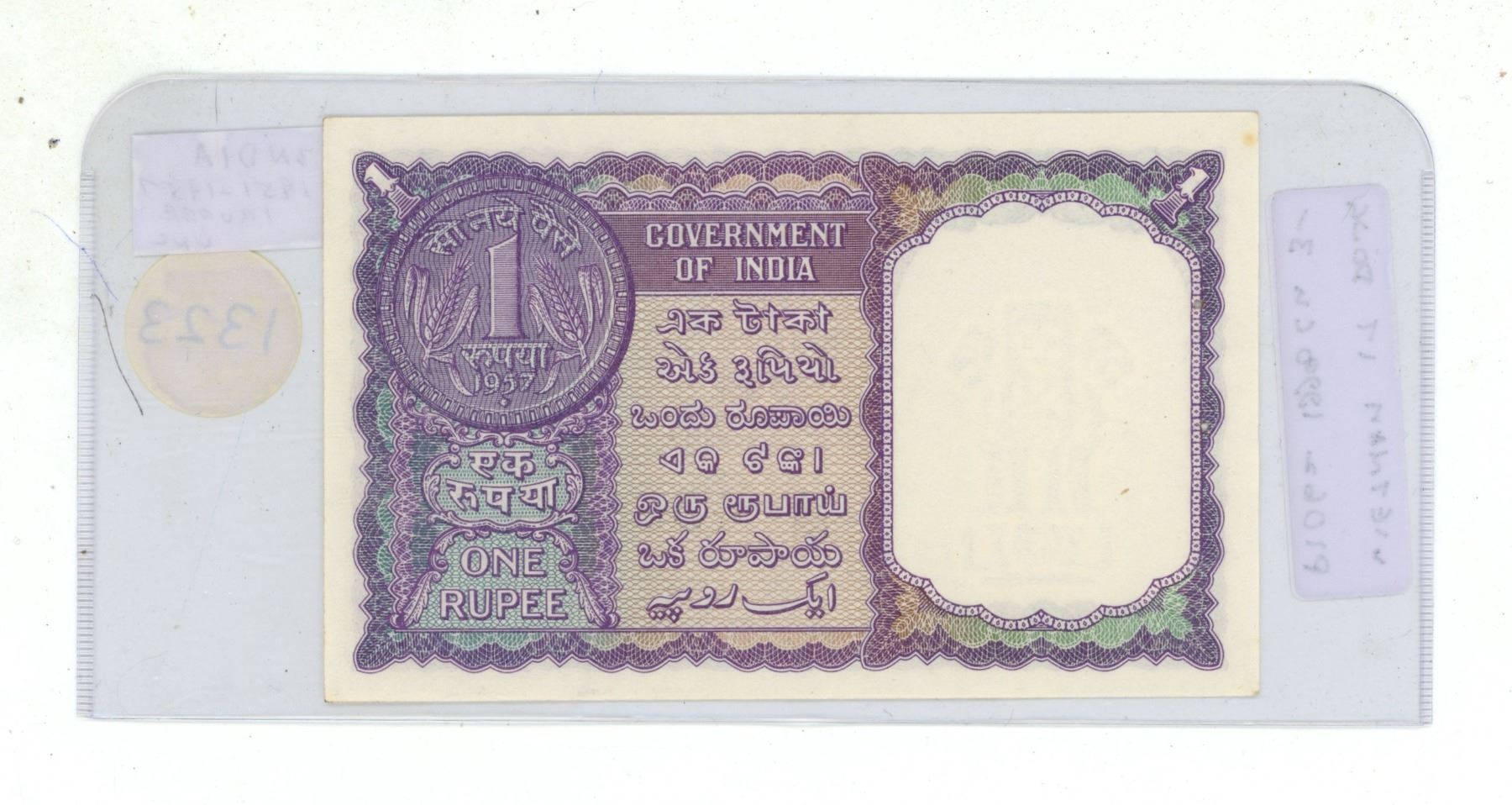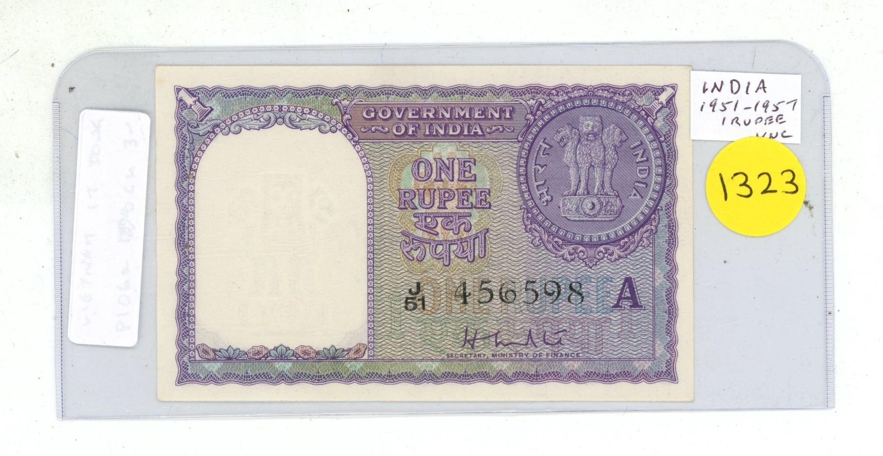 India. 1951 – 1957 1 Rupee. Note depicts Indian coins. Uncirculated.