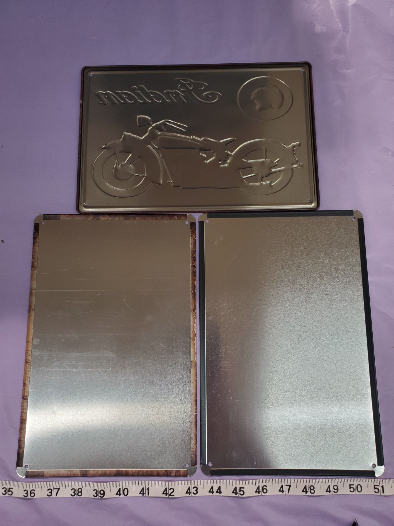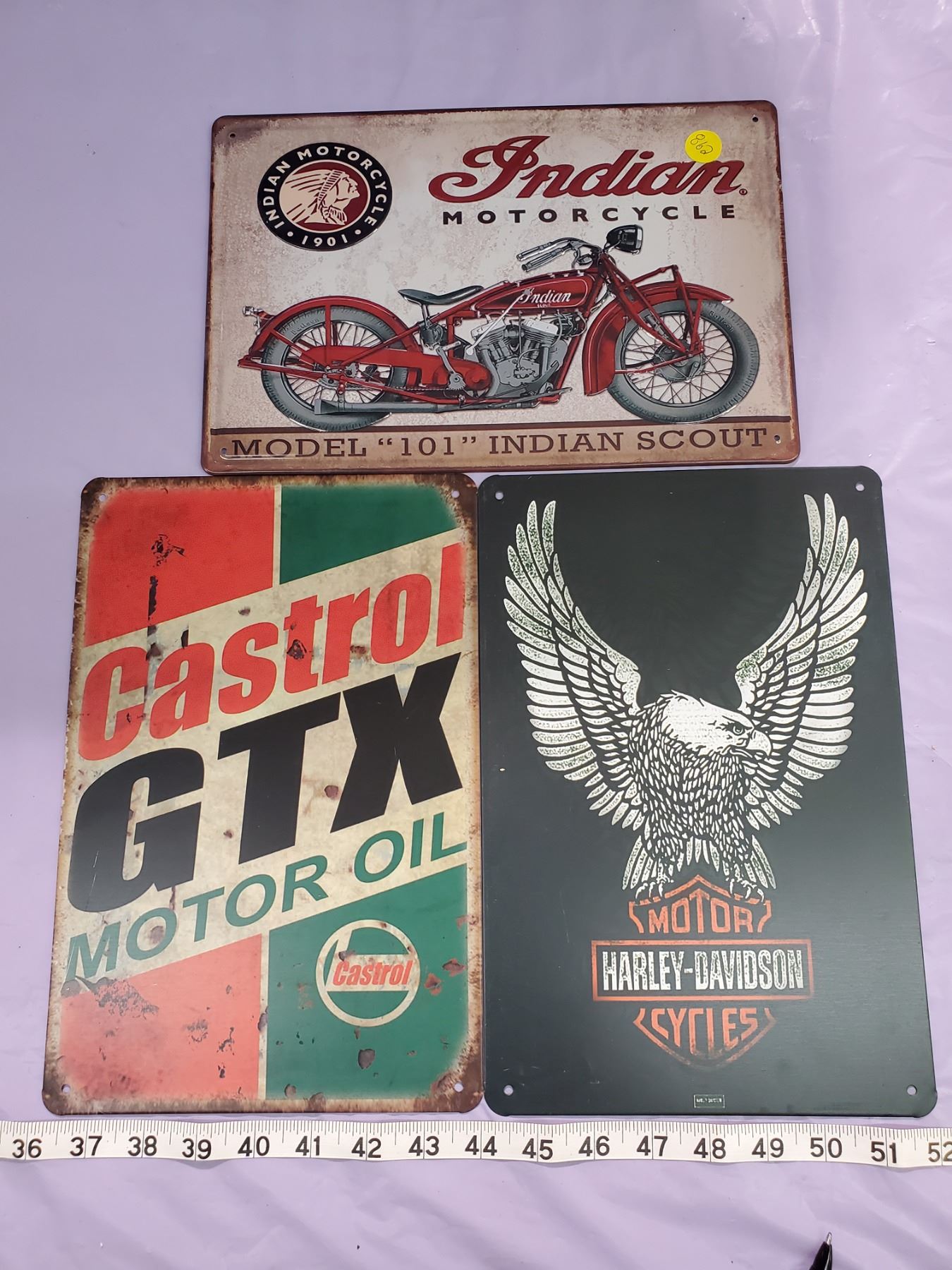 Indian motorcycle, Castrol GTX & Harley Davidson tin signs (repro)
