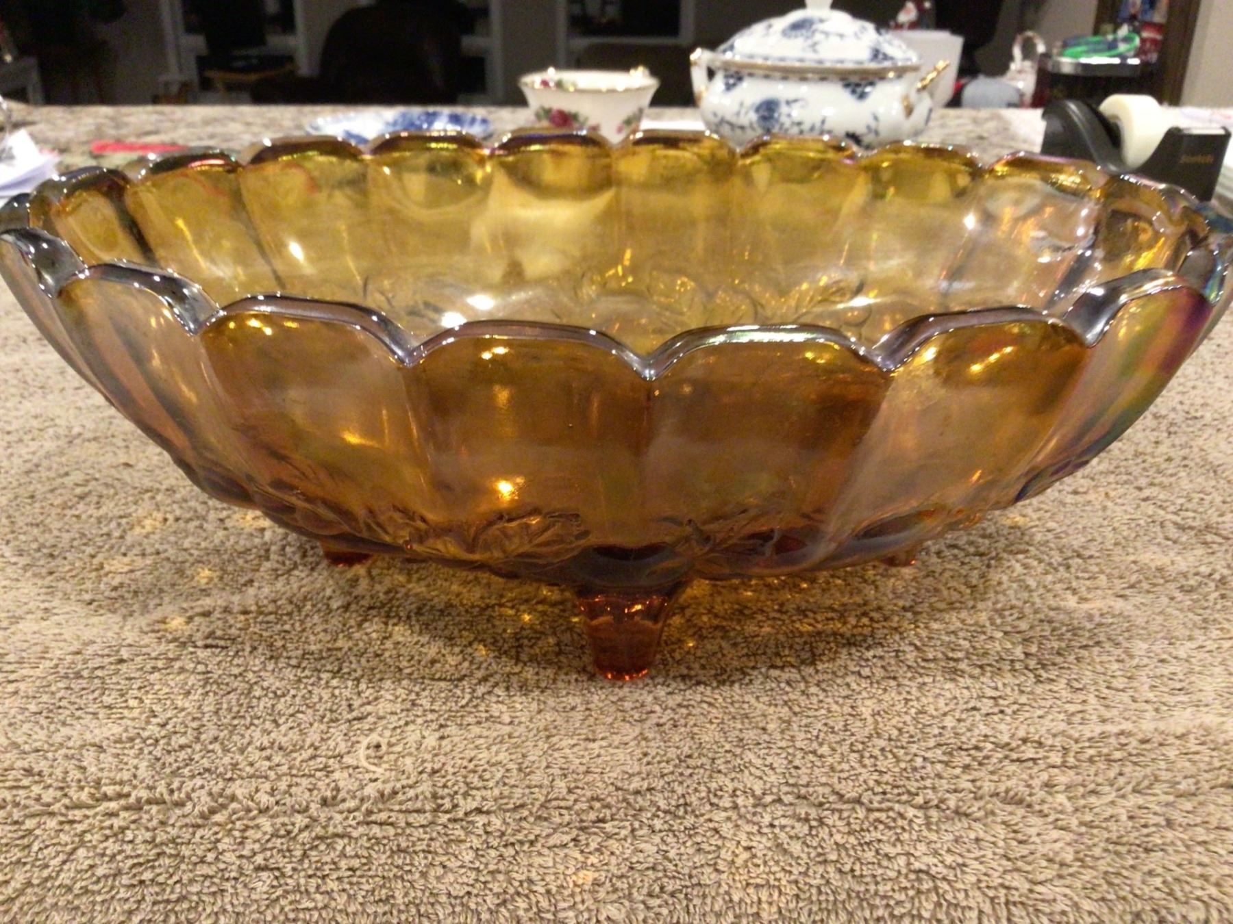 Indiana iridescent carnival glass footed fruit bowl. Oval harvest grape pattern. 12" vintage.