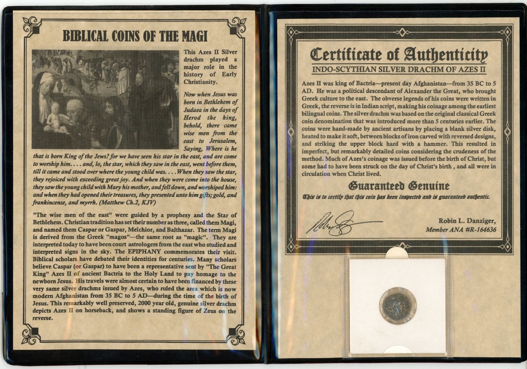 Indo-Scythian Silver Drachm of Azes II, King of Bactria from 35 BC to 5 AD. A descendant of Alexander the Great, he sent a representative (one of the 3 Wise Men of the East) to follow the Star of Bethlehem. Silver coin depicts the king on horseback with Zeus on the other side. Housed in a folder with much information plus certificate of authenticity.