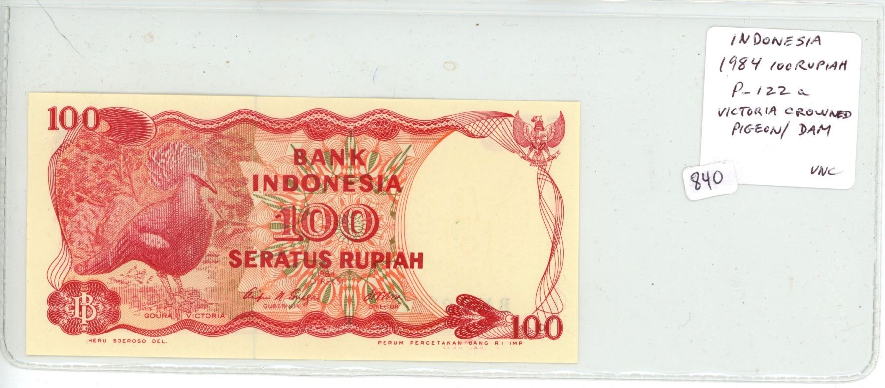 Indonesia. 1984 100 Rupiah. Victoria Crowned Pigeon/Dam. P-122a. Unc.