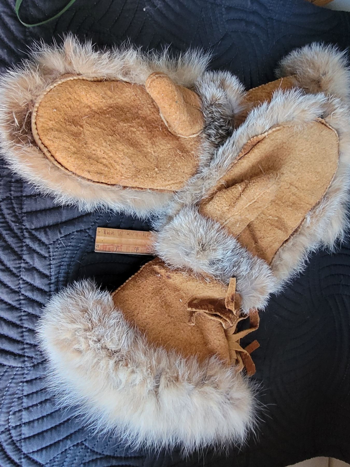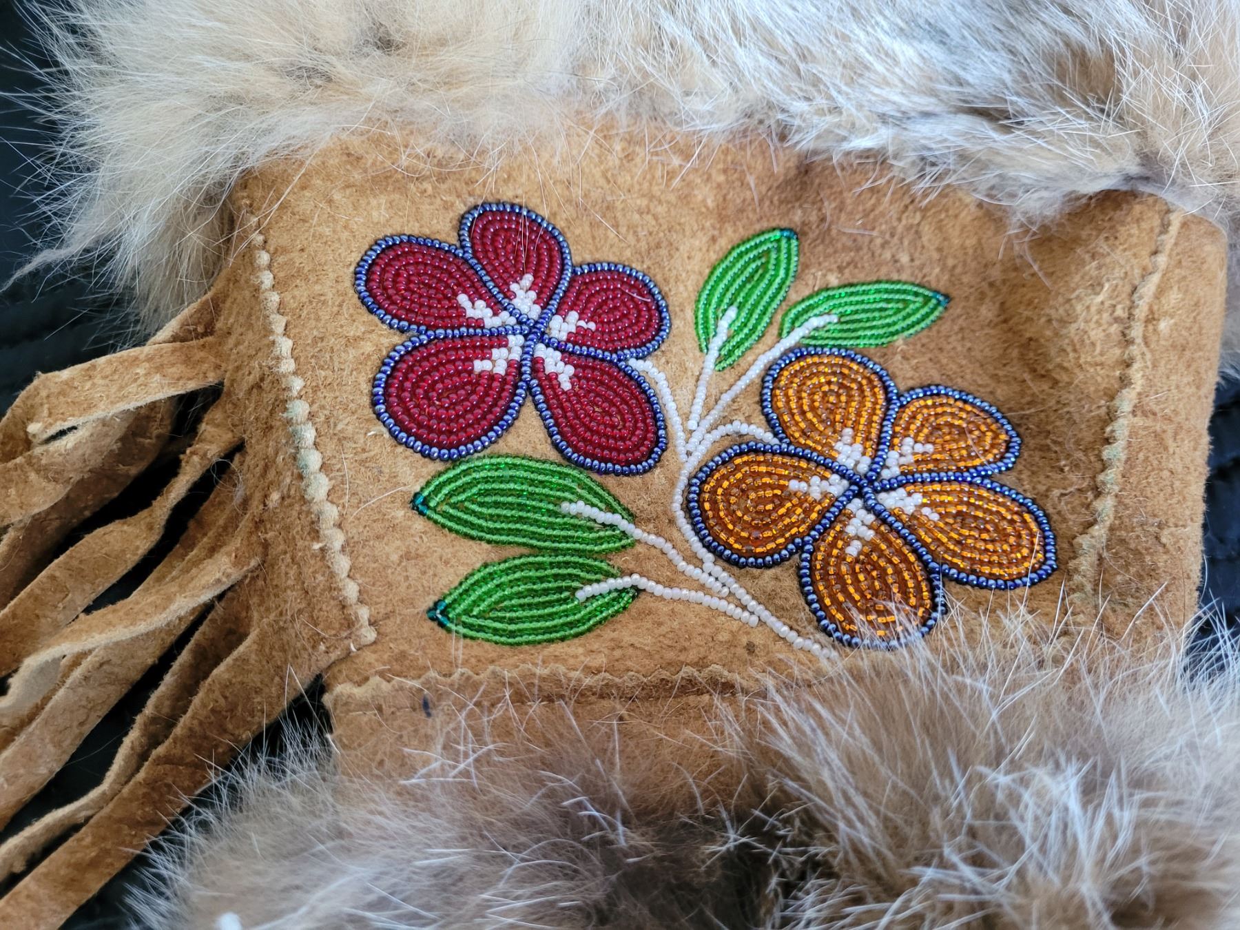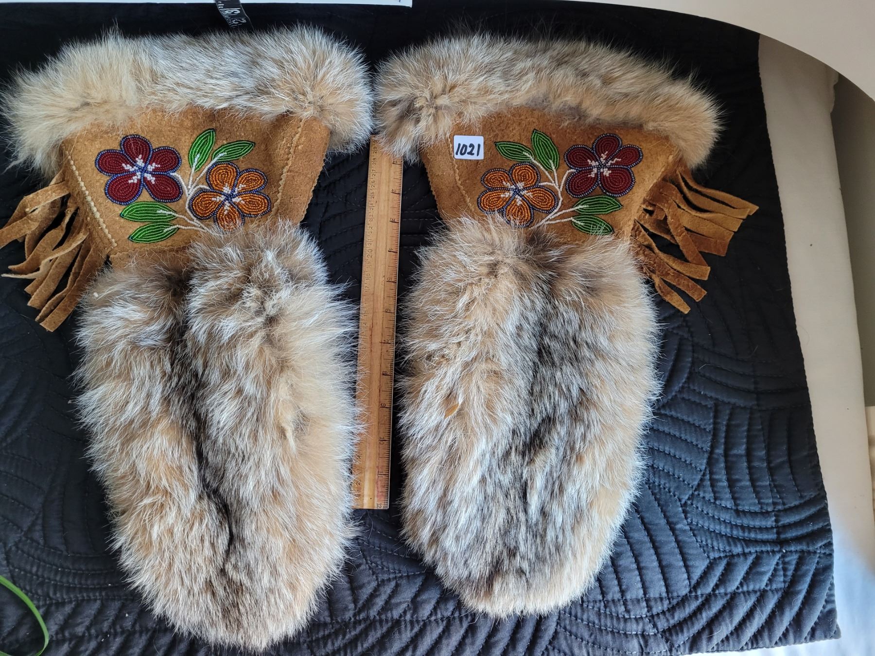 Inuit Lg. Handmade, moose hide & beaded Mitts. Believe fur to be Badger. Never worn.