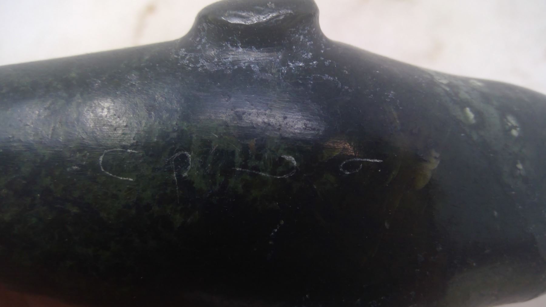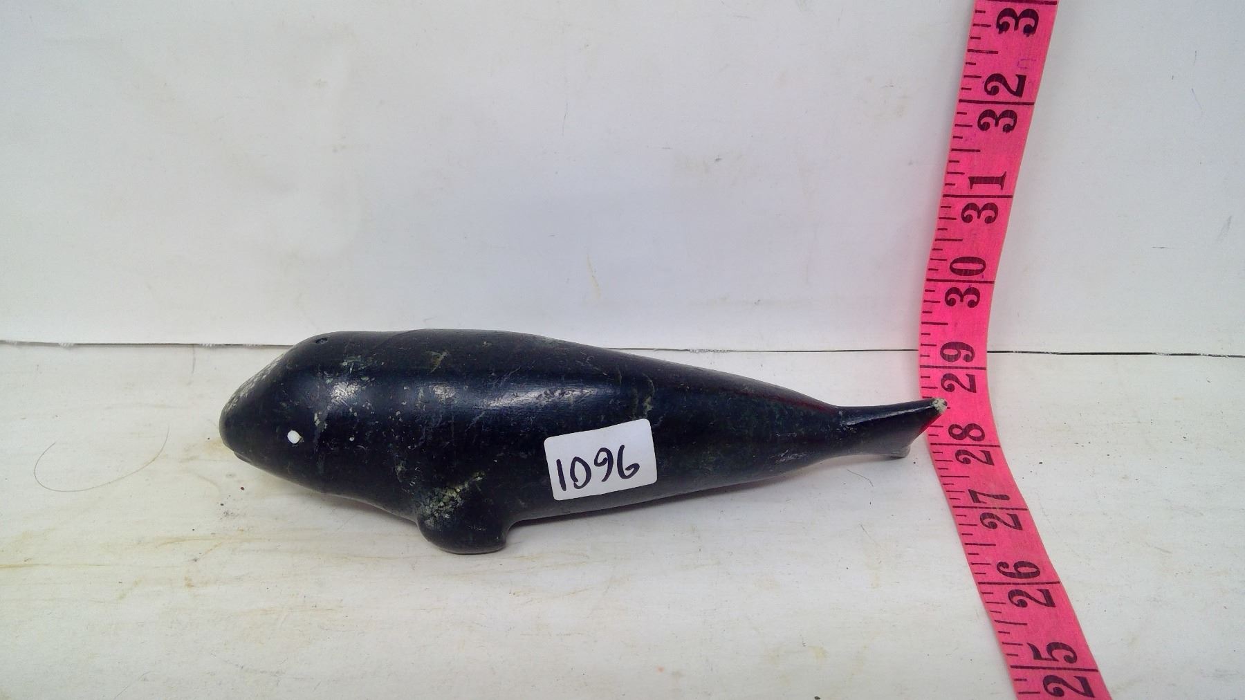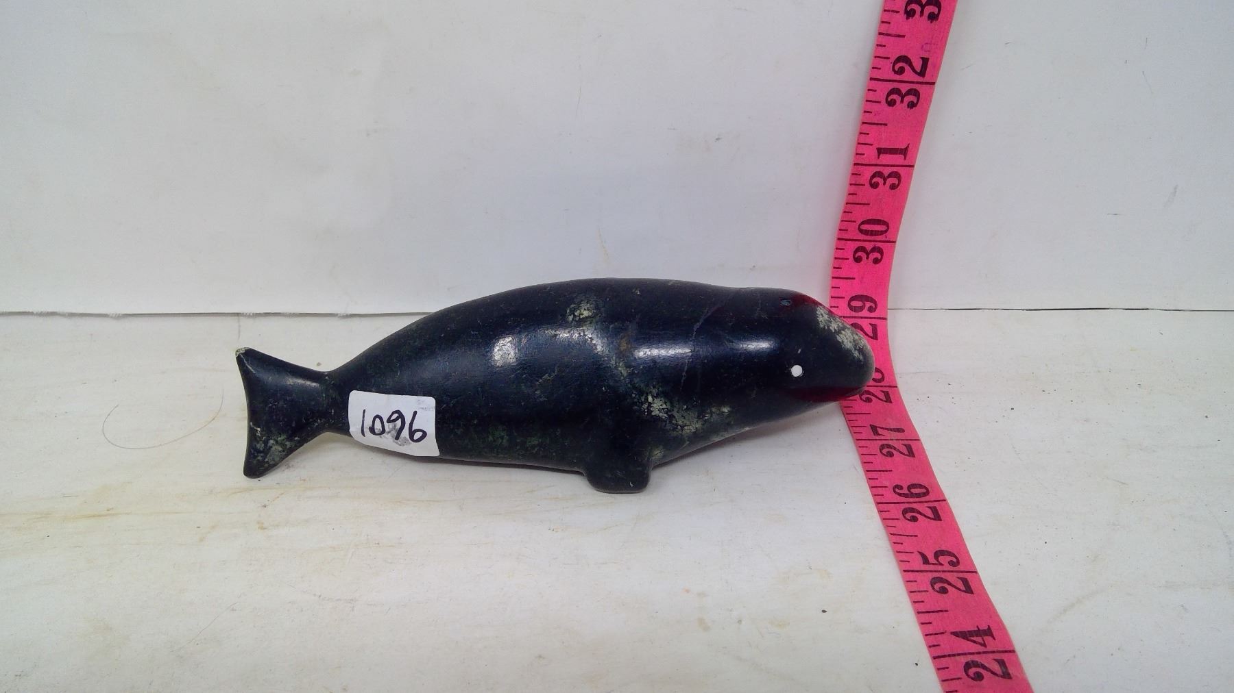 Inuit stone sculpture of whale. Length: 7". Width and height both :2 1/2". Insert bone eyes and drilled whale breathing blowhole to the top of the head. Not soft soapstone. Hard, heavy, dense pyroxene/serpentine stone. Artist signature in Inuit alphabet under base.