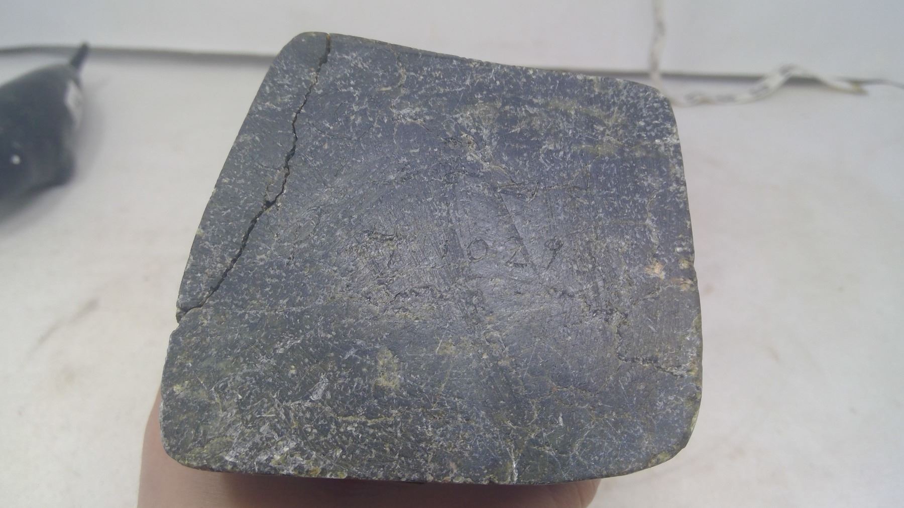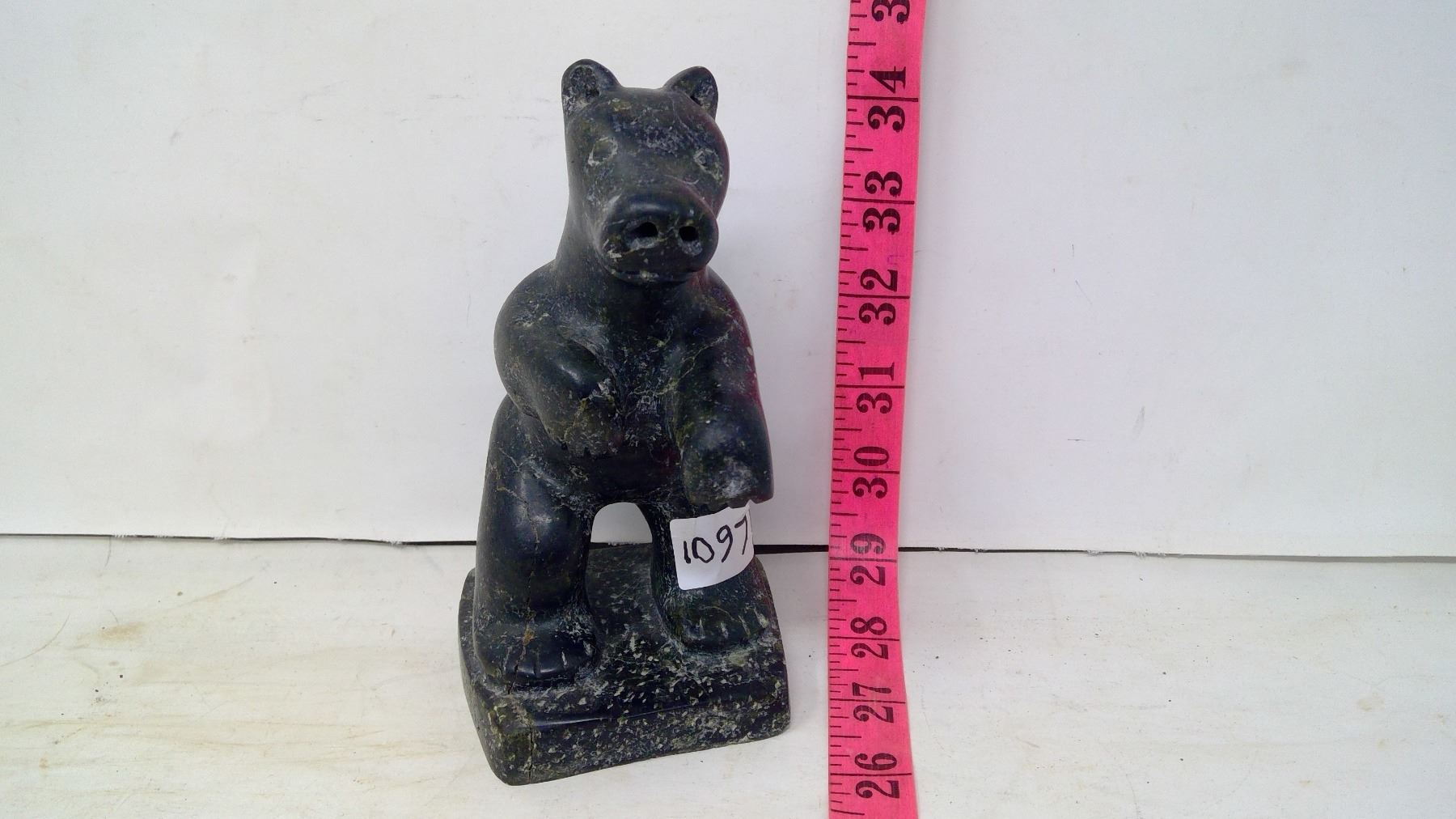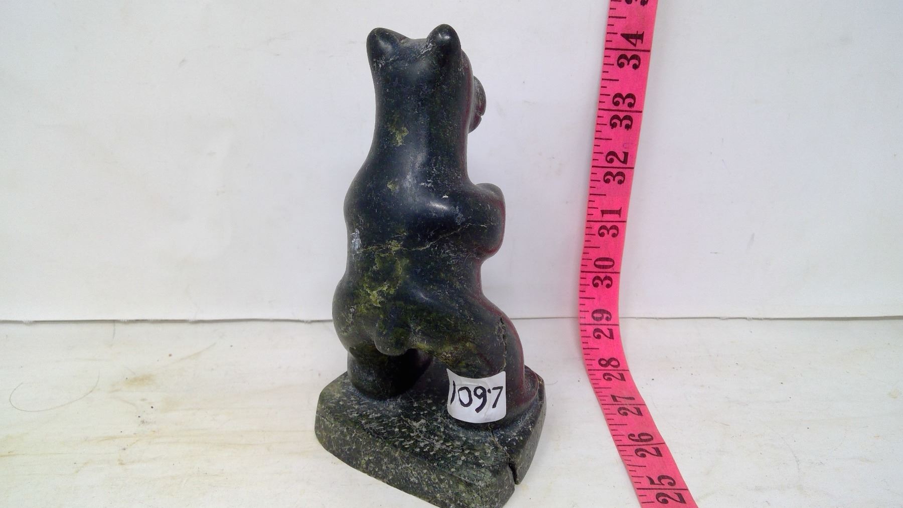 Inuit stone sculpture of standing bear. Height 6". Width: 3". Thickness: 3 3/4". Not soft soapstone, Heavy hard, dense pyroxene/serpentine stone that is a nice translucent jade green on the bear's butt.