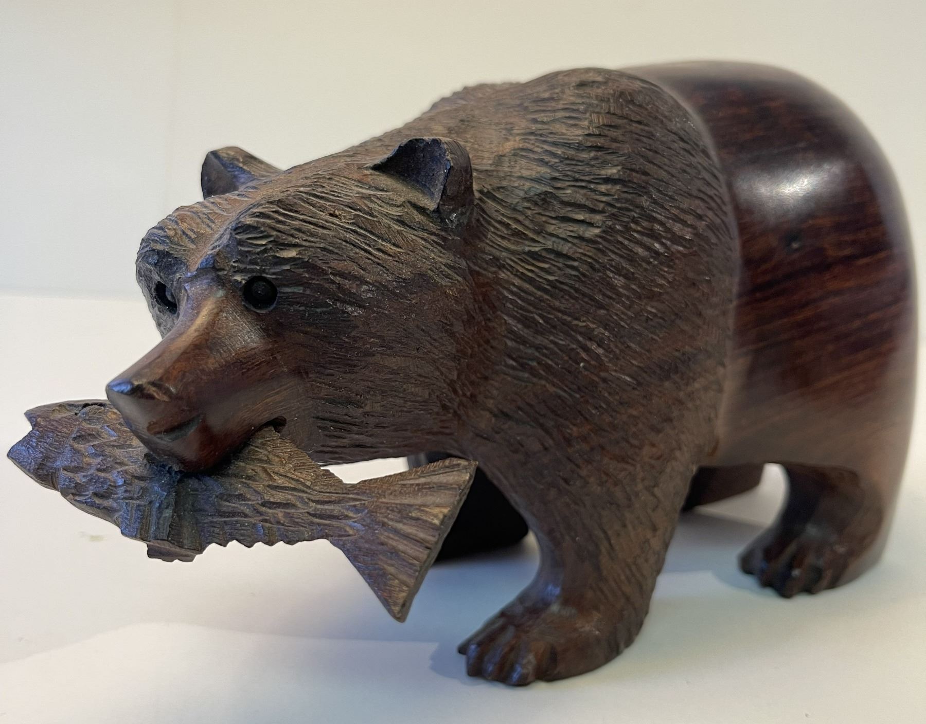 Ironwood Grizzly Bear with Salmon, hand-carved