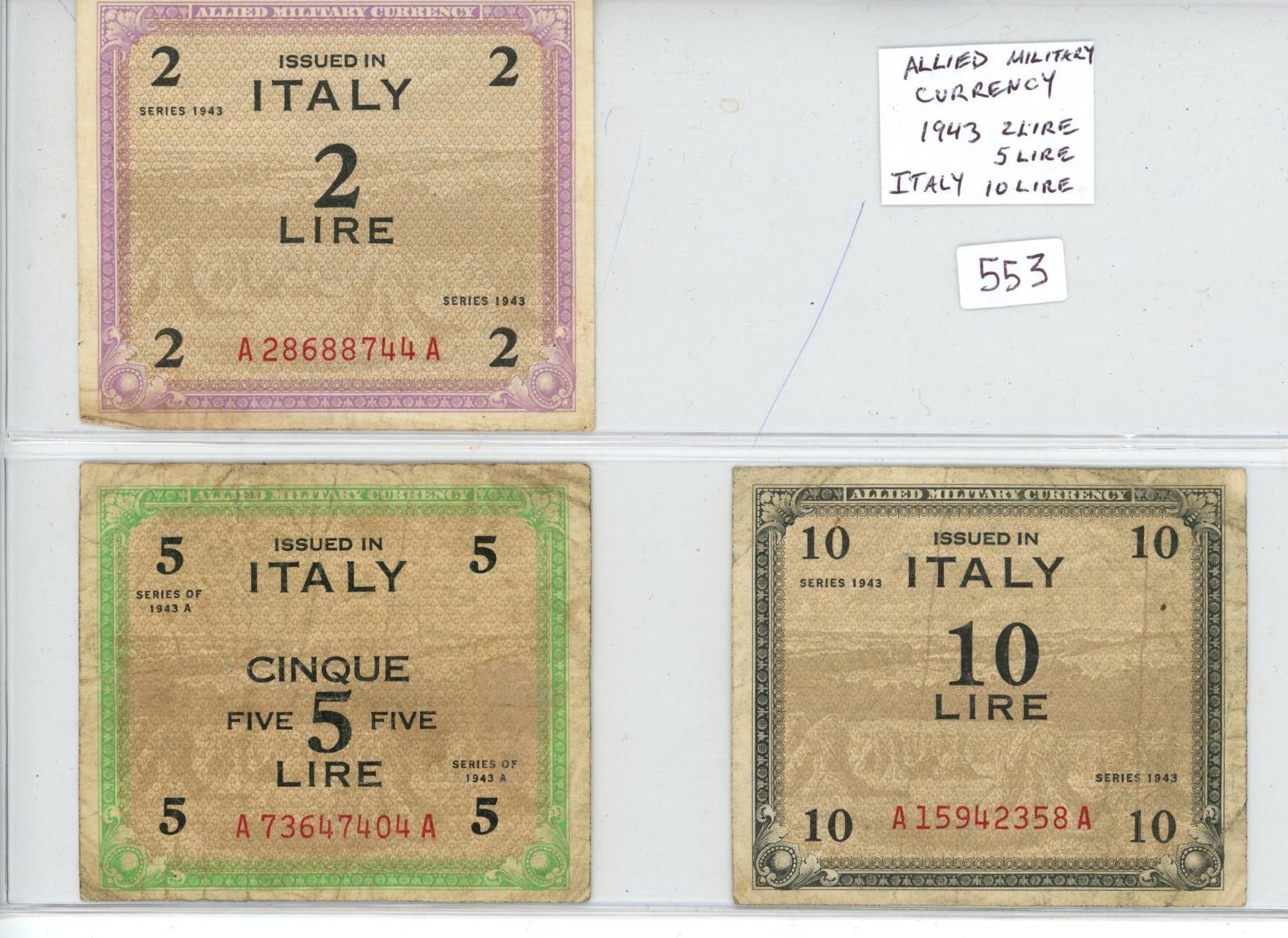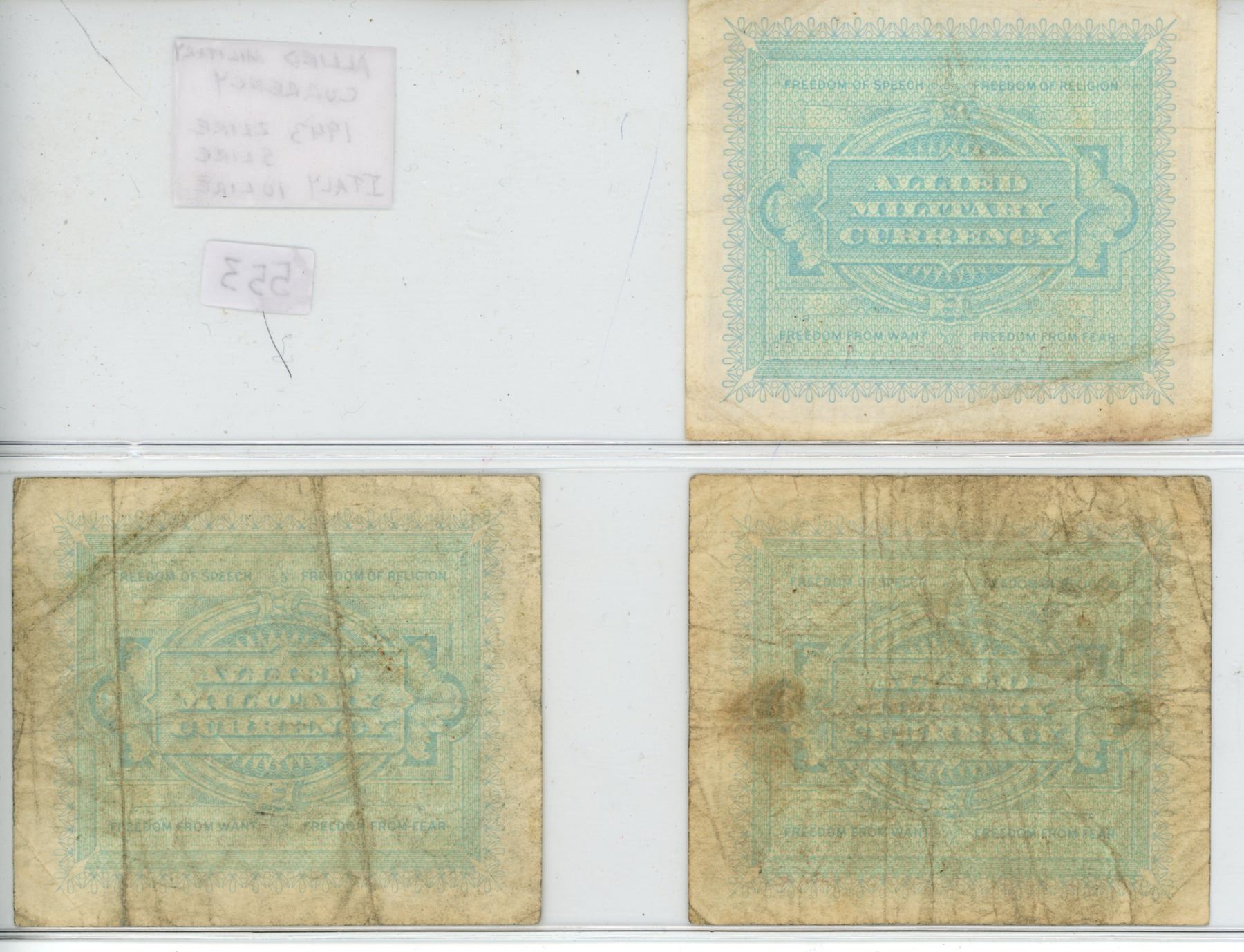 Italy. Allied Military Currency. Lot of 3 notes. Dated 1943, they include 2 Lire, 5 Lire & 10 Lire.
