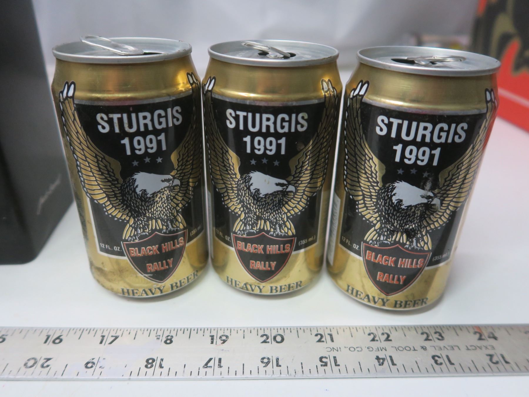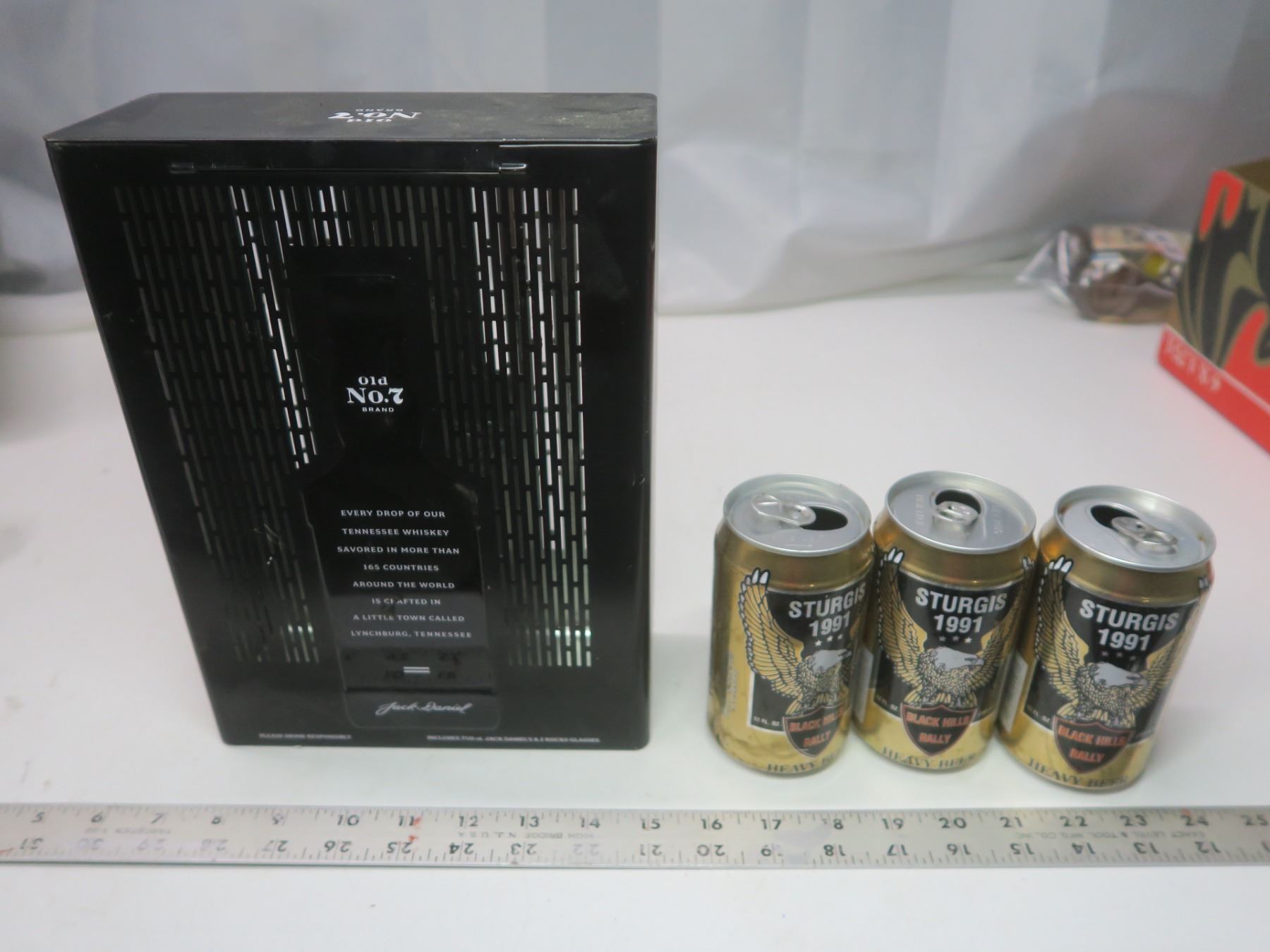 Jack Daniels tin and 3 Sturgis 1991 beer cans