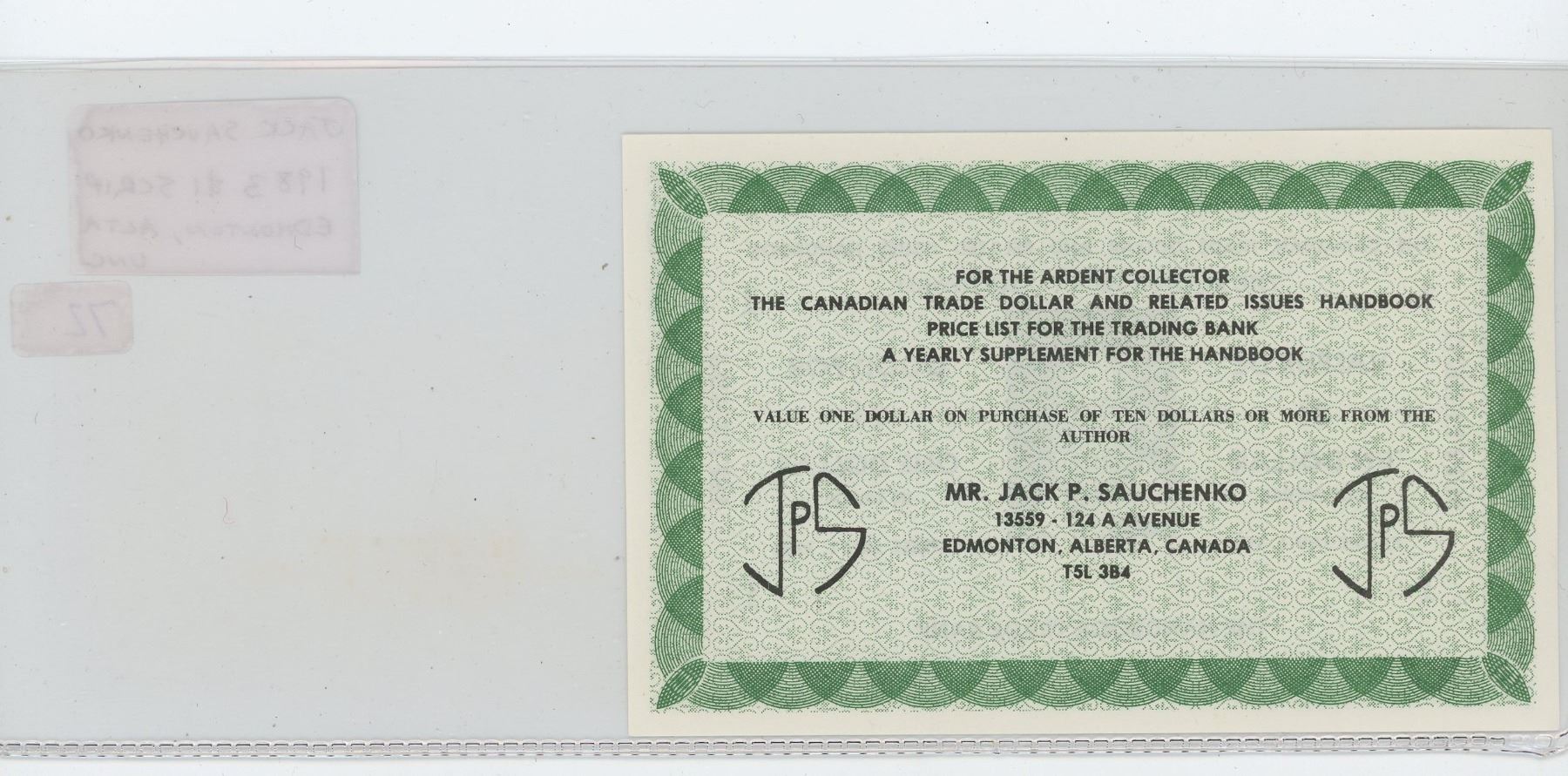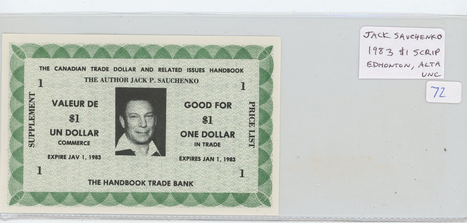 Jack Sauchenko 1983 $1 Scrip. This scrip is from the Edmonton author of several Trade Dollar handbooks.