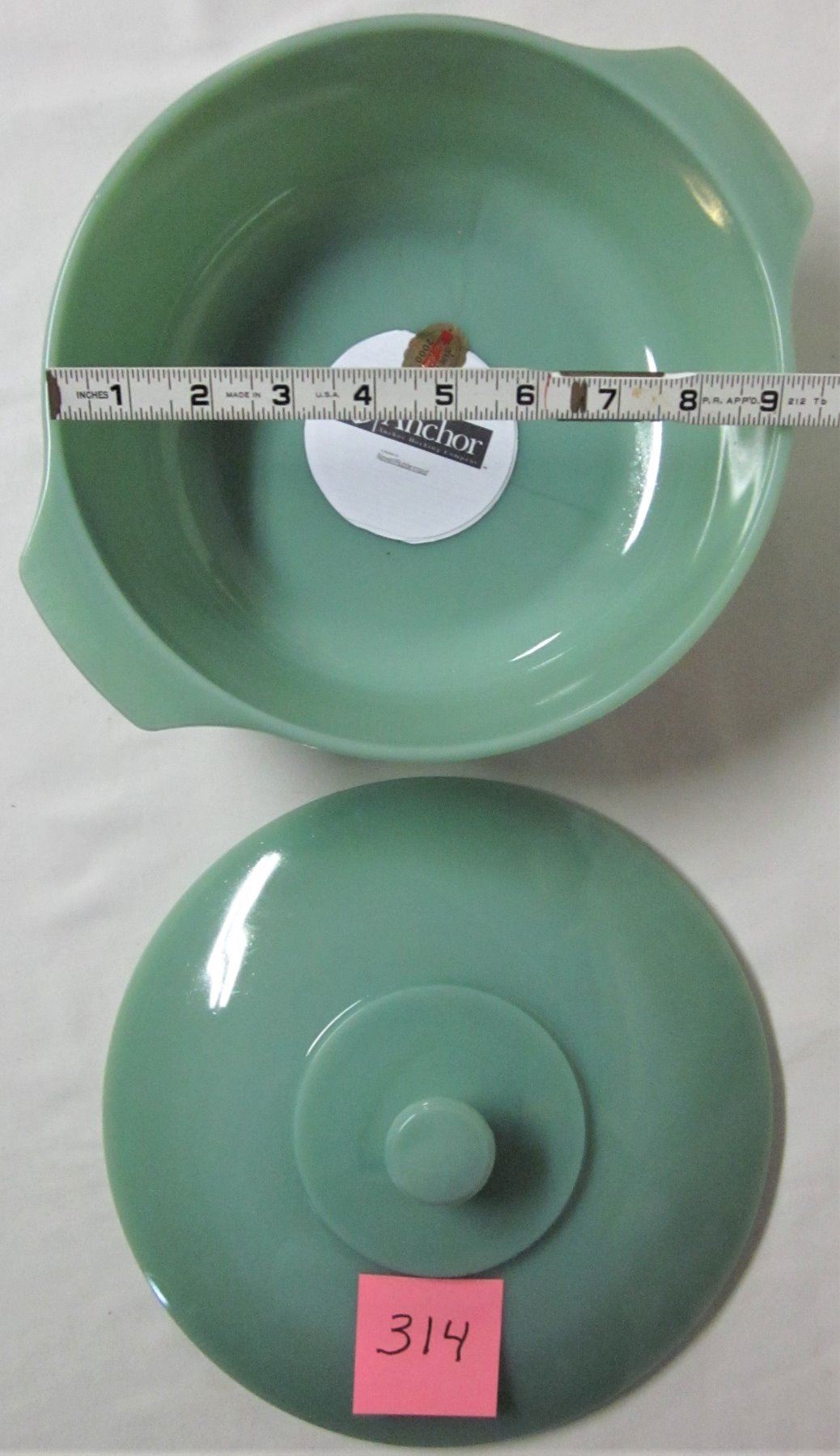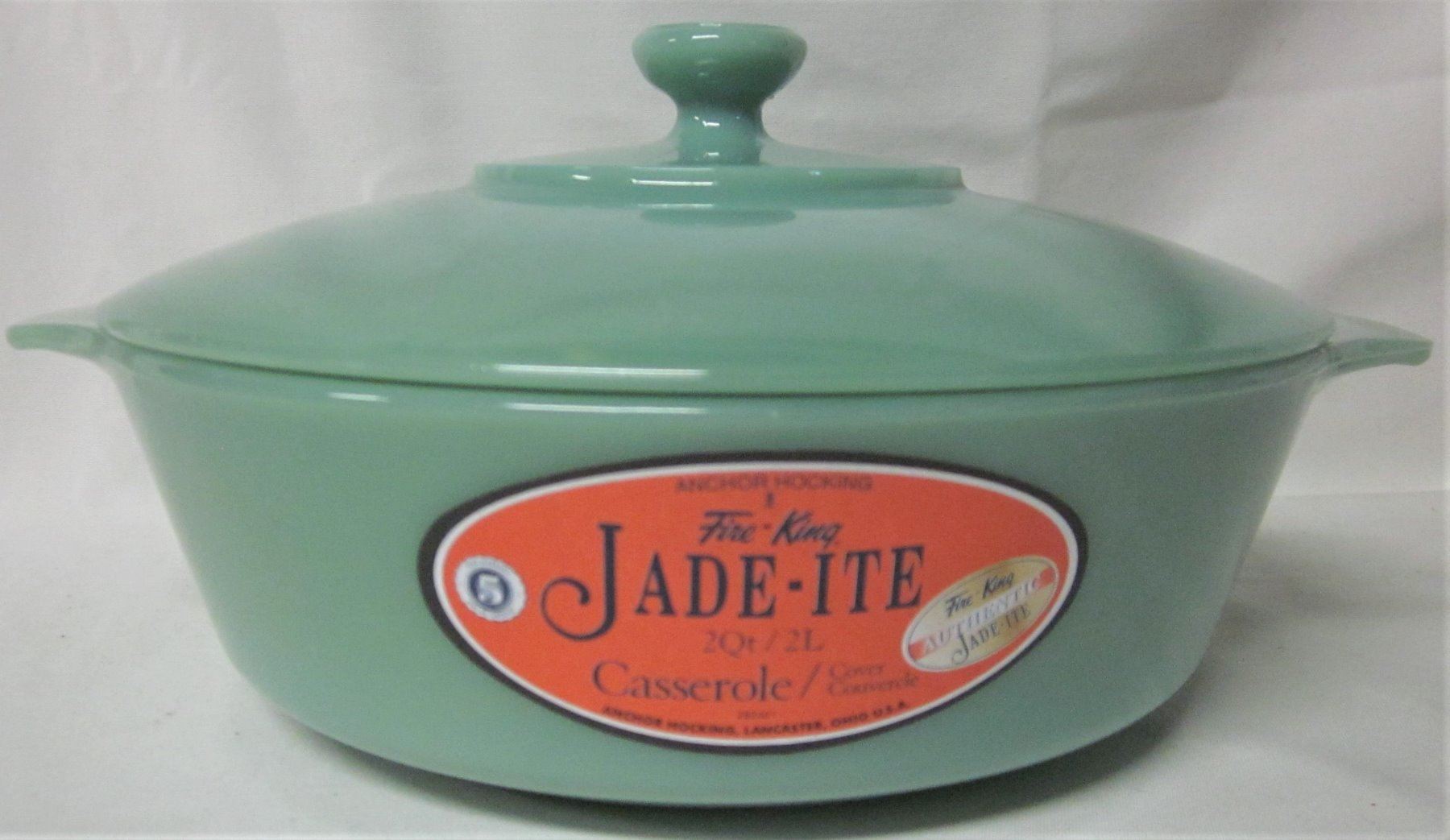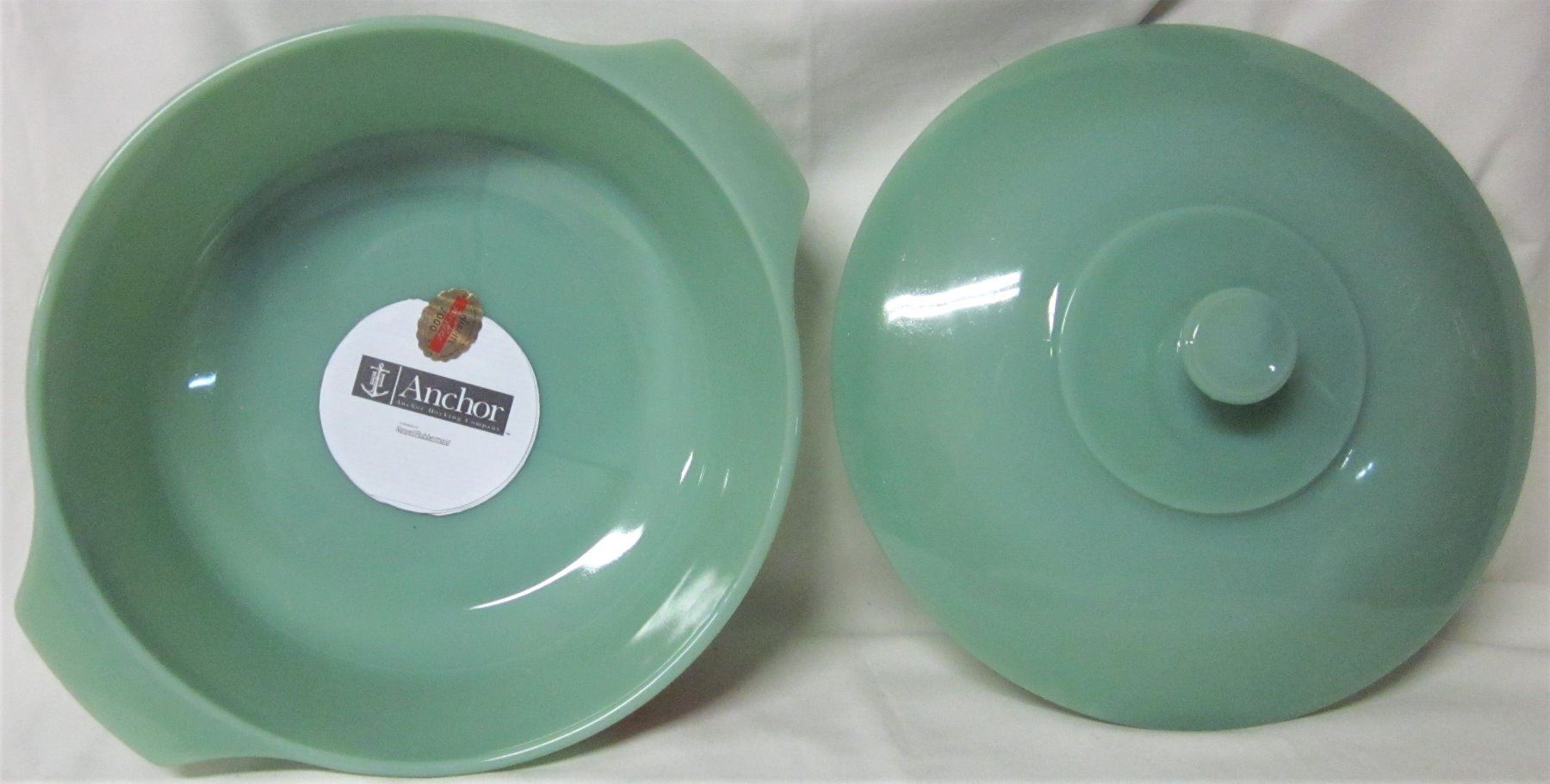 Jadite Fire King 2000 covered casserole / stickers NEW