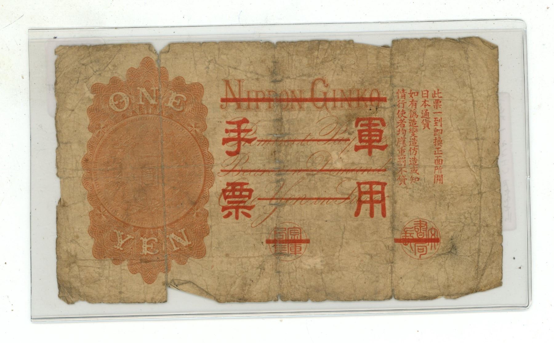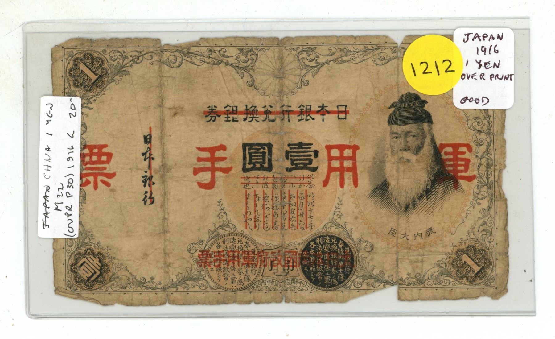 Japan. 1916 1 Yen. Overprinted note. Good with pieces missing.