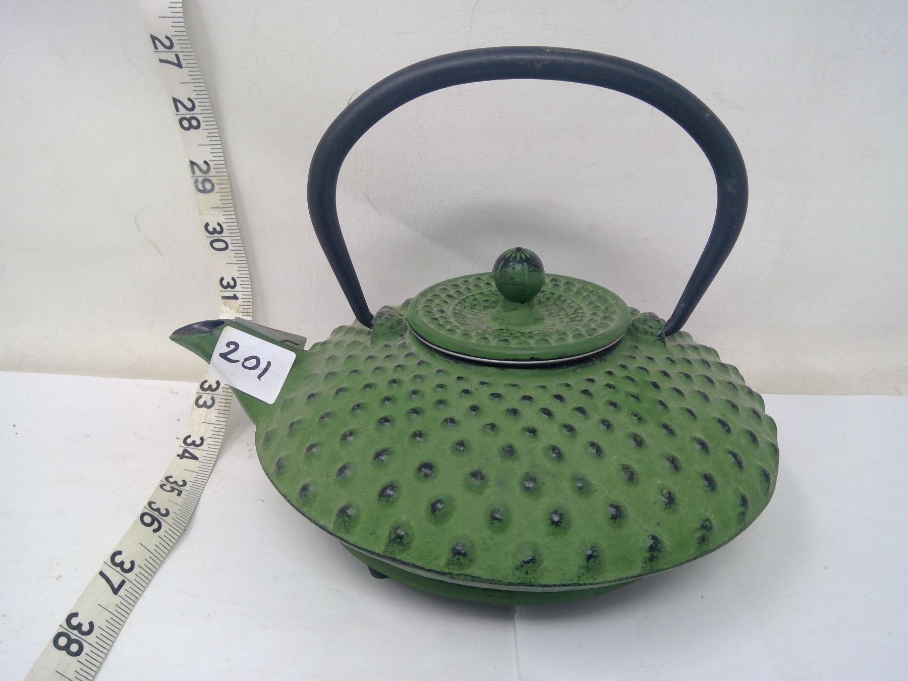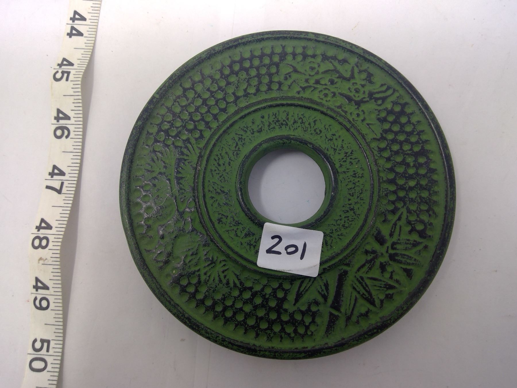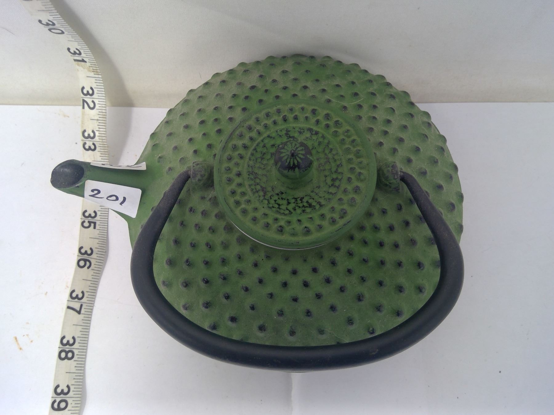 Japanese cast iron teapot. Telescoping starburst ancient design. Lacquer lined. 8” diameter.