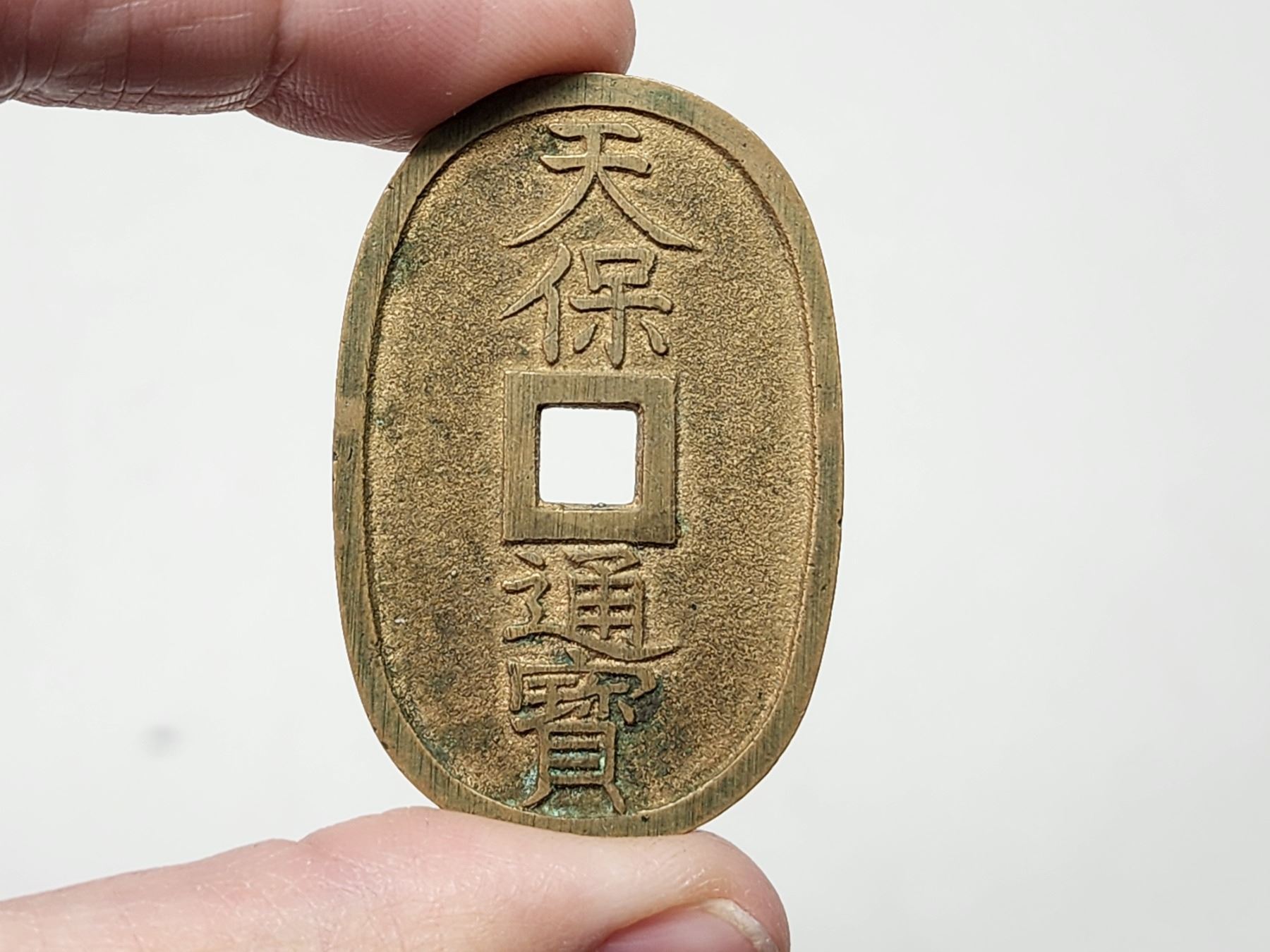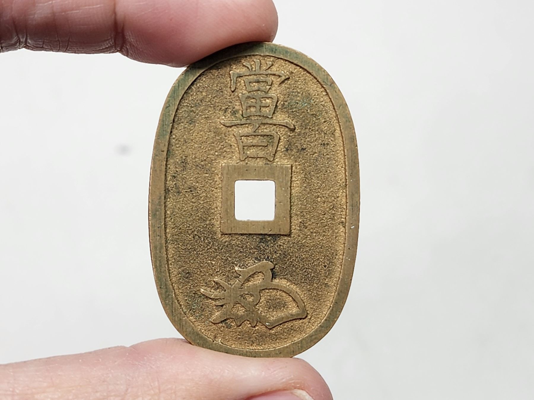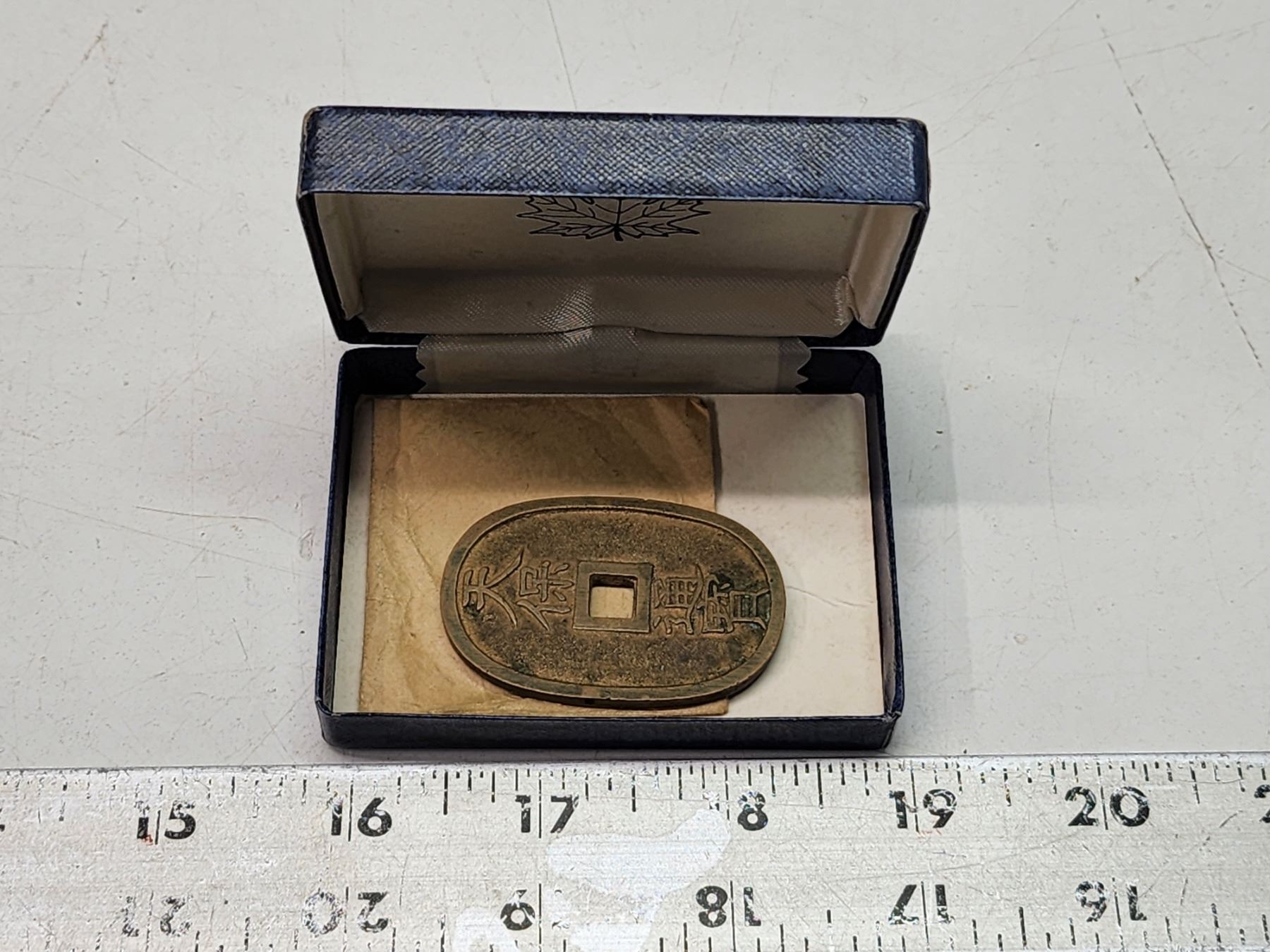 Japanese, bronze coin in blue box