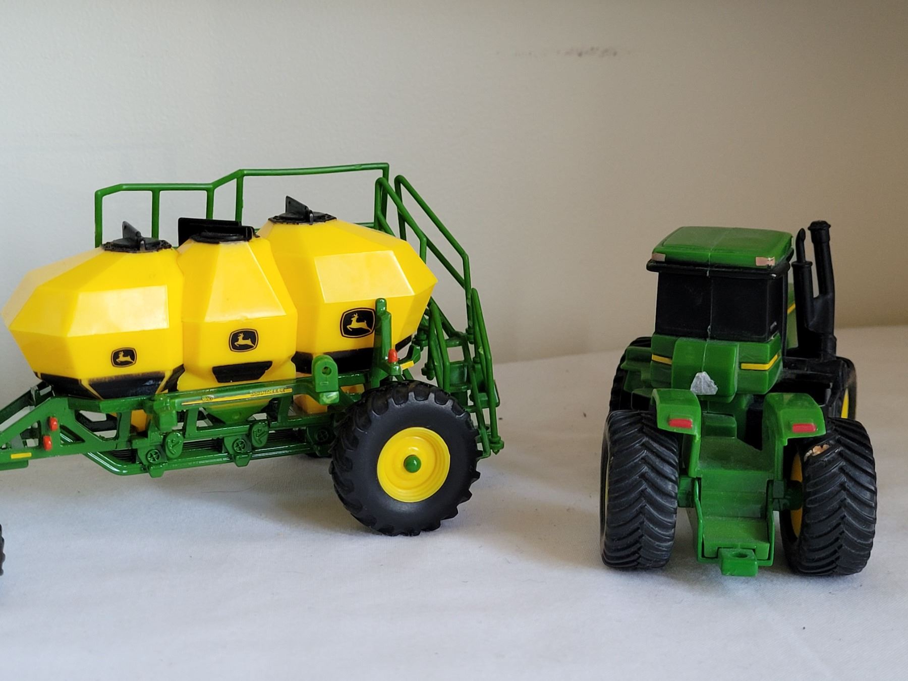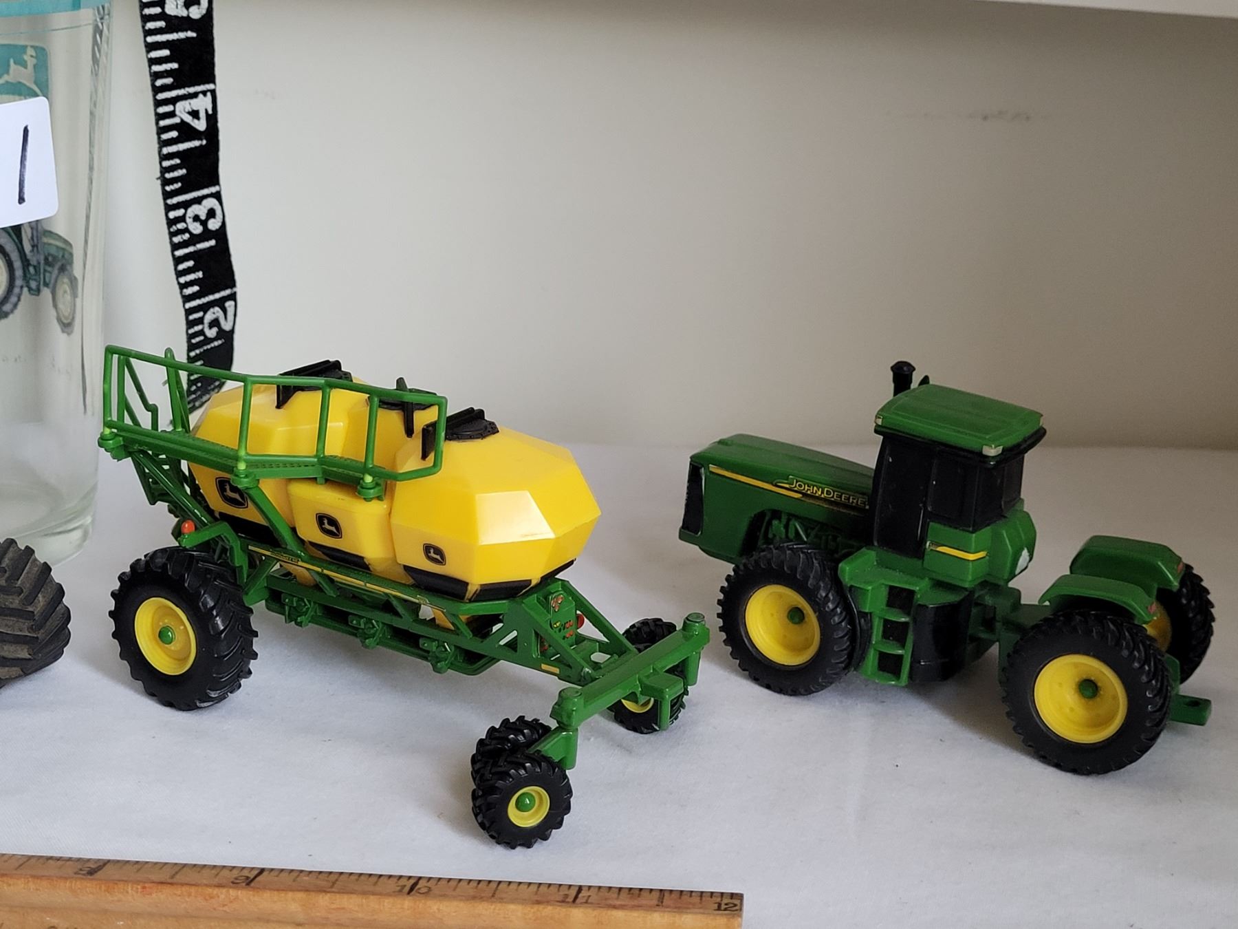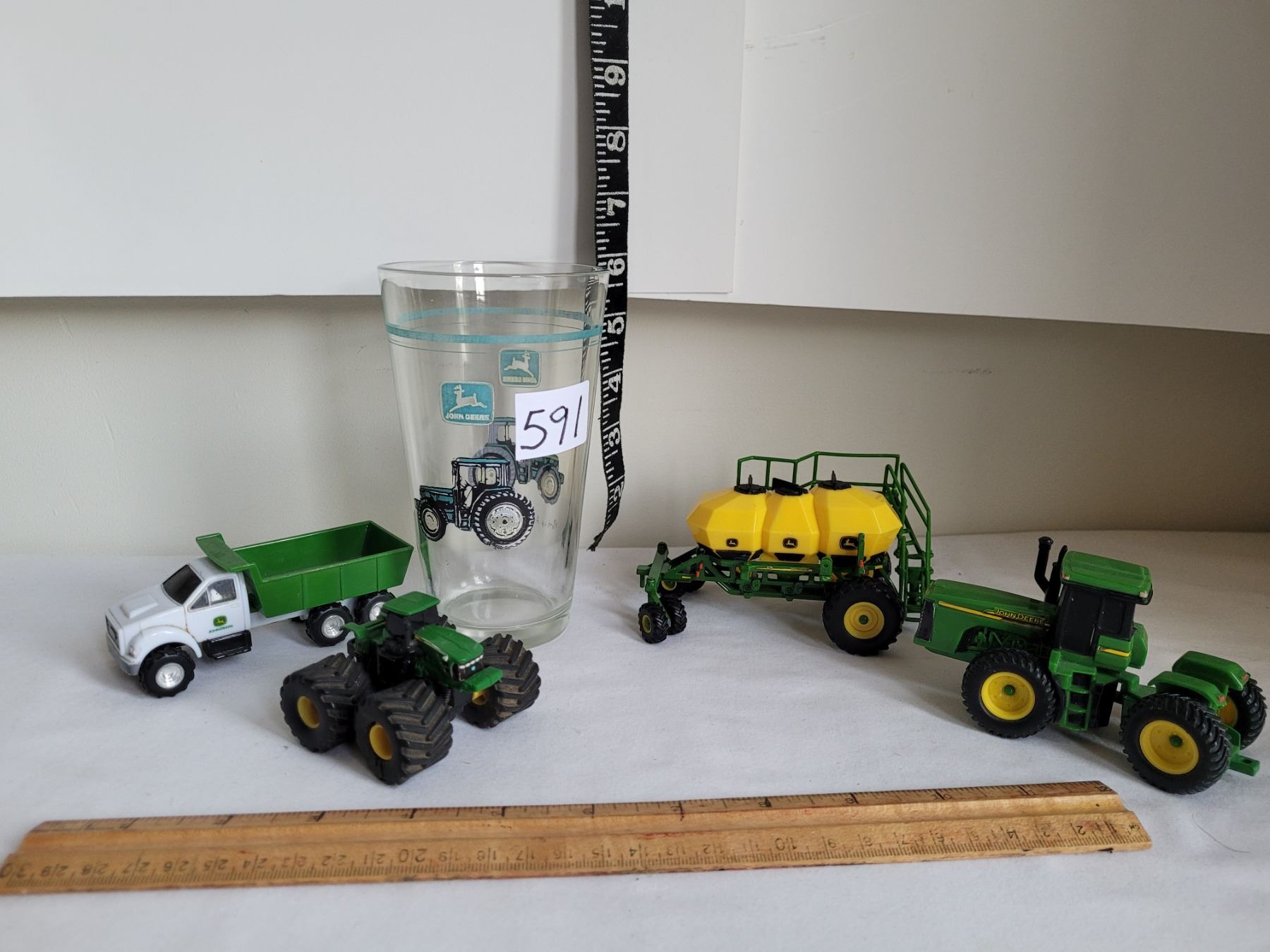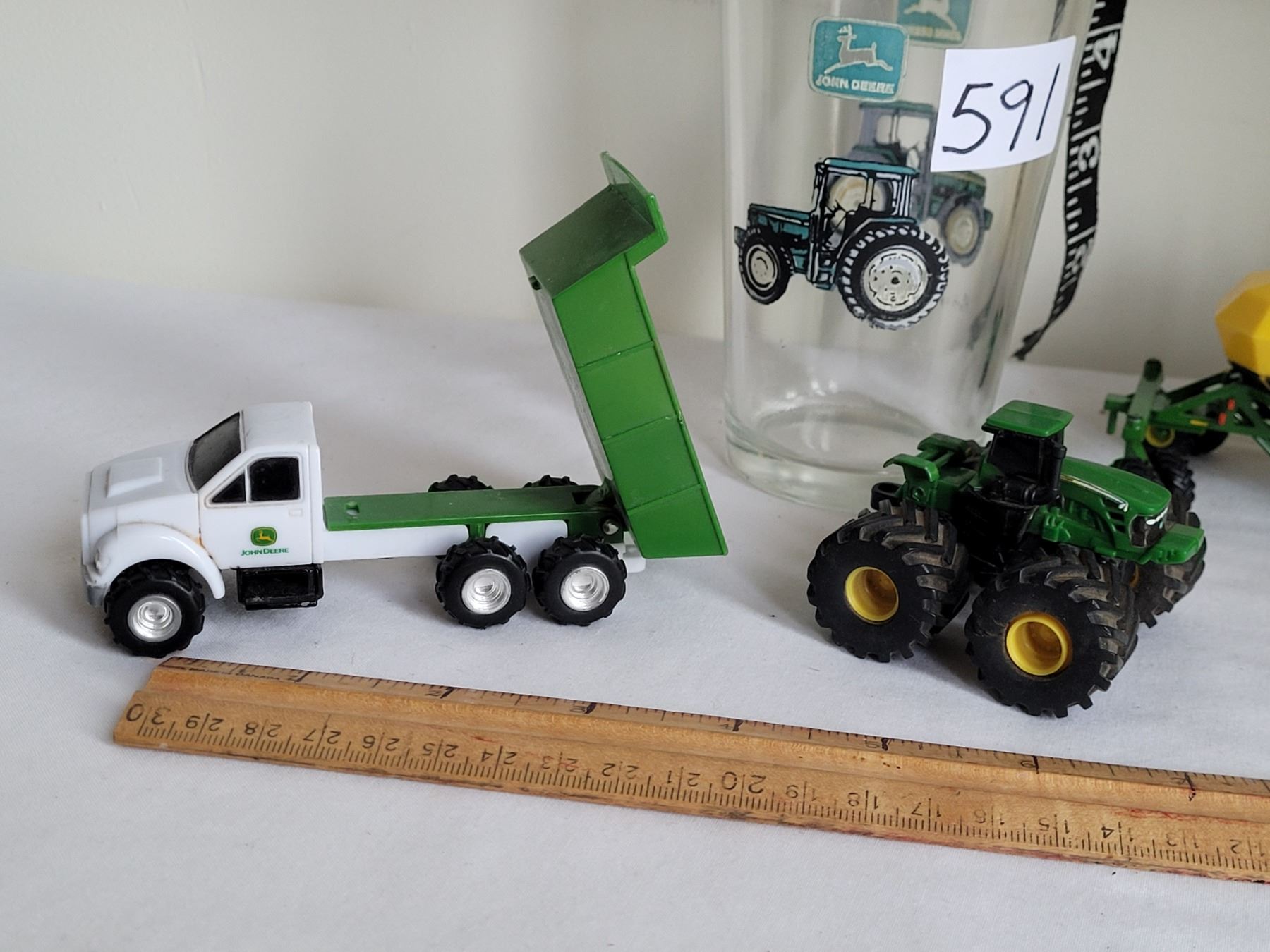 John Deere Die-cast toys and large drink glass.